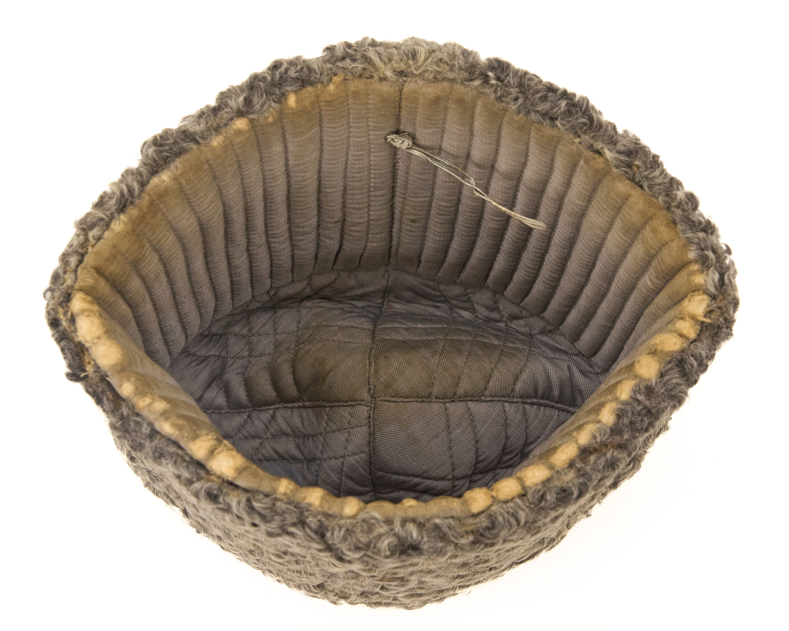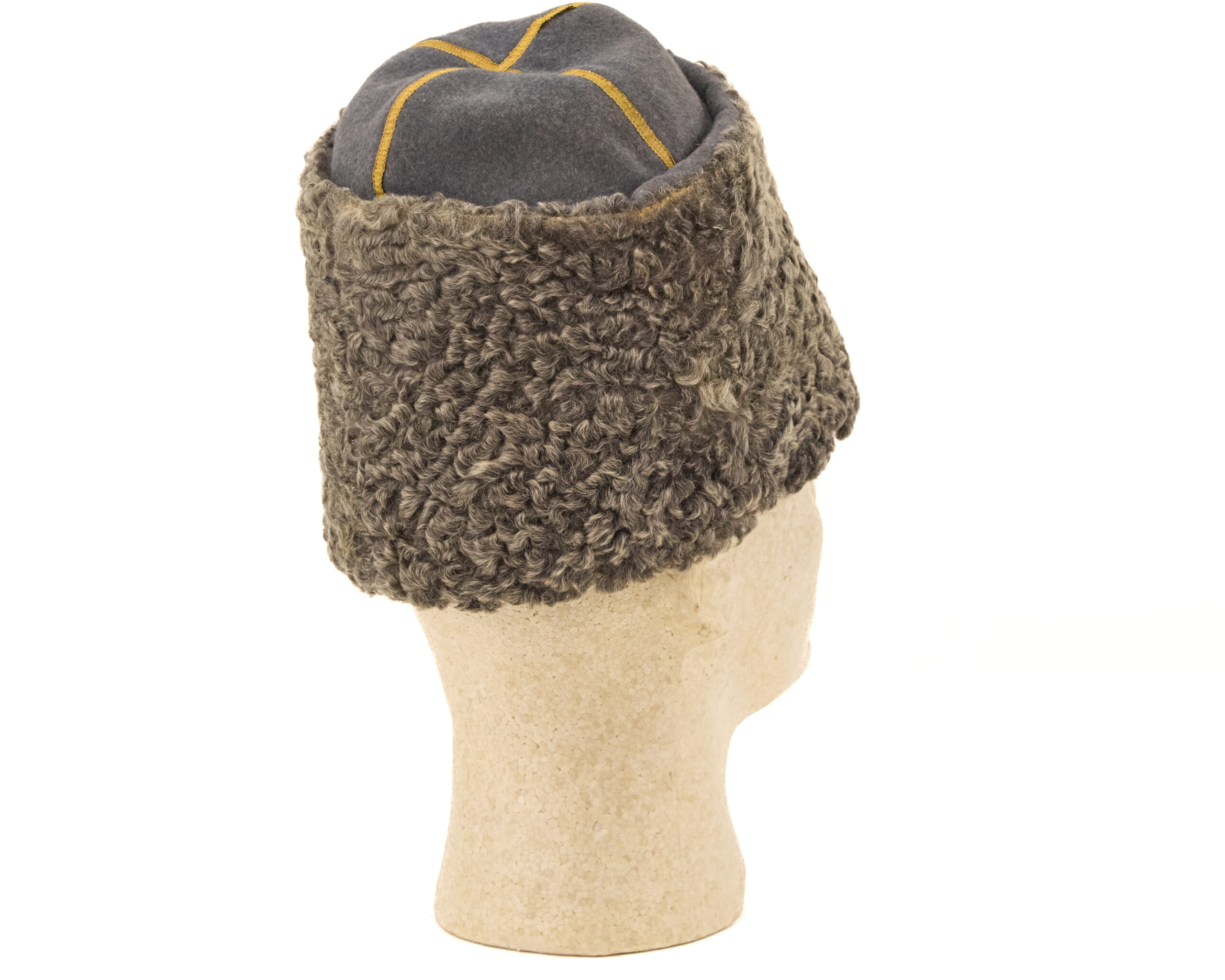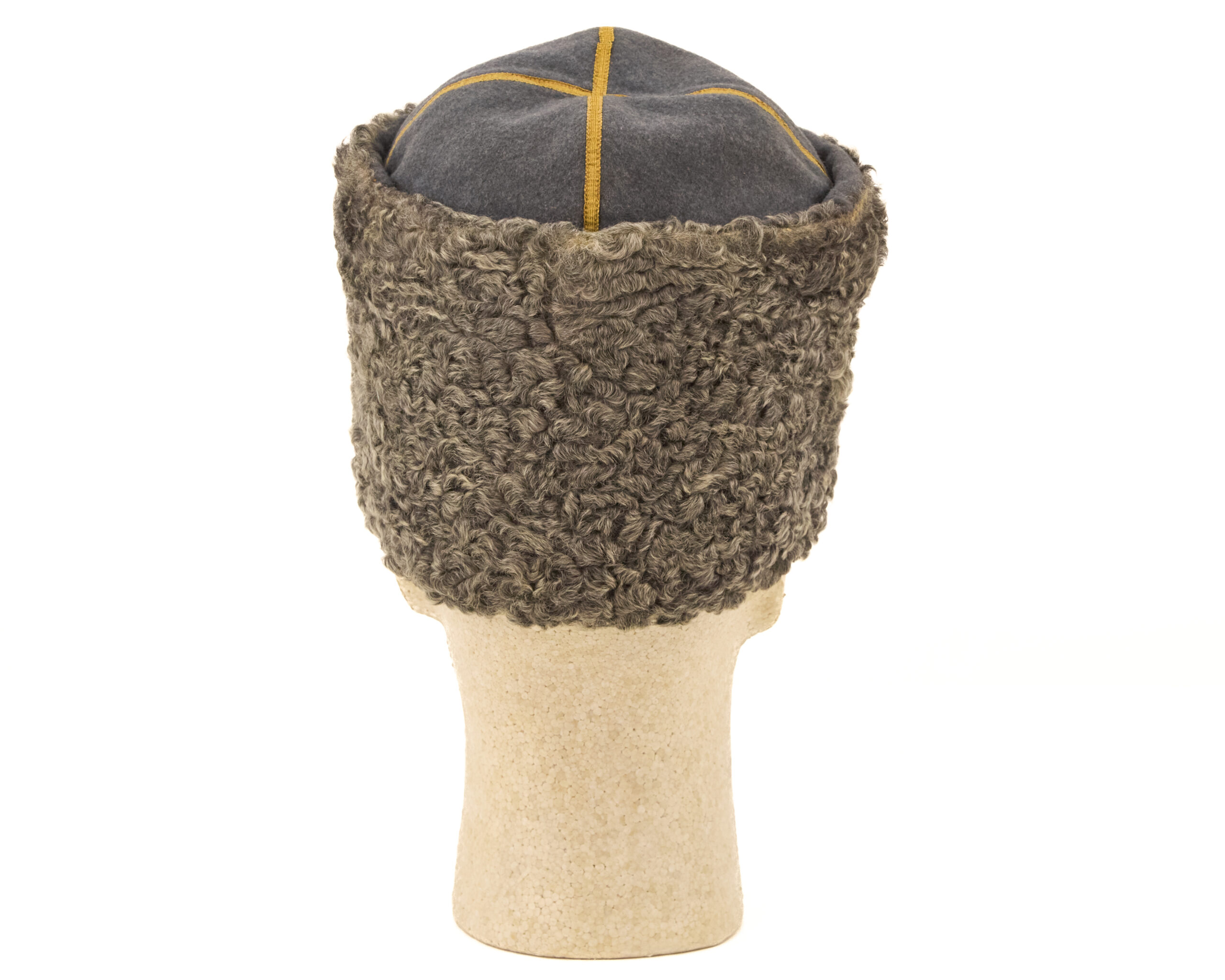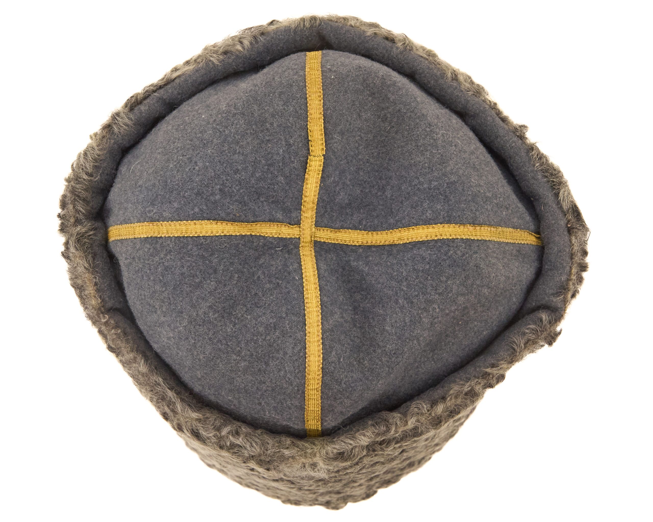 The body consists of black Astrakhan wool chosen for warmth, durability, and a formal military appearance. The materials remain correct to the pattern, and the overall structure stays clean and well shaped. In addition, the stitching remains tight and uniform throughout the cap.