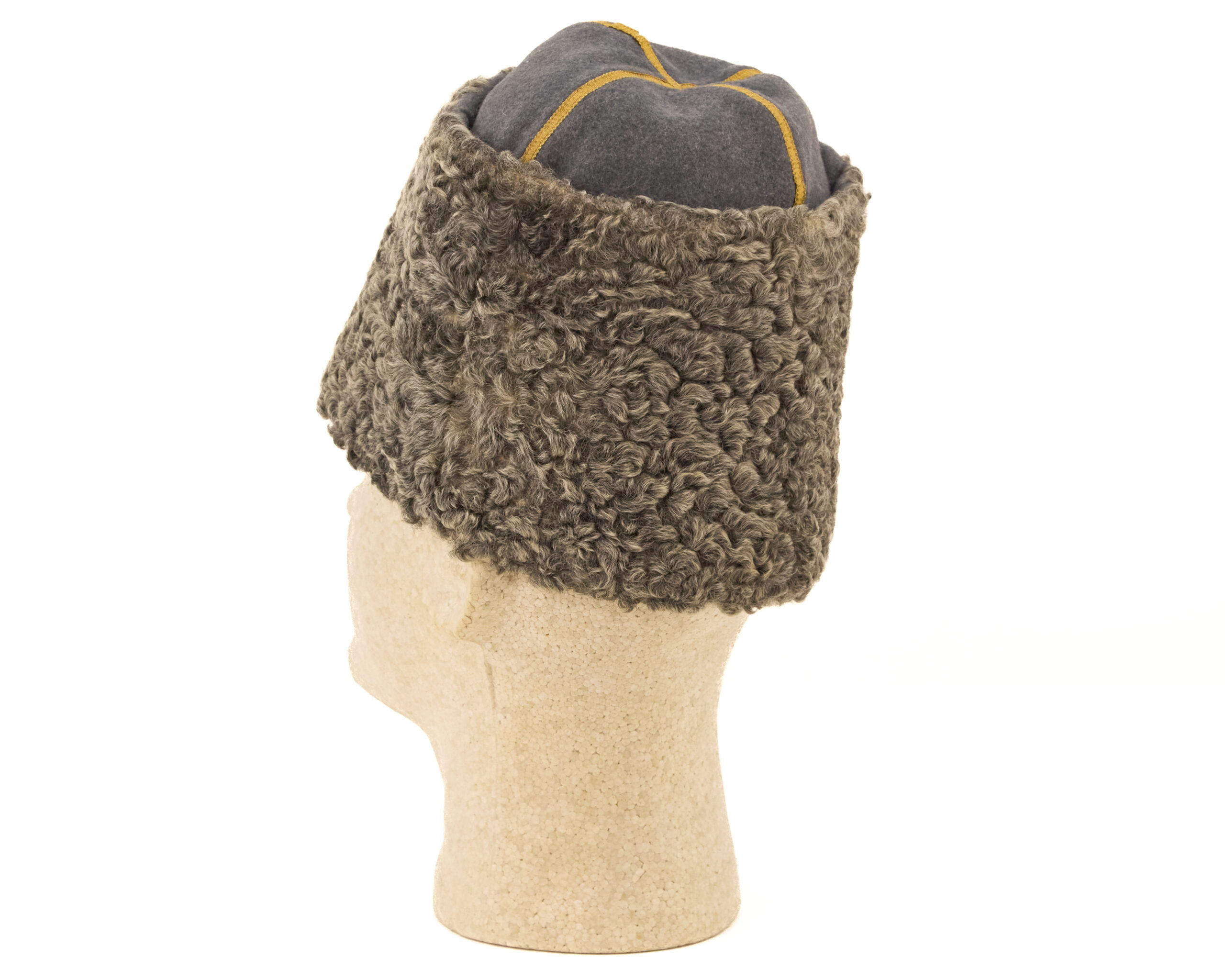 This example shows the classic officer-grade layout. The tall body uses dense black Astrakhan wool with the tight curl collectors expect on period pieces. The crown retains its blue-grey wool top, while the gold piping still shows strong color and definition. As a result, the cap presents well and keeps the sharp profile expected of a senior Soviet officer’s papakha.