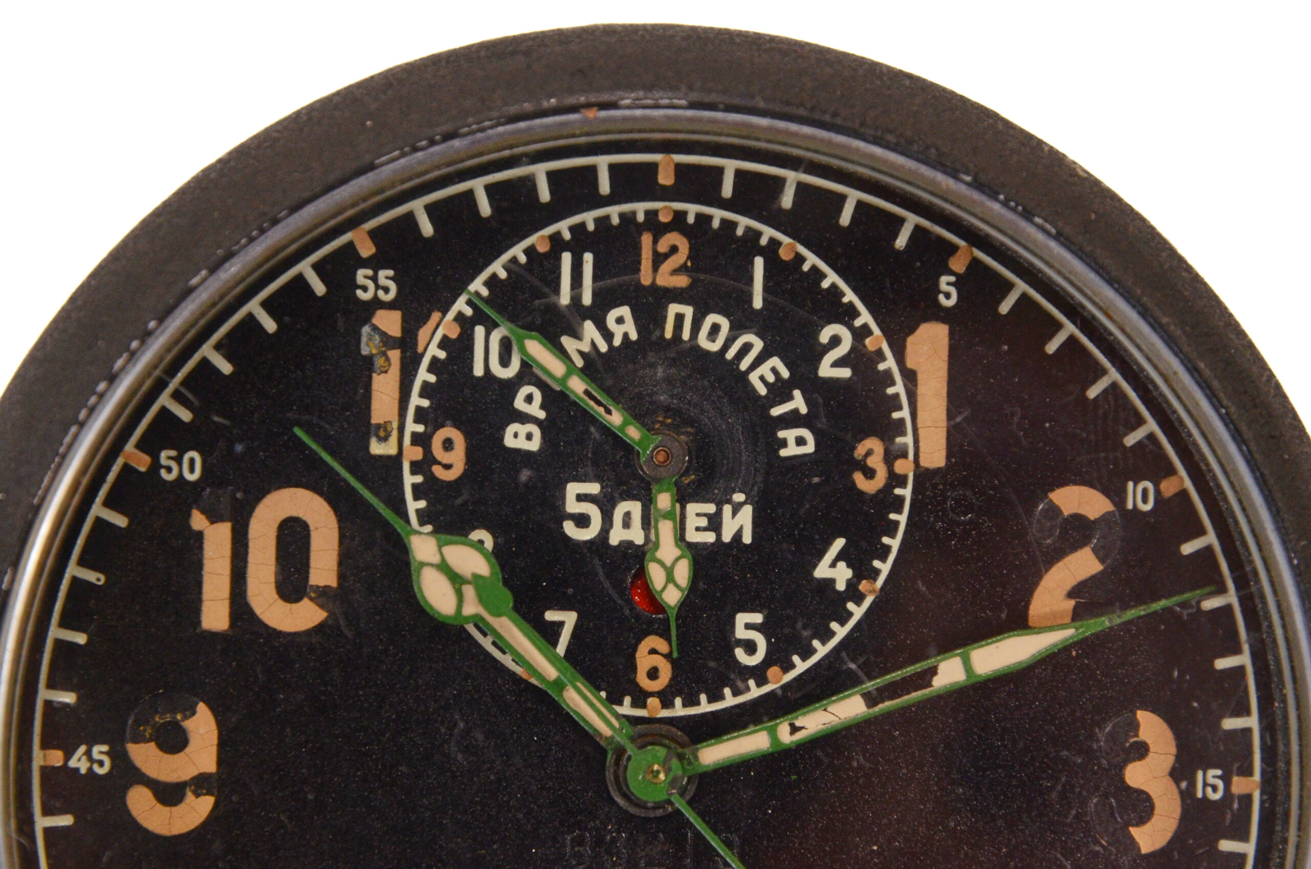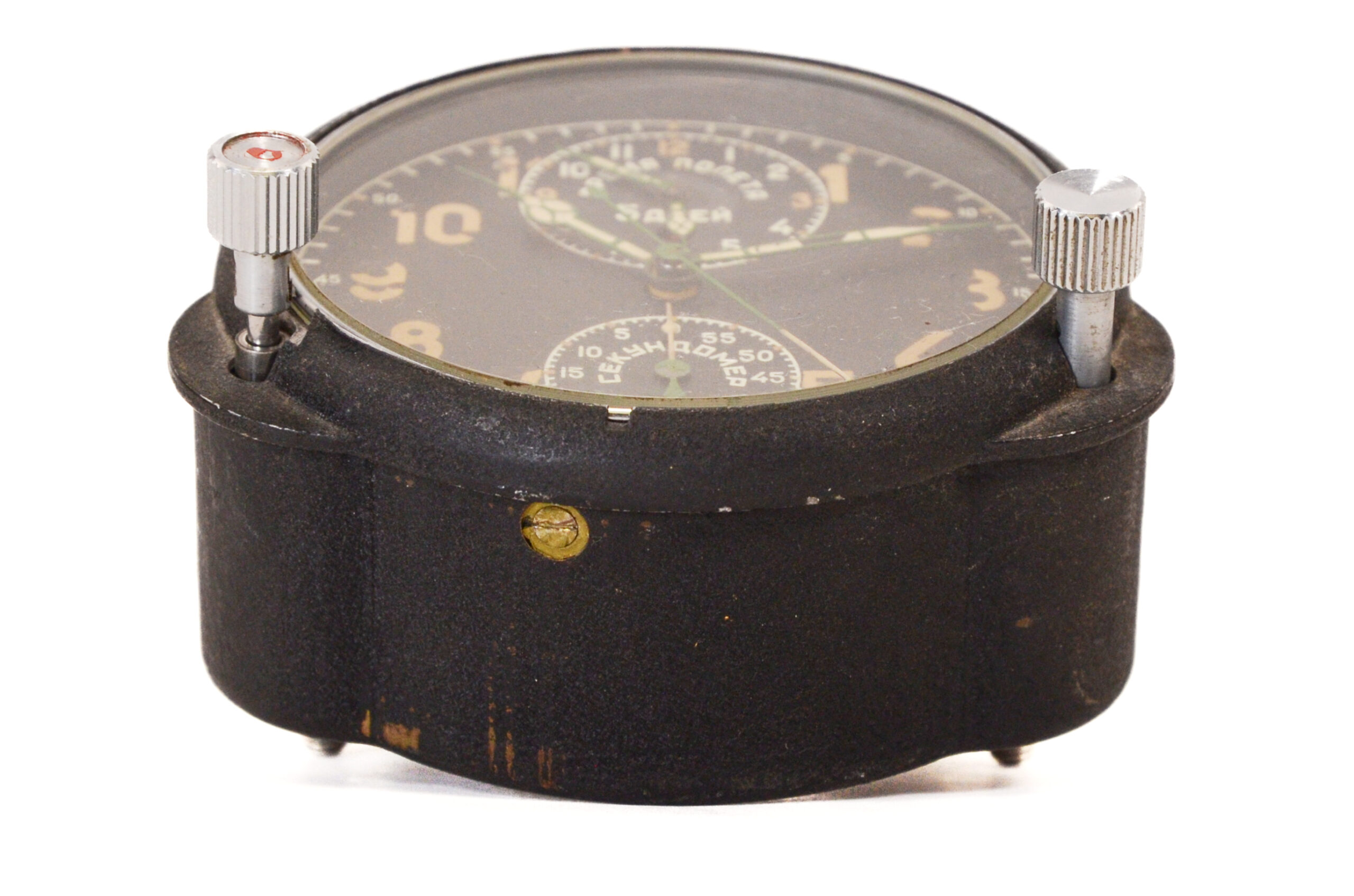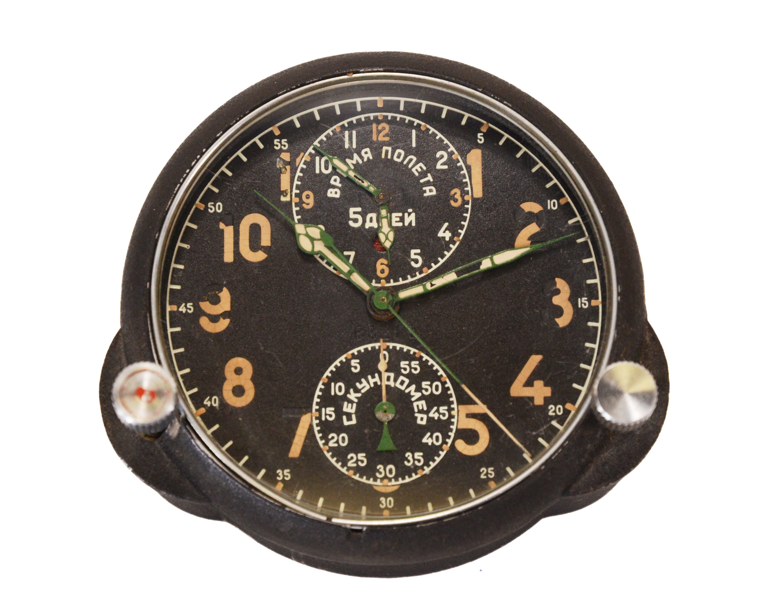 Keywords: Soviet cockpit clock, MiG fighter clock, Cold War aviation instrument, USSR aircraft gauge, Soviet Air Force memorabilia, military aircraft clock, mechanical flight timer.