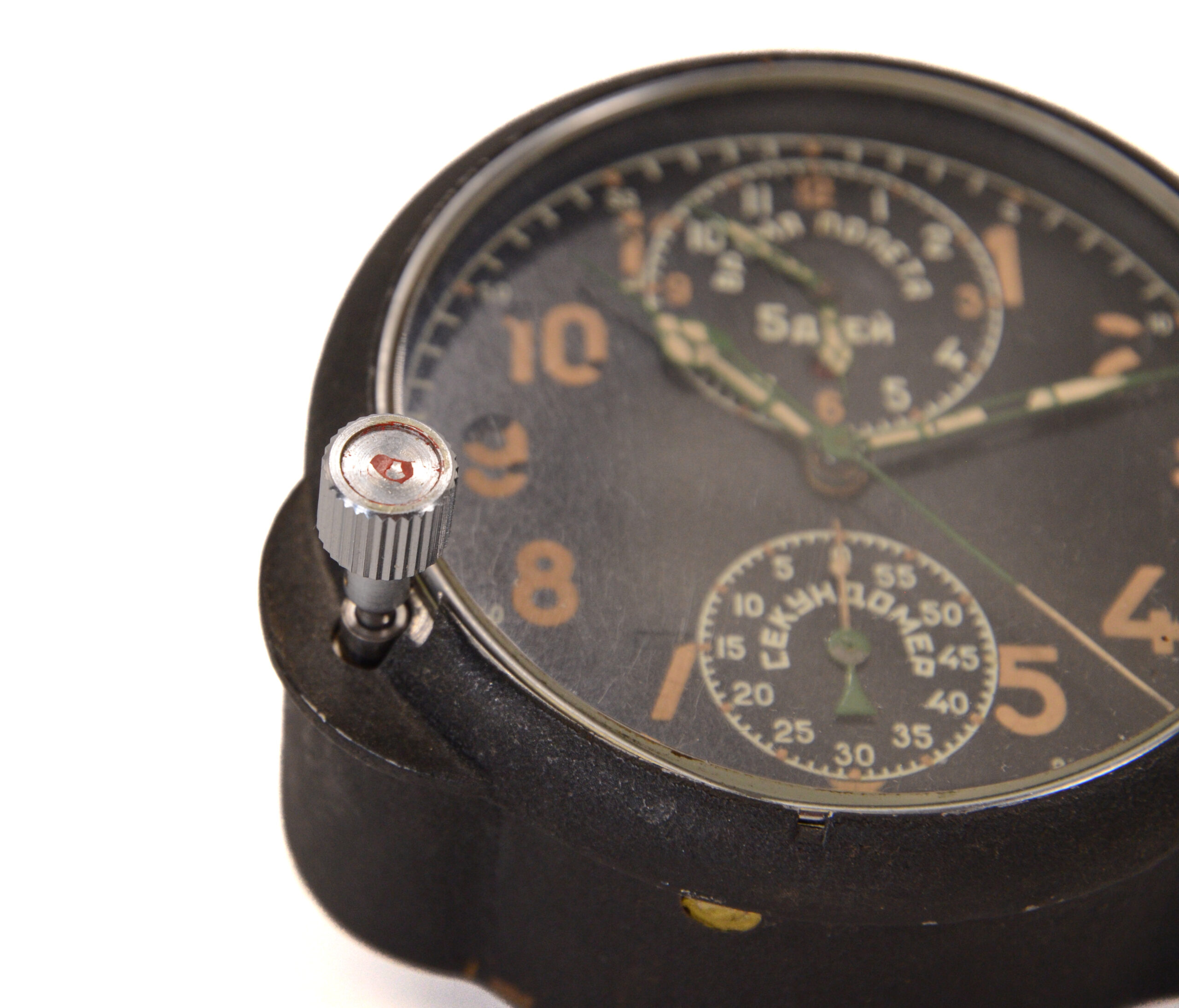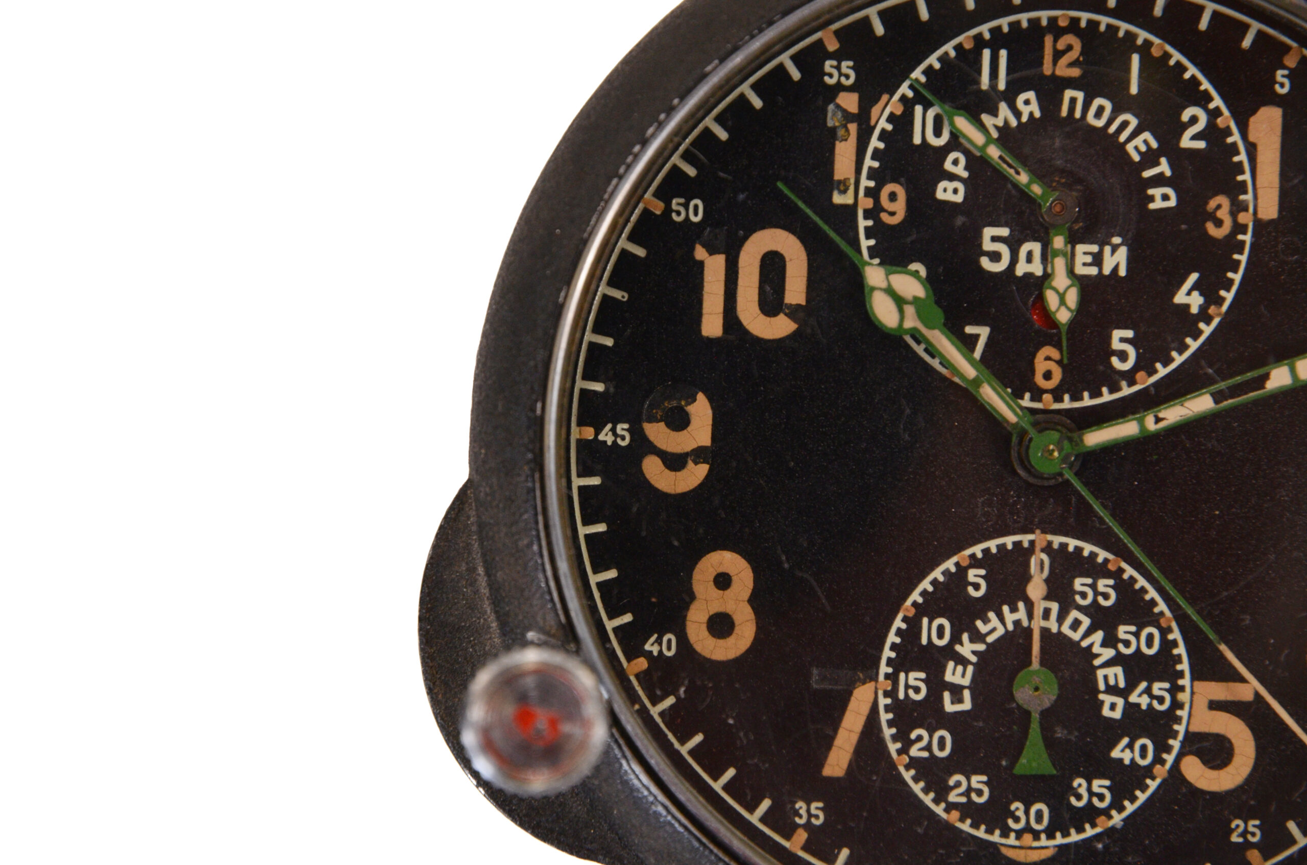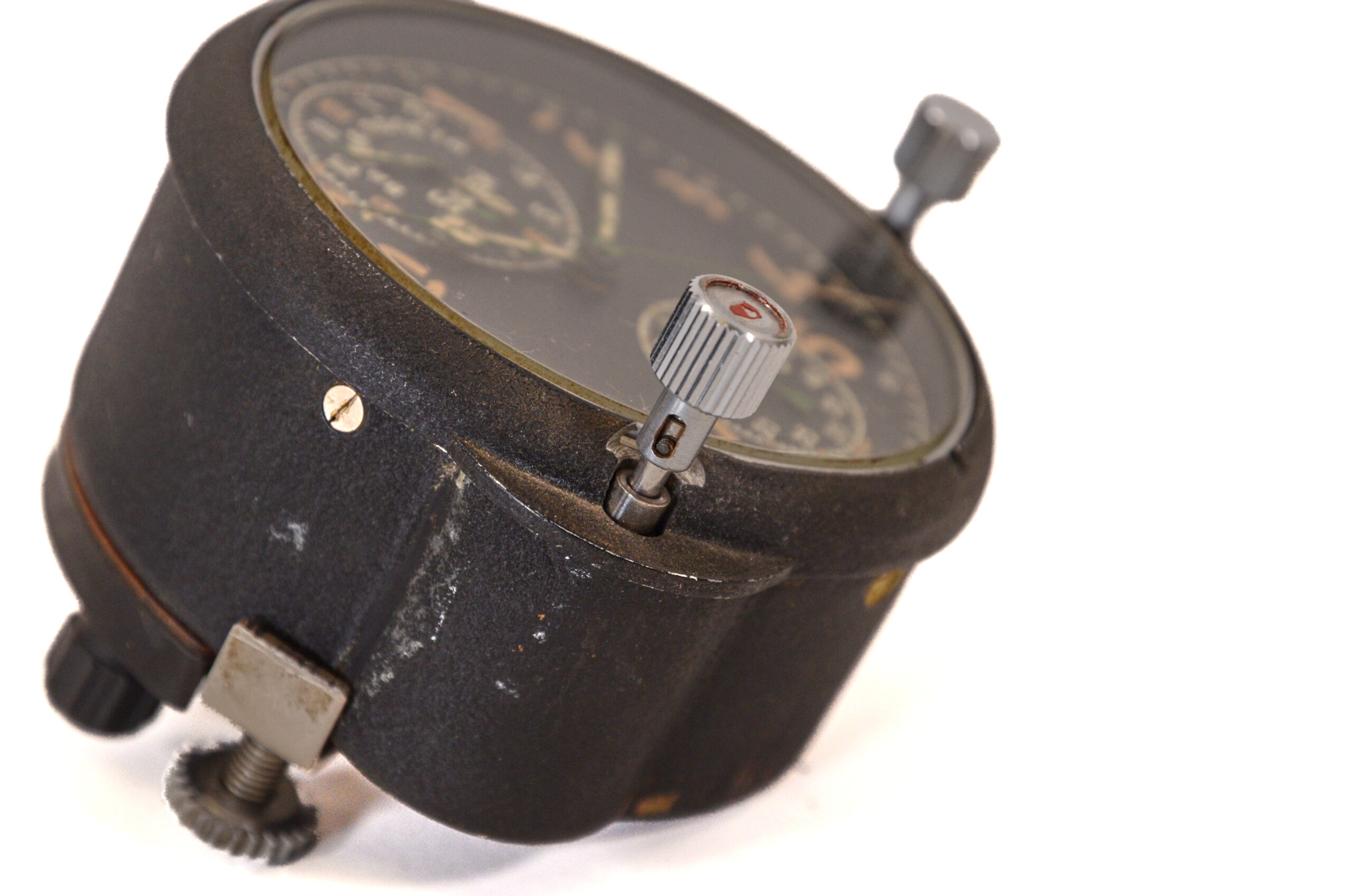 Keywords: Soviet cockpit clock, MiG fighter clock, Cold War aviation instrument, USSR aircraft gauge, Soviet Air Force memorabilia, military aircraft clock, mechanical flight timer.
