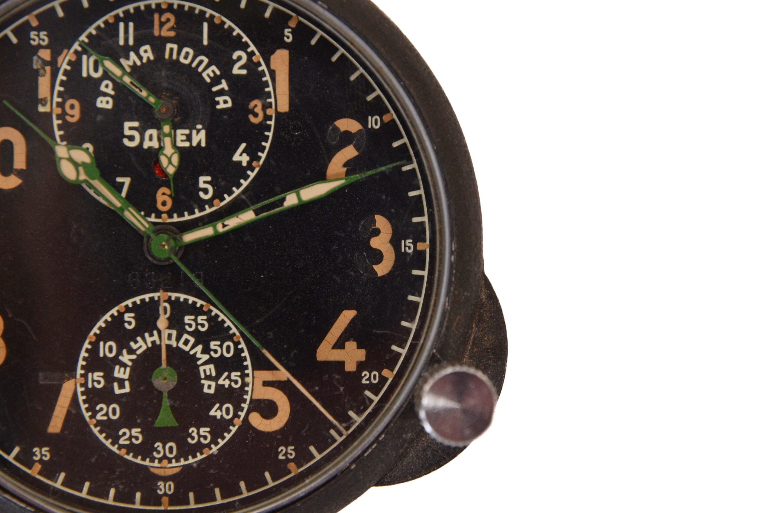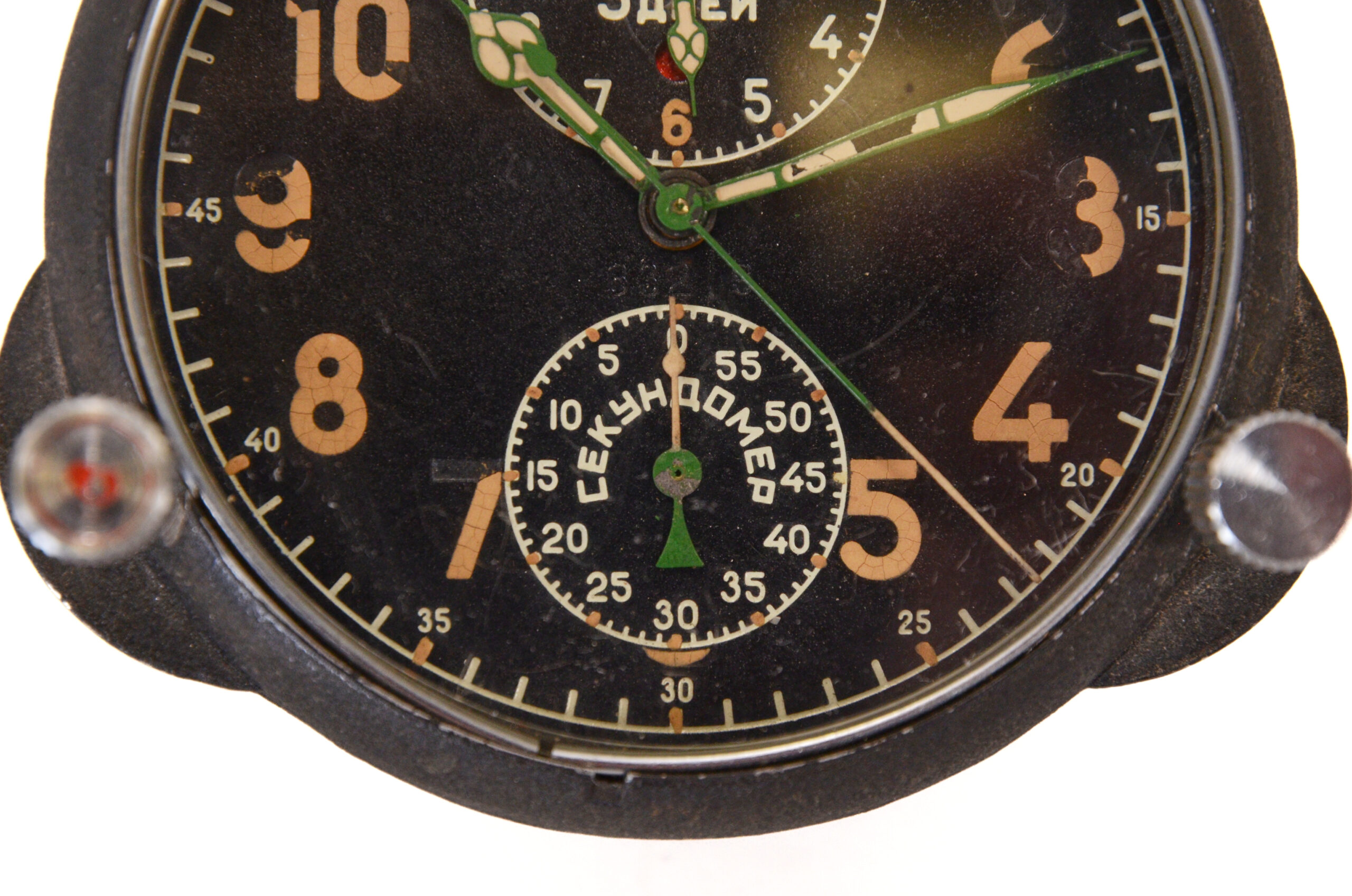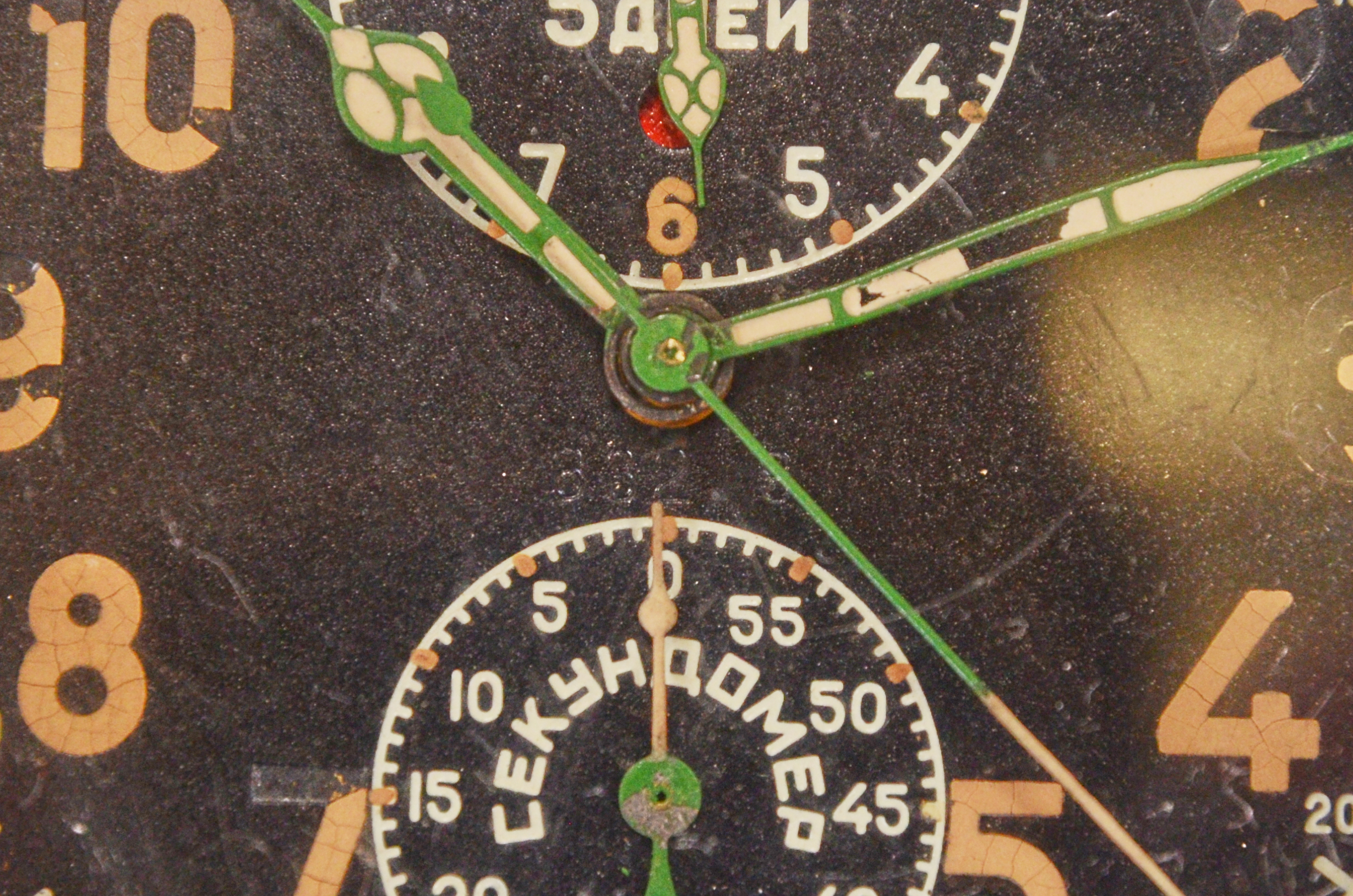 Constructed with a robust all-metal case, this model features a mechanical movement with manual wind, luminous numerals, and hands for low-light cockpit visibility. The black dial bears clear Cyrillic markings, a subsidiary seconds register, and often a 12-hour elapsed time counter — a key function for flight time recording and mission tracking. Its glass crystal remains intact, showing typical service wear and minor age marks consistent with genuine use.