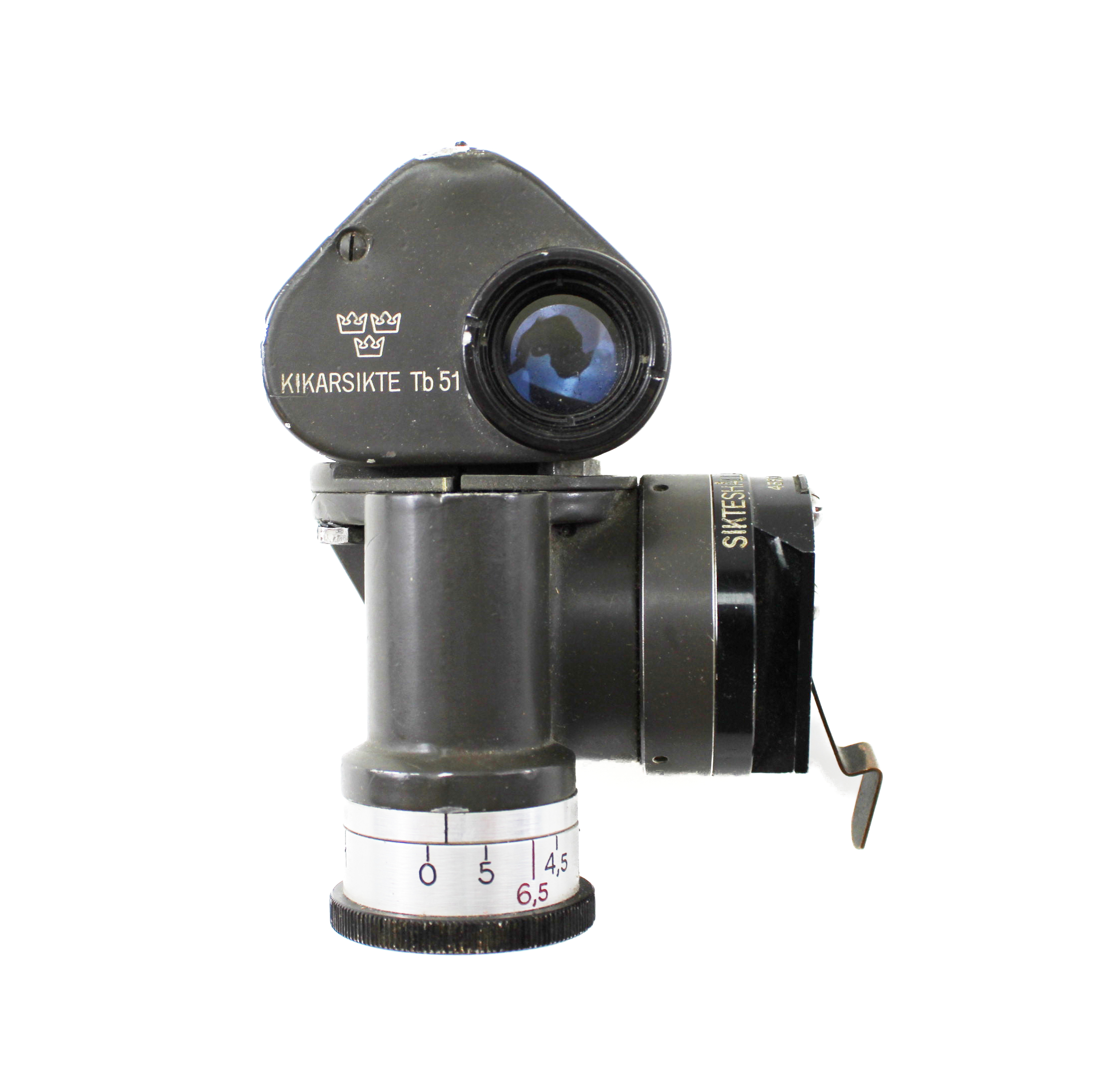This is an authentic KIKARSIKTE Tb51 optical sight, produced for the Swedish military during the mid-20th century. The term “Kikarsikte” translates to “telescope sight” in Swedish, and these rugged optics were issued primarily as artillery or crew-served weapon sights, offering clear magnification for long-range targeting and observation.