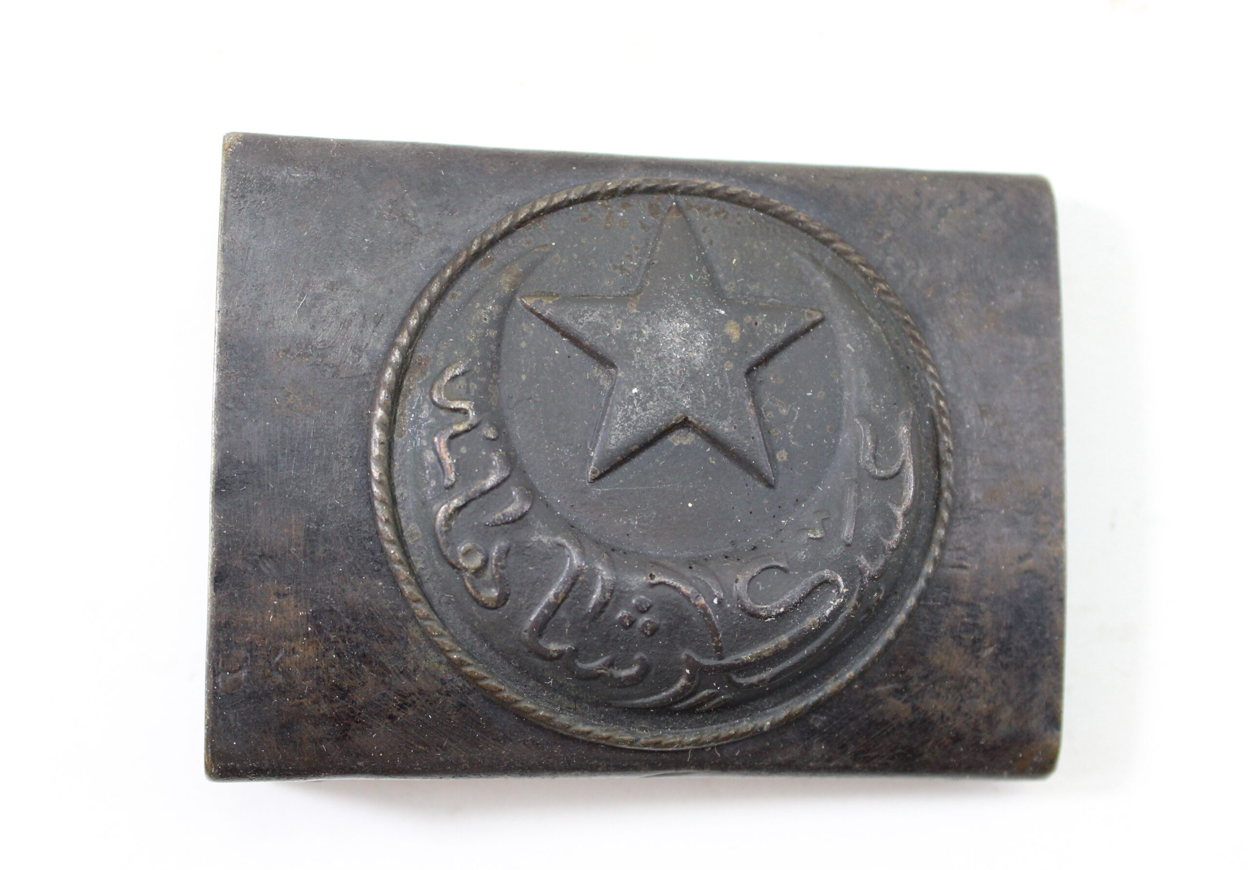 This is an authentic World War I Ottoman Empire Turkish belt buckle, made of steel with a darkened patina from age. The design features a crescent moon and star, a powerful Ottoman symbol, encircled by an ornate rope border with Arabic script.