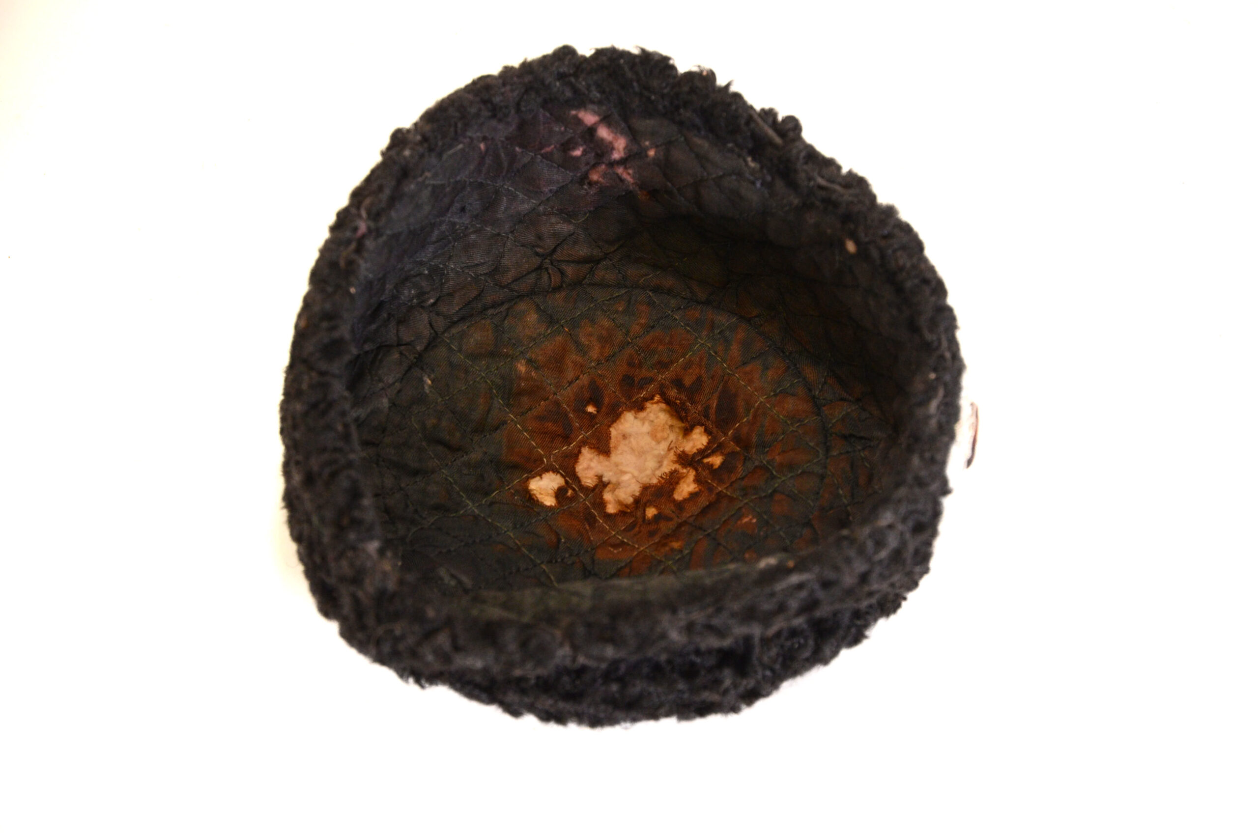 This cap features a tall cylindrical body constructed from black sheepskin, consistent with traditional Don Cossack style. The crown is cloth, showing appropriate age and wear while retaining its form. The sheepskin shows natural discoloration from handling and exposure, while the interior reveals wear at the crown where the cap was pressed against the head, all of which reflects its genuine period use.