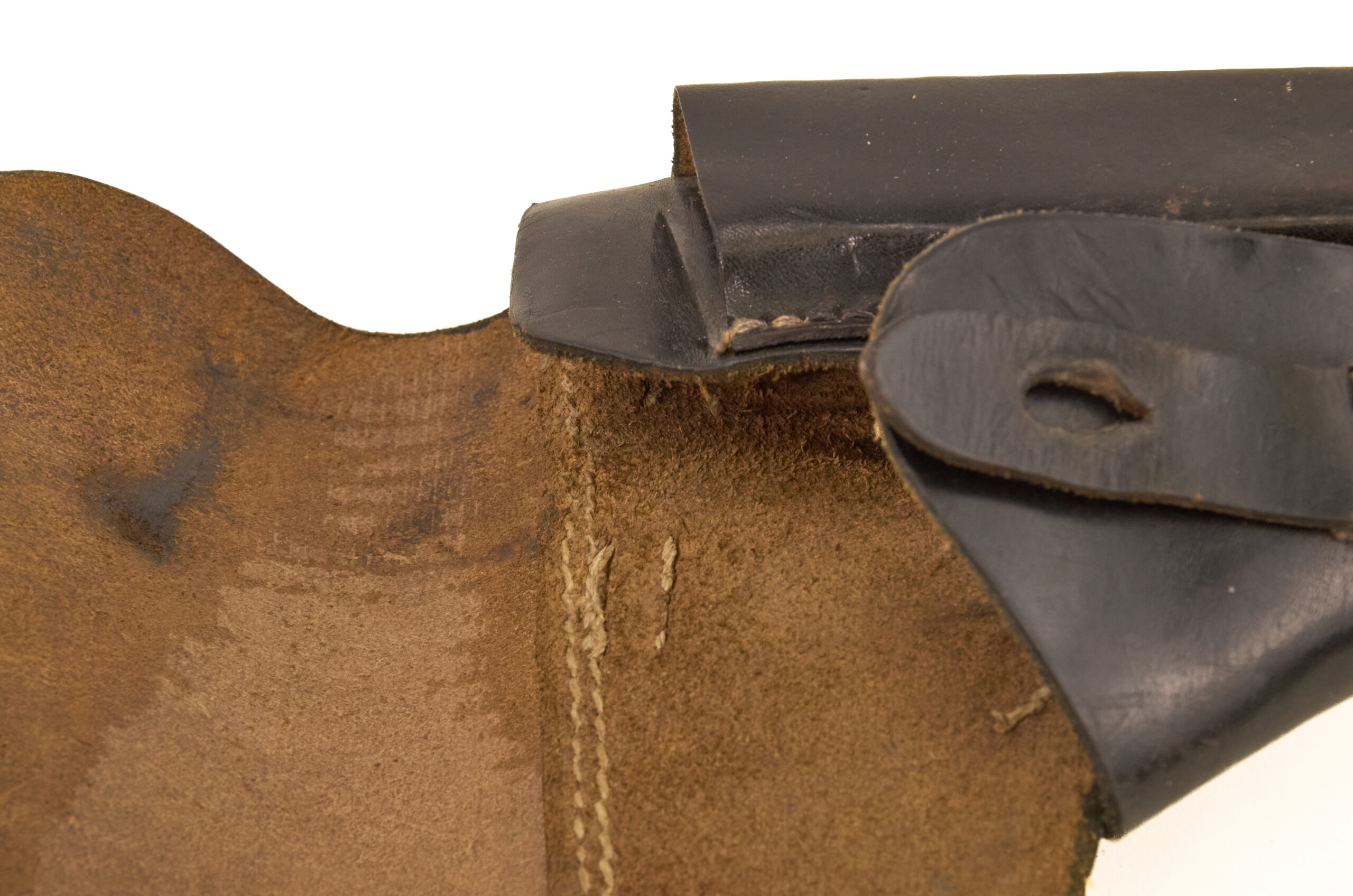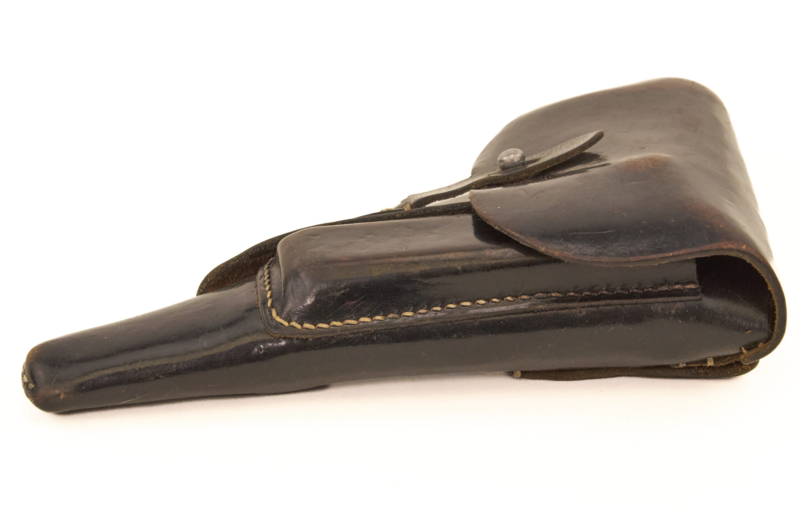 The leather remains pliable and well-preserved, with tight, intact stitching throughout. There are no cracks or tears, and the overall wear is consistent with issue and light field use. Edges and high-contact areas show honest handling wear, but the structure of the holster remains firm and serviceable.