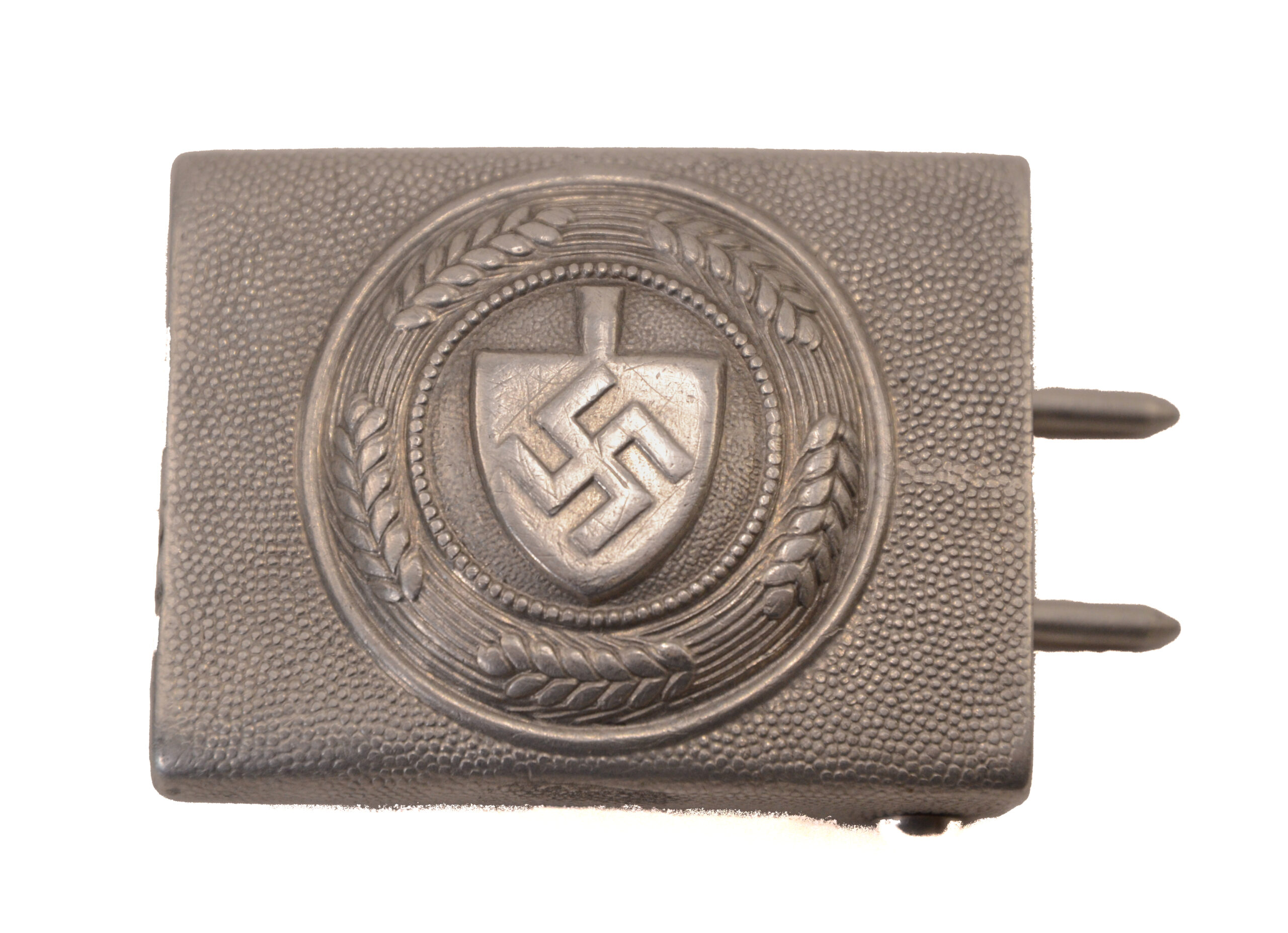 This is an authentic WWII German Reichsarbeitsdienst (RAD) EM/NCO belt buckle, known as a Koppelschloß. Constructed of stamped metal, the buckle features the distinctive spade with swastika emblem, framed by stylized wheat sheaves, with the motto “Arbeit Adelt” (Work Ennobles) above.