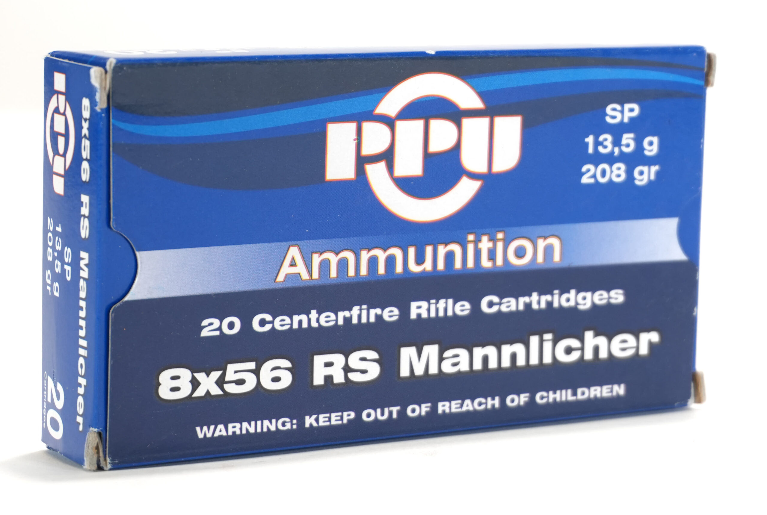 Adopted in the 1930s, the 8x56mmR replaced the earlier 8x50R Mannlicher round and became the standard chambering for straight-pull Steyr-Mannlicher rifles throughout Central Europe. It was used extensively by Austria, Hungary, and their allies during World War II. The cartridge is known for its distinctive rimmed case, strong recoil, and excellent penetration, originally intended for both infantry rifles and light machine guns.