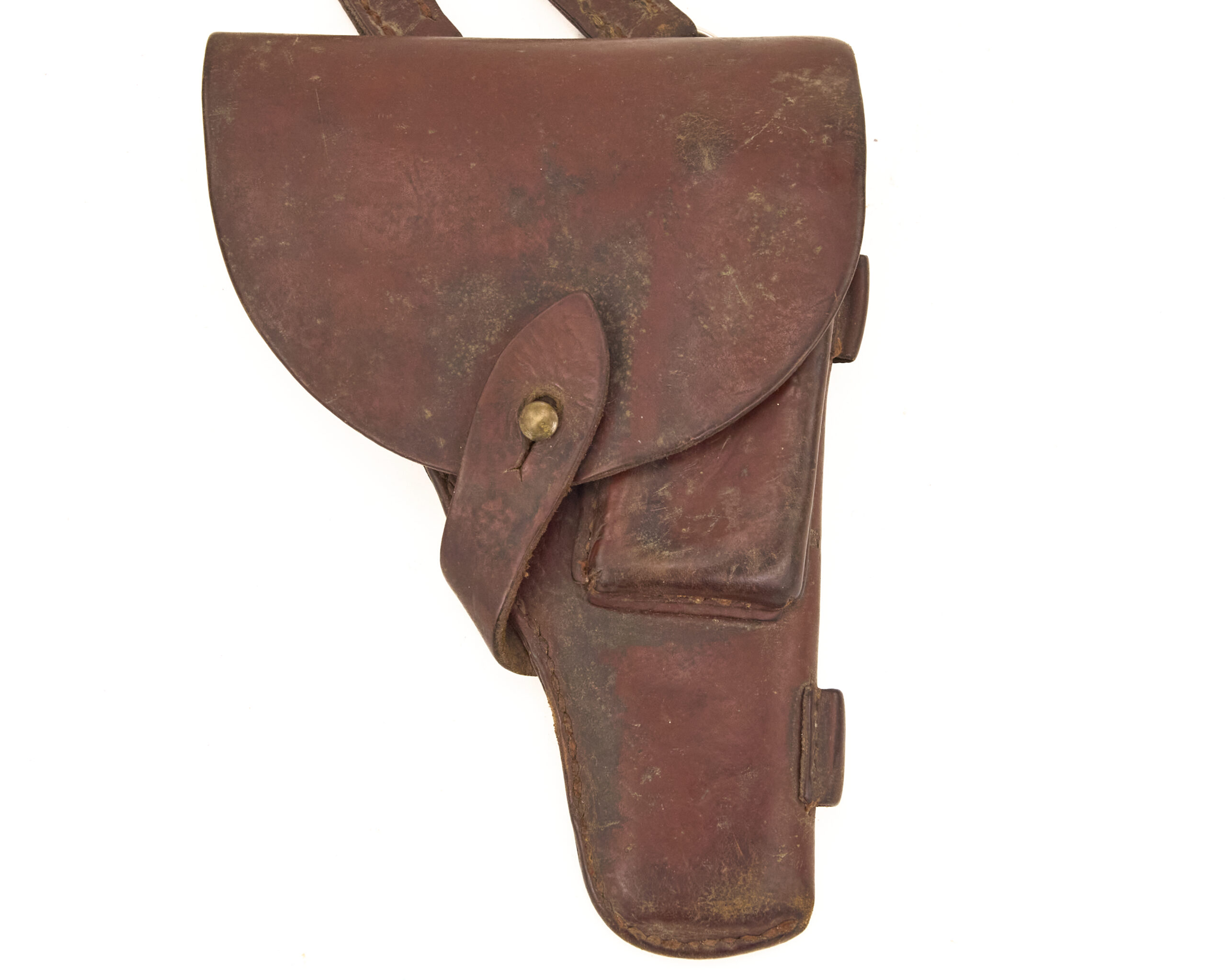 This holster is made in light to medium brown leather and uses a traditional full-flap military pattern. The closure consists of a leather tab and brass button. Inside, it has the expected pocket for a spare magazine and provision for a cleaning rod, which reflects the compact field system built around the Makarov pistol. The holster also retains its shoulder strap, allowing it to be worn in the intended service manner rather than only on a belt. Belt support loops and stitched construction give the piece its proper military layout, while the overall form remains distinctly Eastern Bloc in style and function.