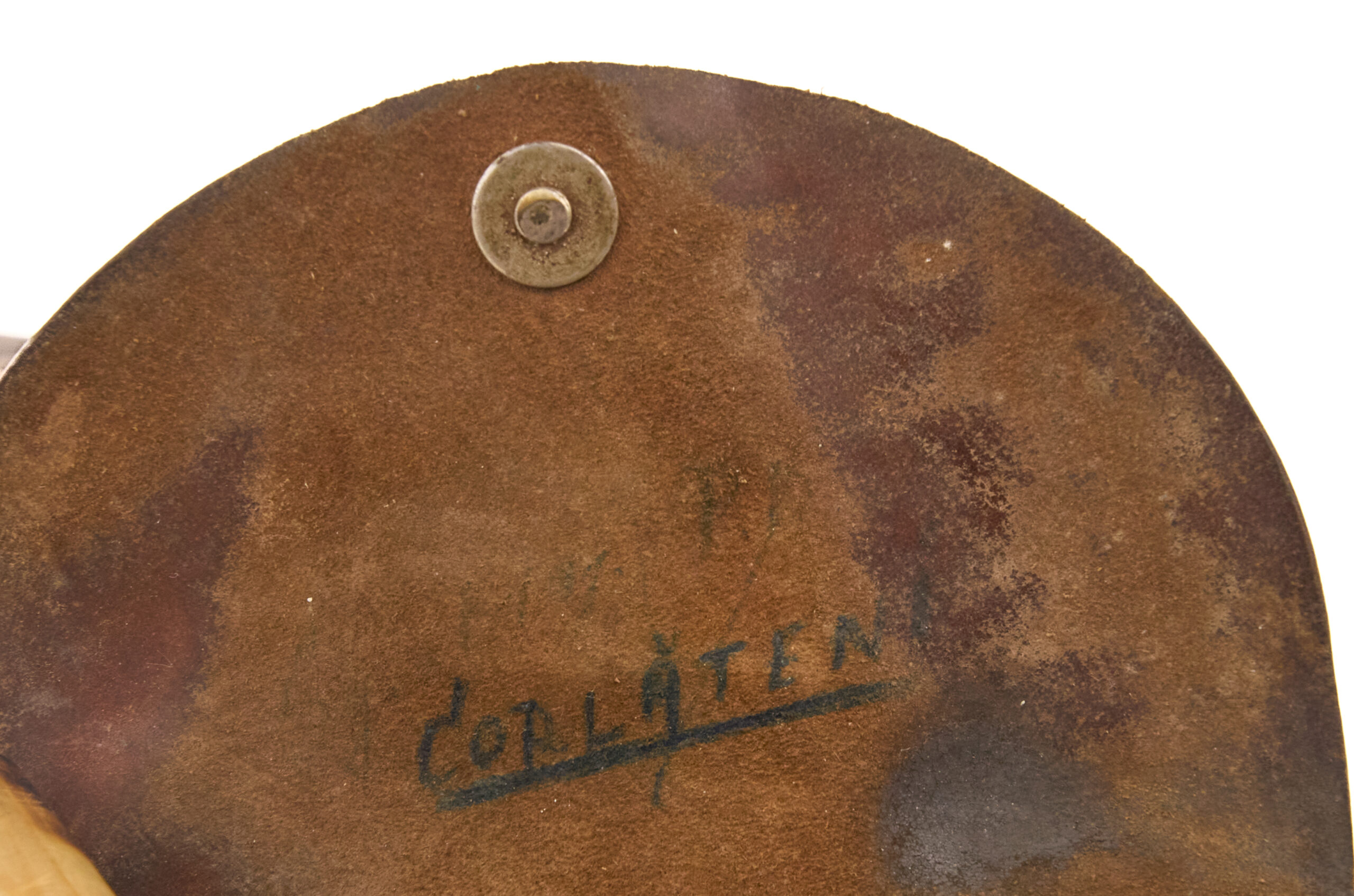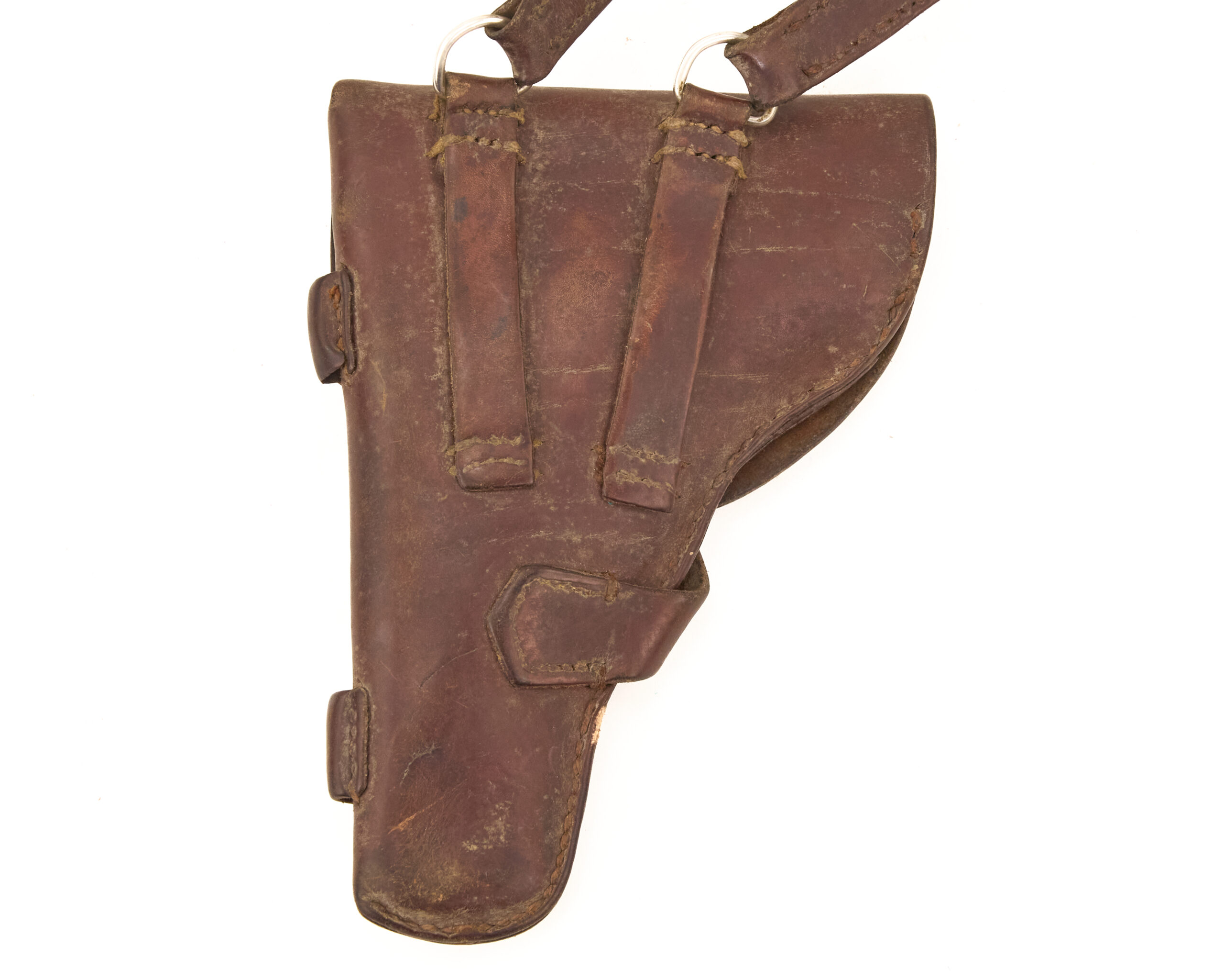 That background helps explain why surviving holsters often carry more character than the pistols they once held. The firearm might remain standardized, but the leather gear absorbed the daily life of service. It picked up wear from handling, weather, storage, movement, and repair. In this case, the trench art inscription inside the flap adds a further human element. Soldier markings like that are often what give a common military item a more compelling story. They suggest ownership, familiarity, and the small ways servicemen personalized government-issued equipment that otherwise looked identical from one man to the next.