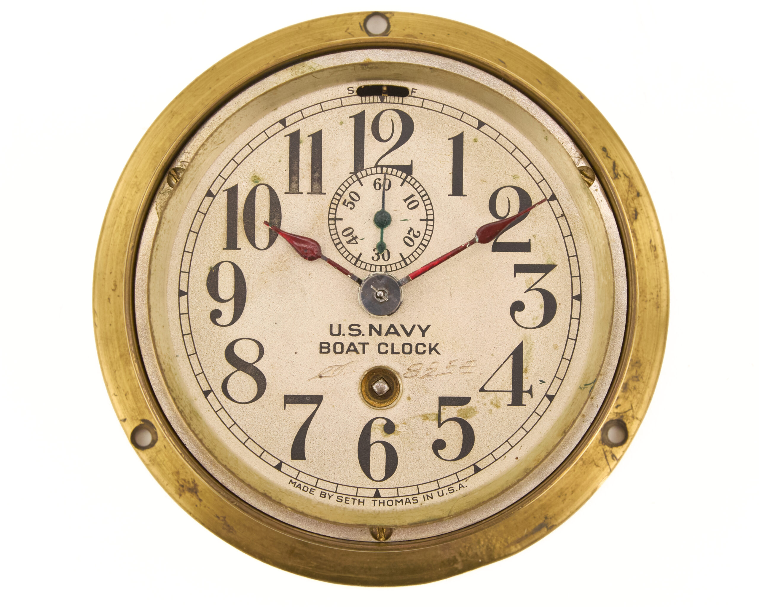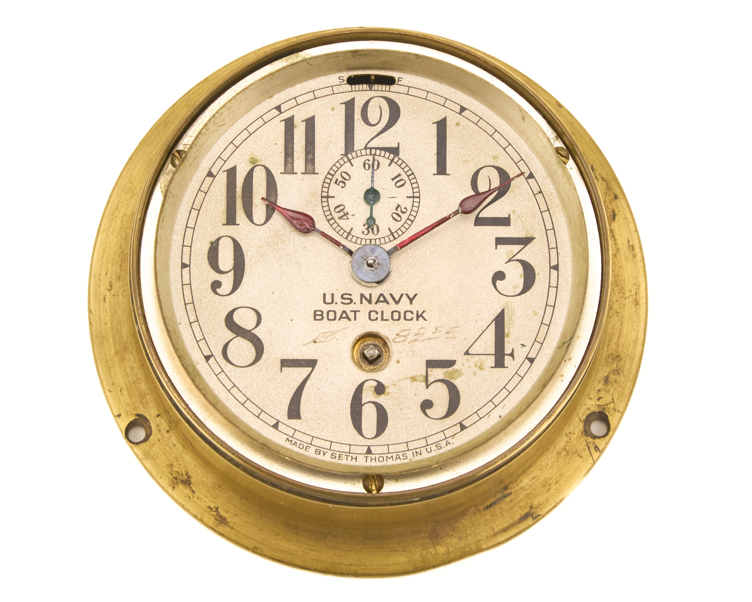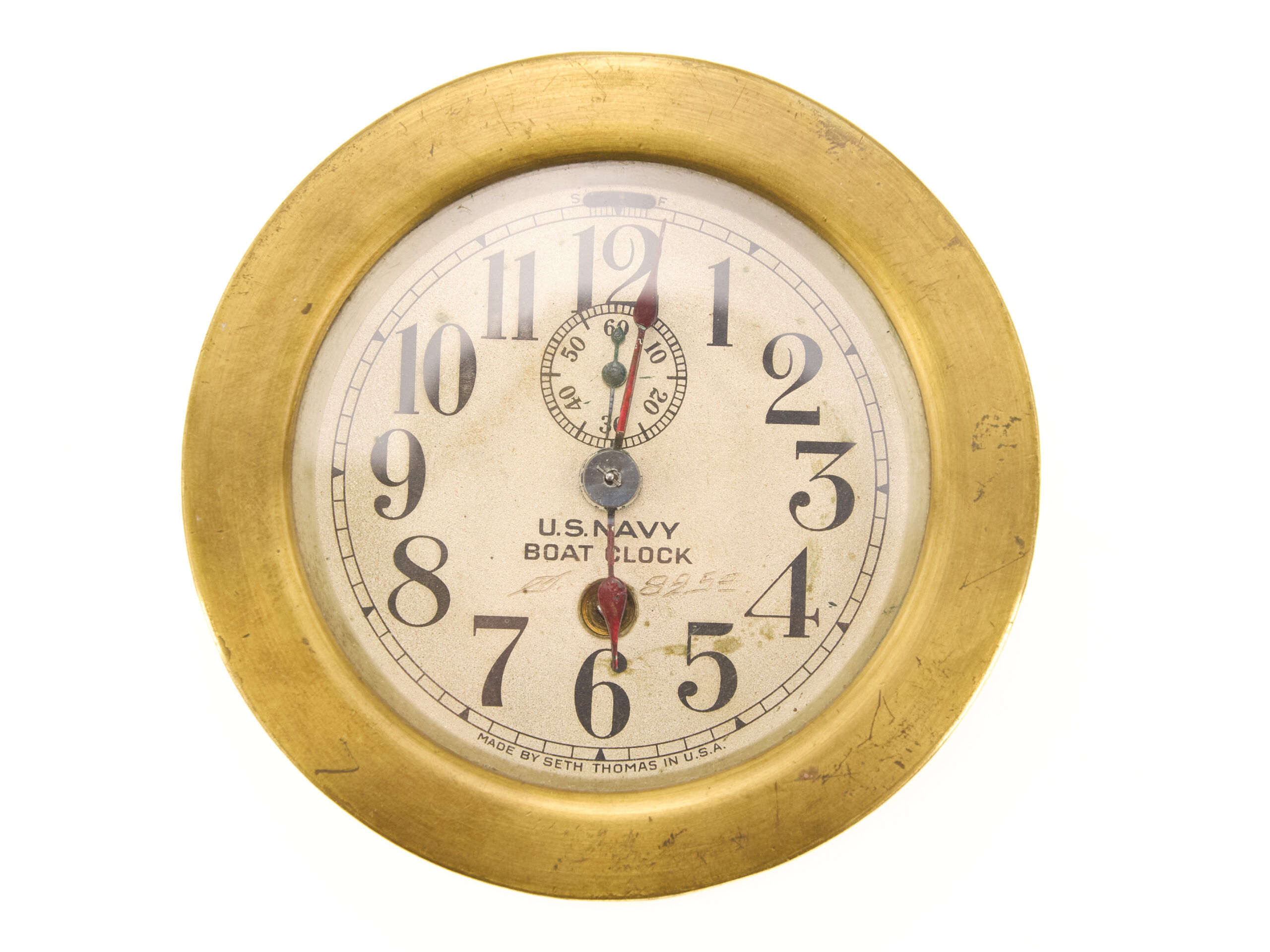 Seth Thomas was a primary supplier of precision timepieces to the U.S. military during World War II, and the Mark I boat clock was widely used on patrol craft, auxiliaries, and larger vessels where accurate time was essential for navigation, coordination, and operations. The robust brass construction and legible dial reflect the functional, no-nonsense design demanded by wartime naval requirements.
