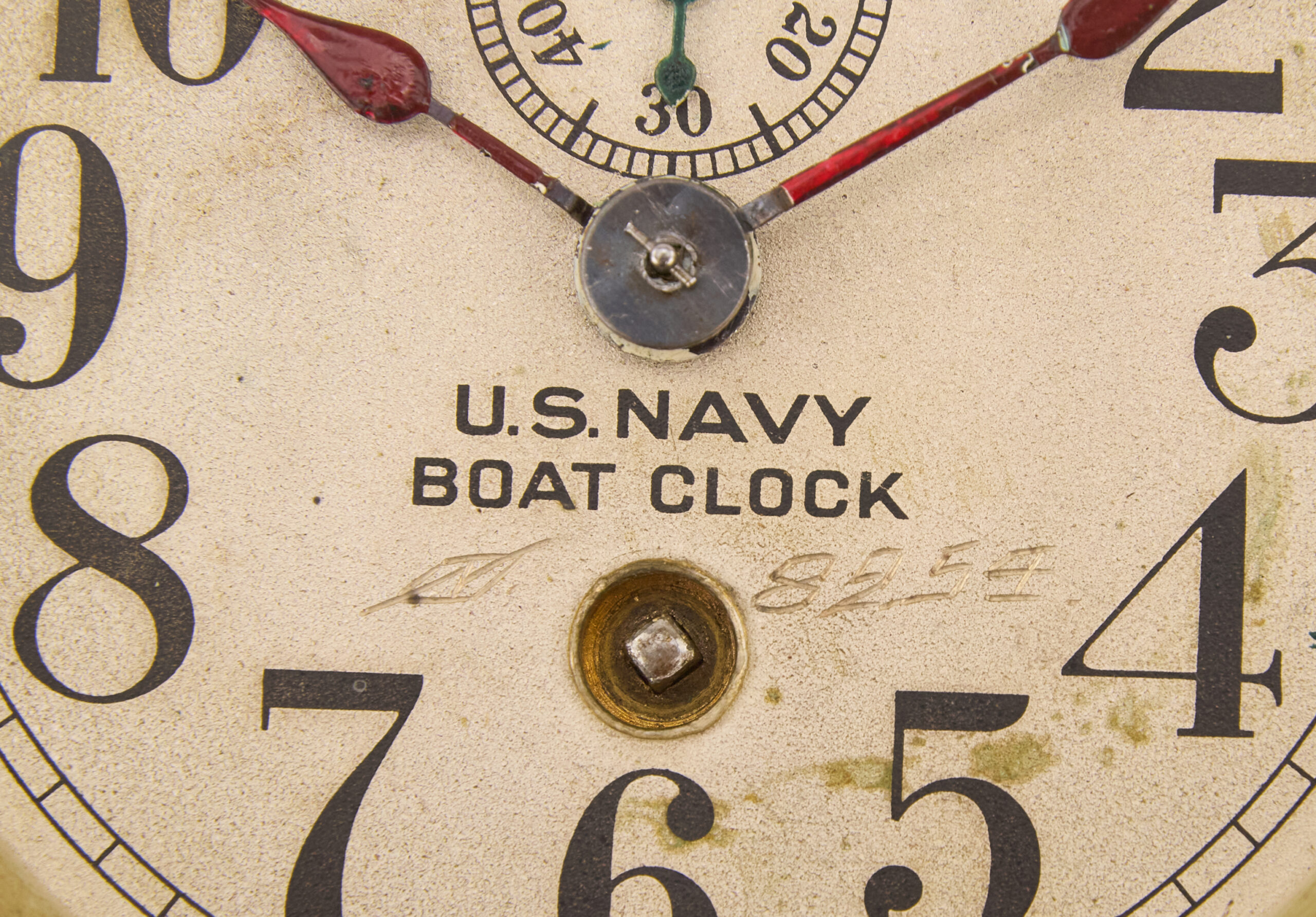 The clock is complete and in running condition, retaining its original configuration. The dial is fitted with red-painted hour and minute hands, with a green-painted second hand mounted on a separate subsidiary seconds dial, a characteristic feature of these naval clocks for precise timekeeping. Above the winding key port on the dial is a hand-engraved marking consisting of a square enclosing a lightning bolt, followed by the number “8959,” indicating period-applied identification or inventory marking associated with naval service.