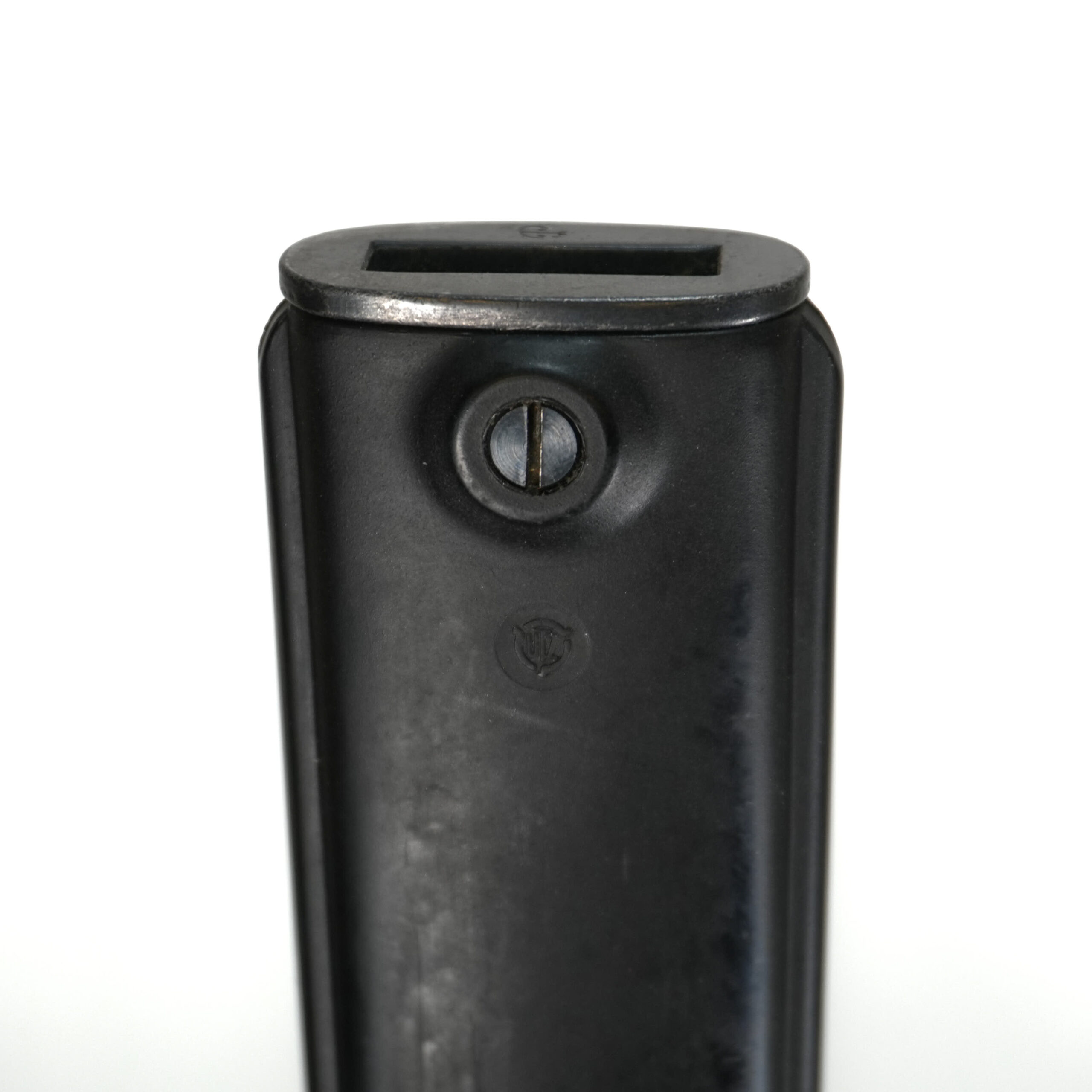 The blade is parkerized and retains a sharp profile with no signs of misuse or post-service sharpening. The Swiss M1957 bayonet features a sturdy straight blade with a spear point, compatible with the rifle’s lug-mounted bayonet system. The ricasso is clearly marked “Victoria Schwyz,” one of the premier Swiss manufacturers contracted for military production during the postwar period. The edge is crisp, and the spine retains the factory finish, showing only light signs of handling.