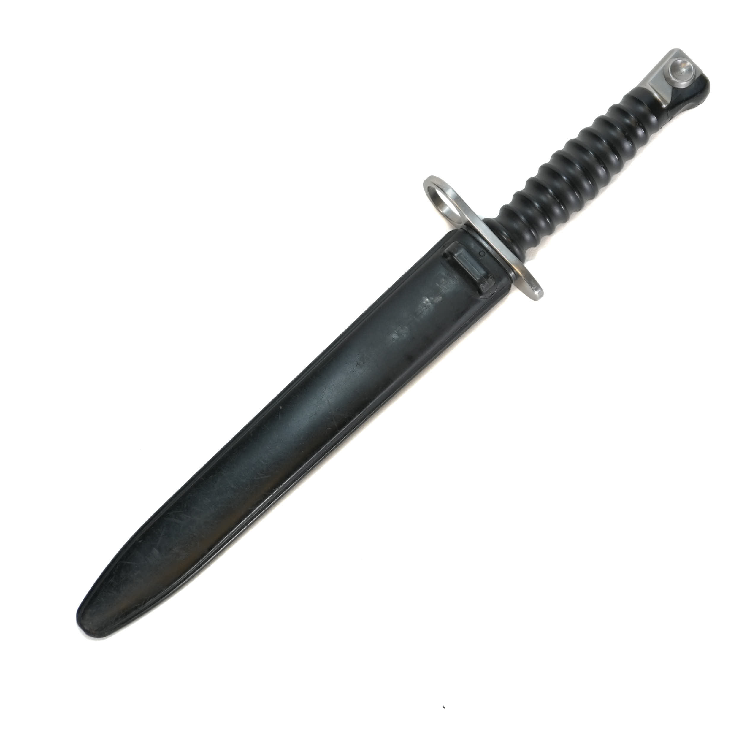 The black ribbed synthetic grips are intact with no cracks, and the release button functions smoothly. The steel scabbard retains most of its original finish, with only minor wear from service and storage. A period-correct frog stud is still attached and undamaged. These bayonets were standard issue in the 1960s and remained in use for decades, making them highly collectible for both military historians and SIG rifle enthusiasts.