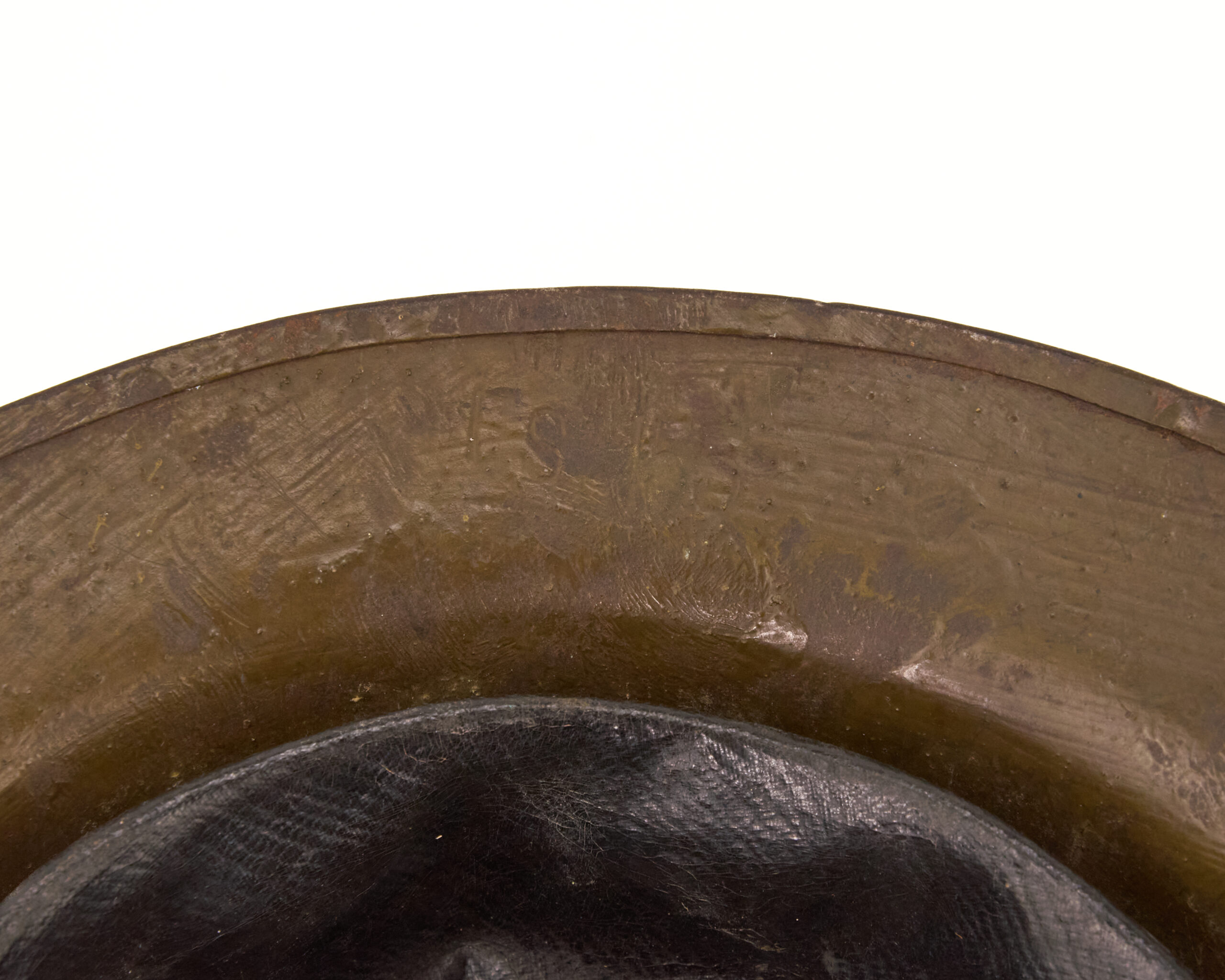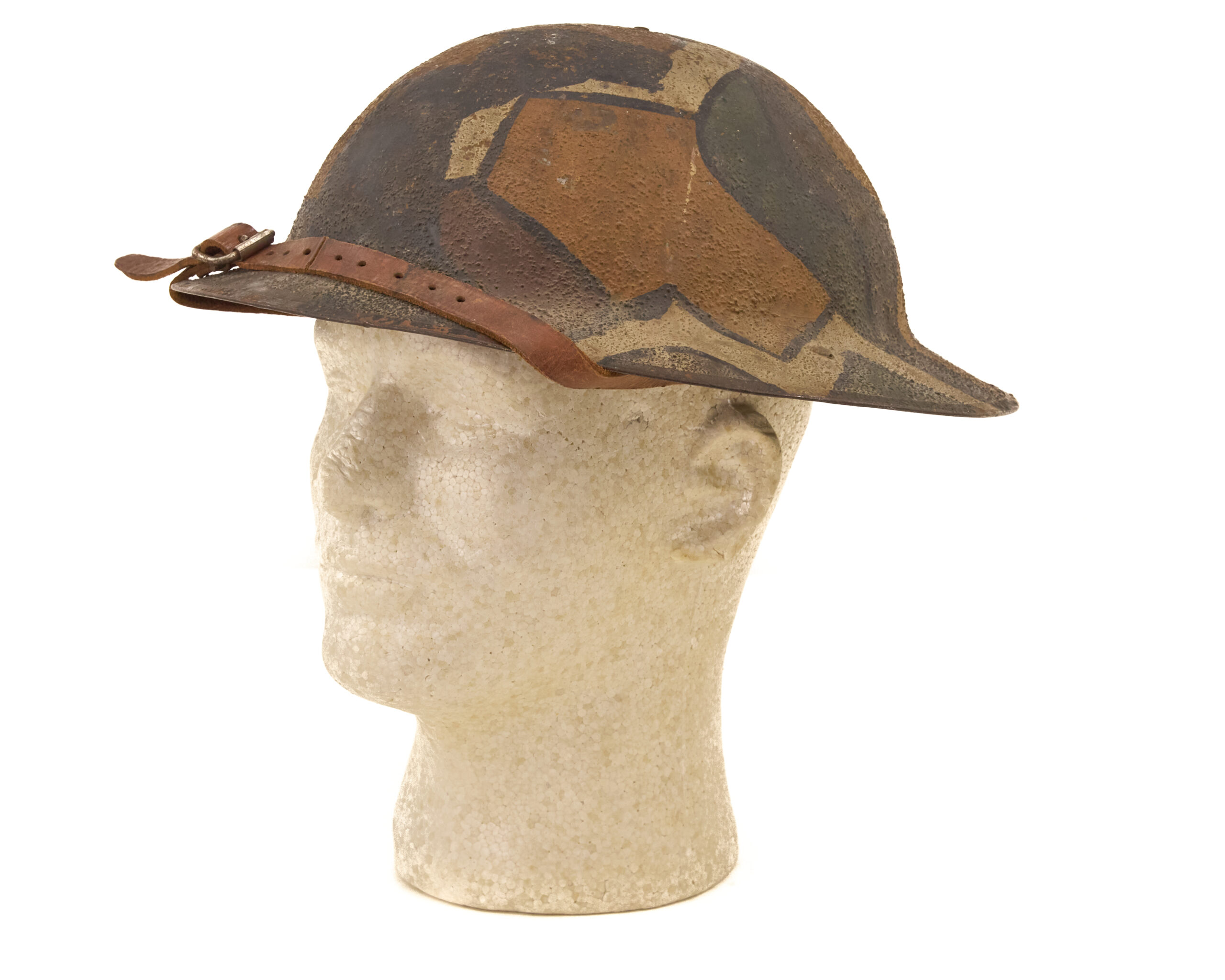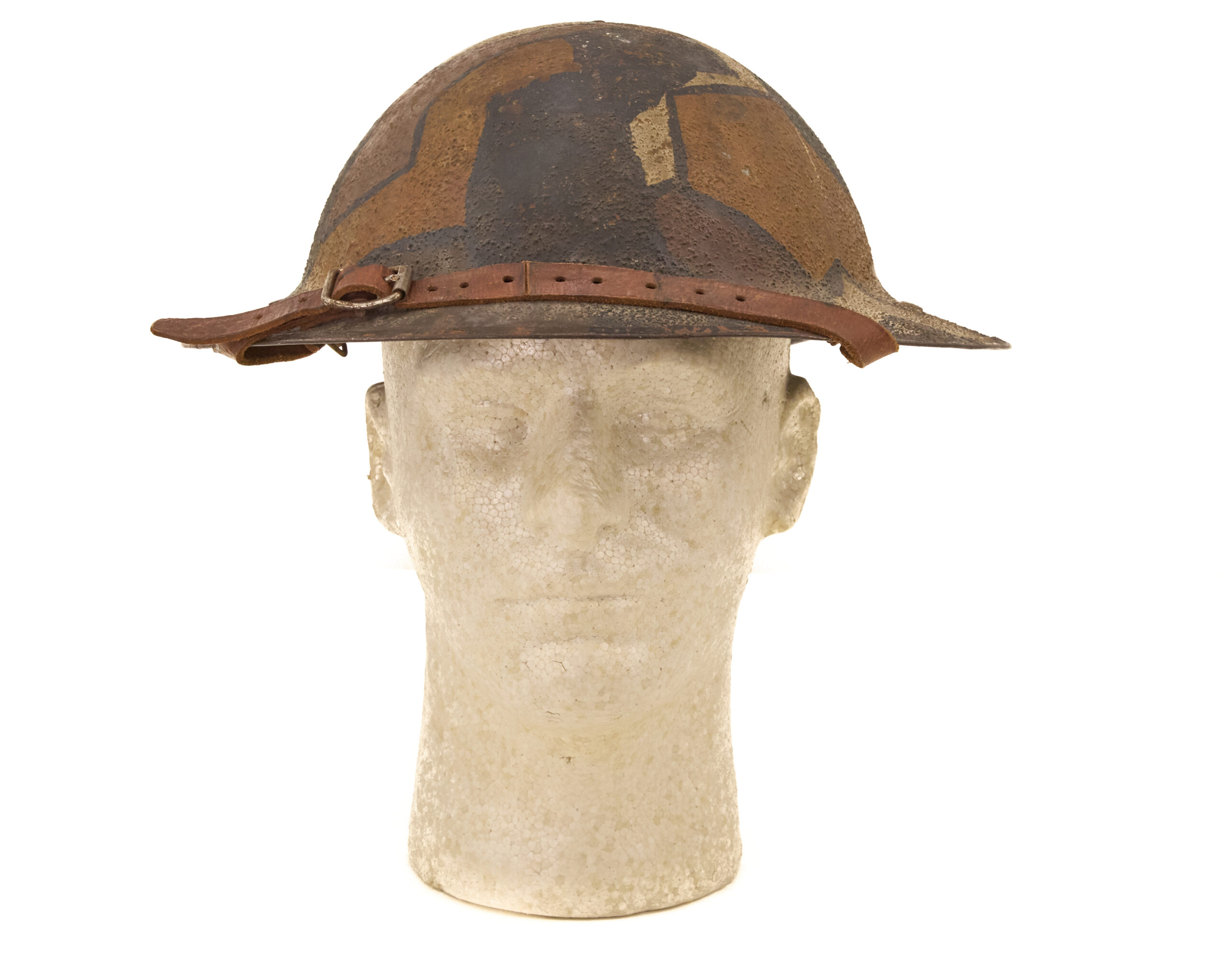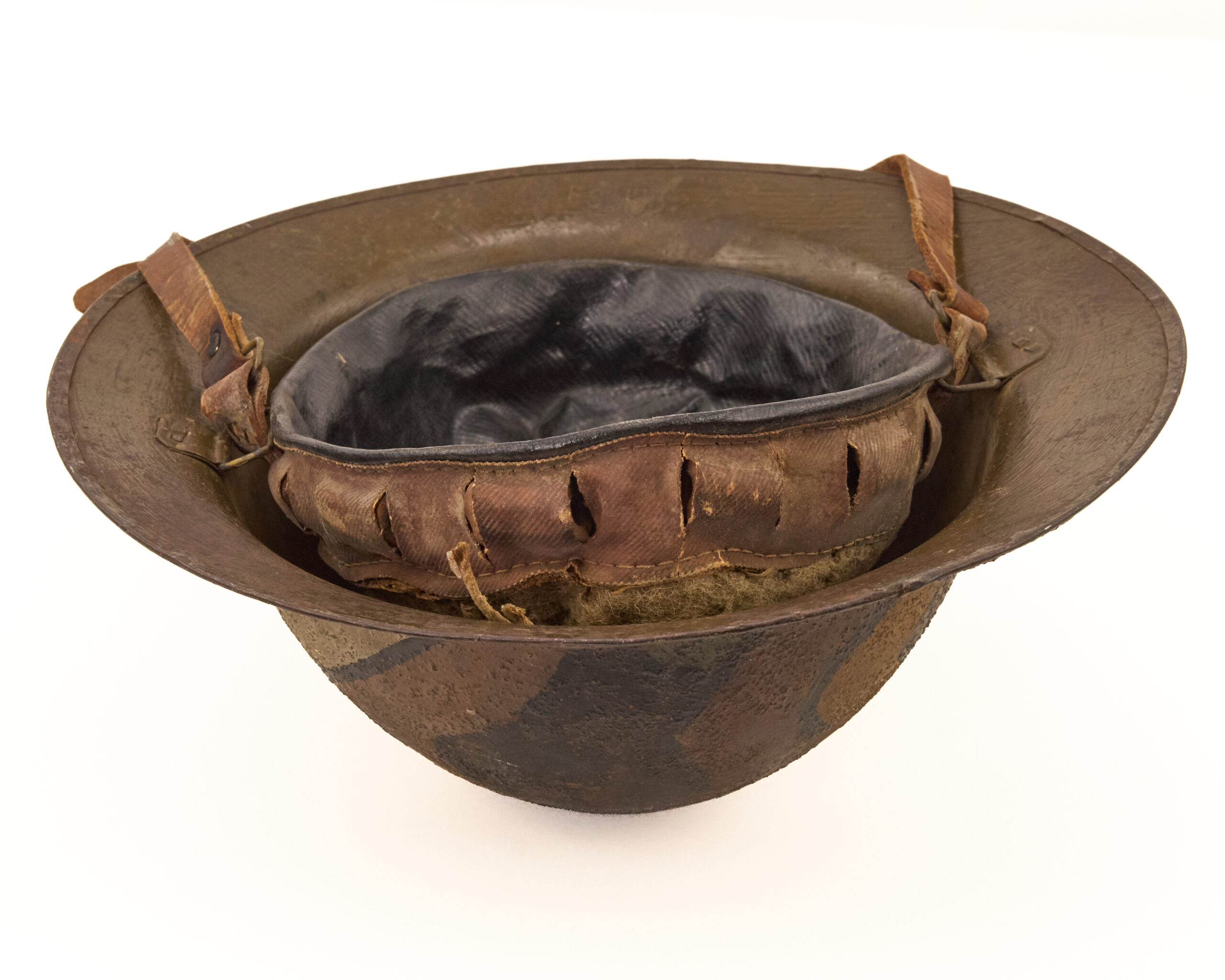 This helmet represents an authentic, combat-used example of American World War I headgear. With its field-applied camouflage, correct liner, and identifiable wartime manufacturer, it is an excellent piece for collectors of U.S. military helmets, World War I artifacts, or trench warfare equipment.