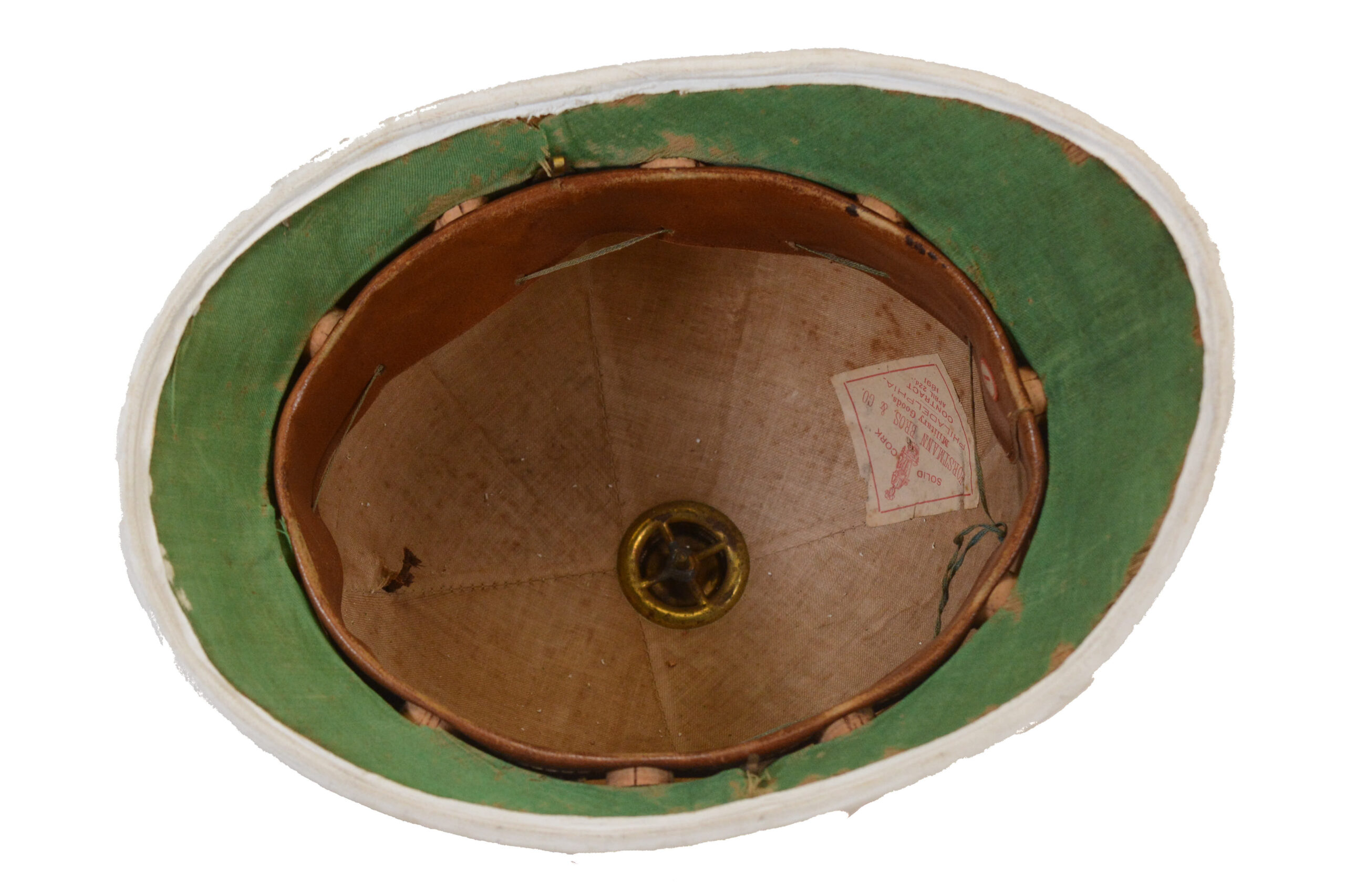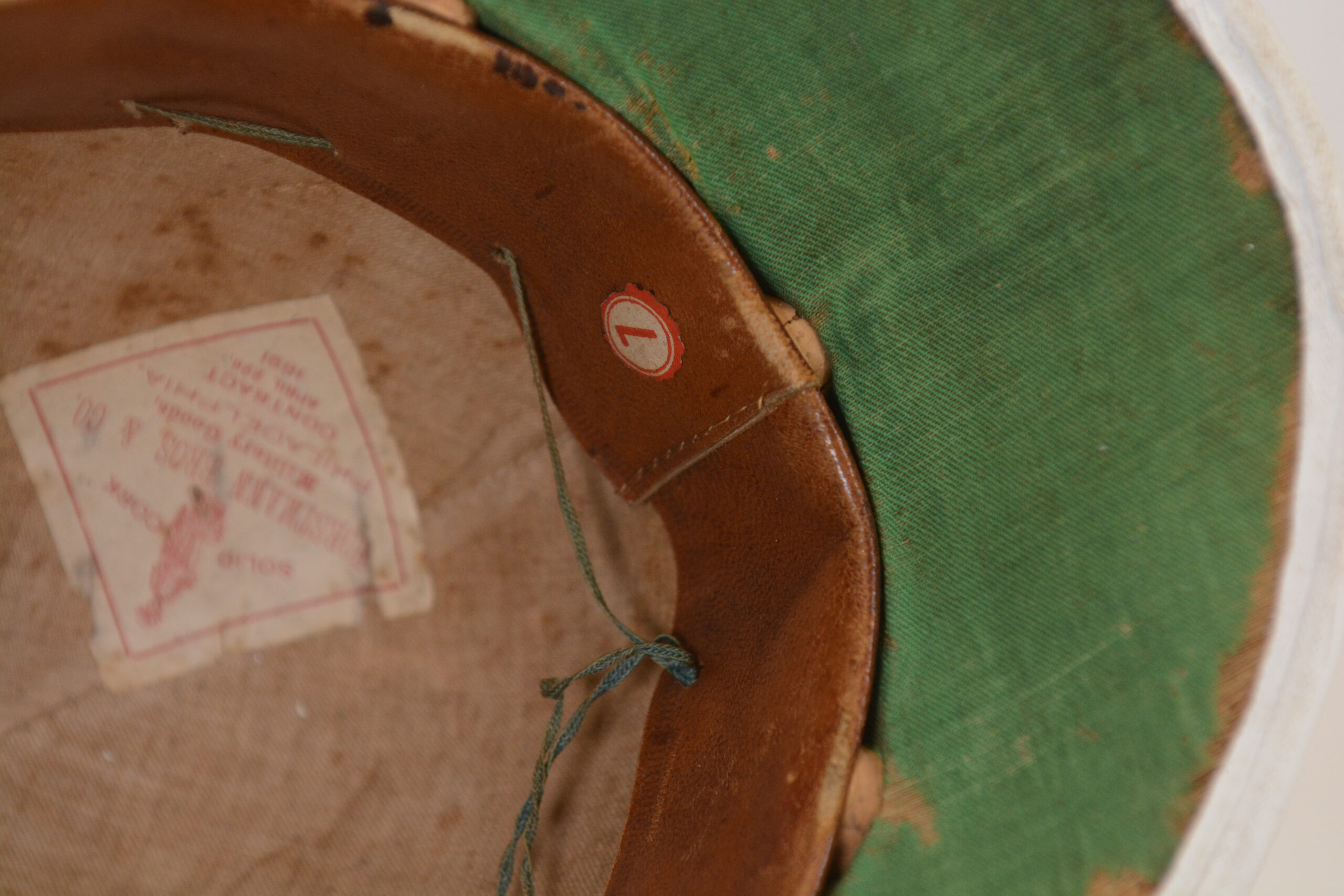Constructed from lightweight pressed felt and covered in white cotton drill, the helmet was designed to provide a smart, uniform appearance while being practical in warmer climates. The interior shows its period-appropriate leather sweatband, with wear consistent with age and service. Its overall preservation makes this an excellent piece for display, offering an authentic glimpse into the uniforms of America’s frontier and colonial-era infantry.
