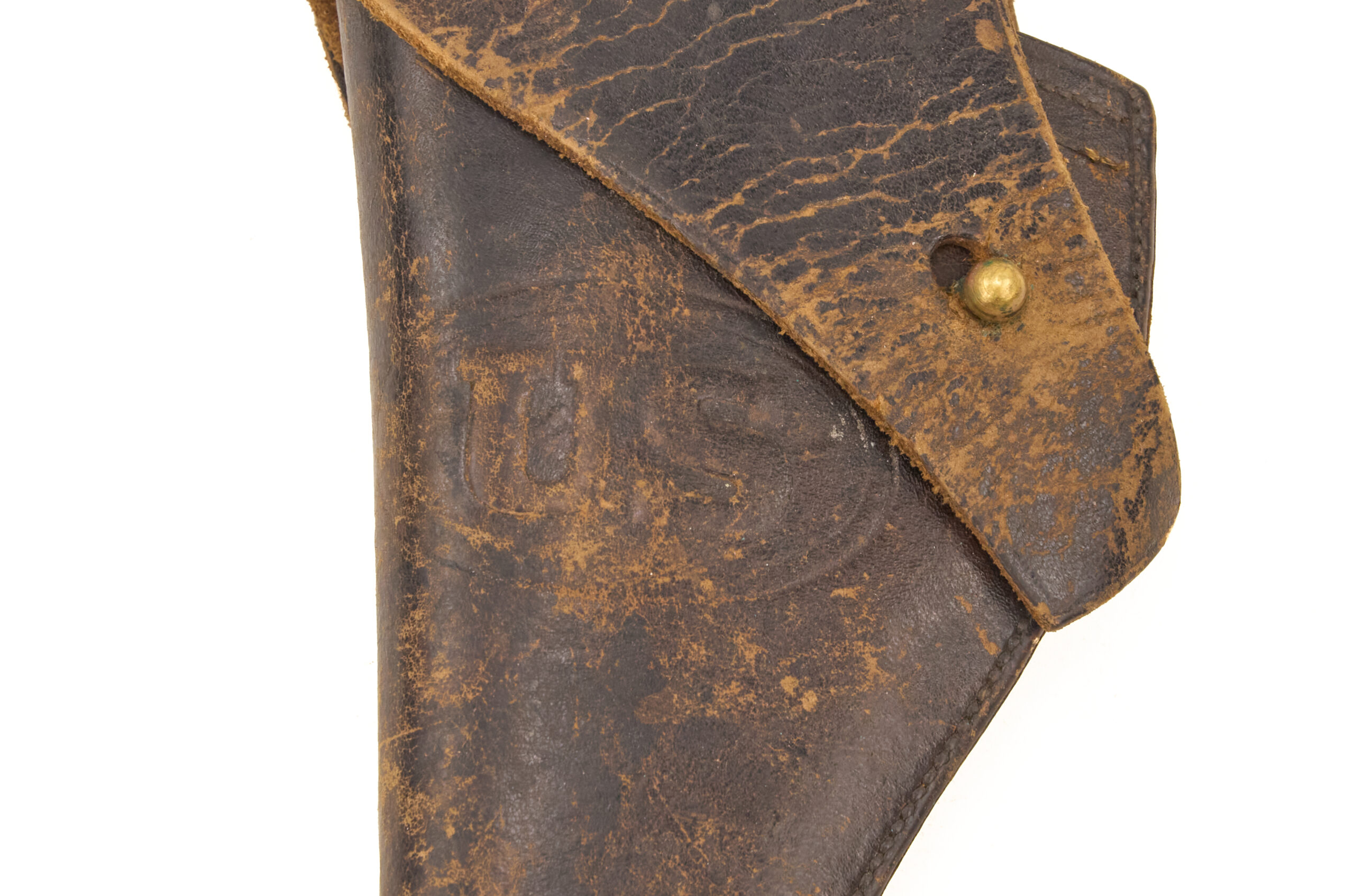 The front still retains a crisp US stamp, while the reverse shows the maker mark and inspector initials. This example also shows a missing bottom flap, a modification often encountered on service-used holsters. Soldiers commonly removed that lower section to improve dust and water egress in the field. As a result, the holster retains both strong display appeal and clear evidence of practical use.