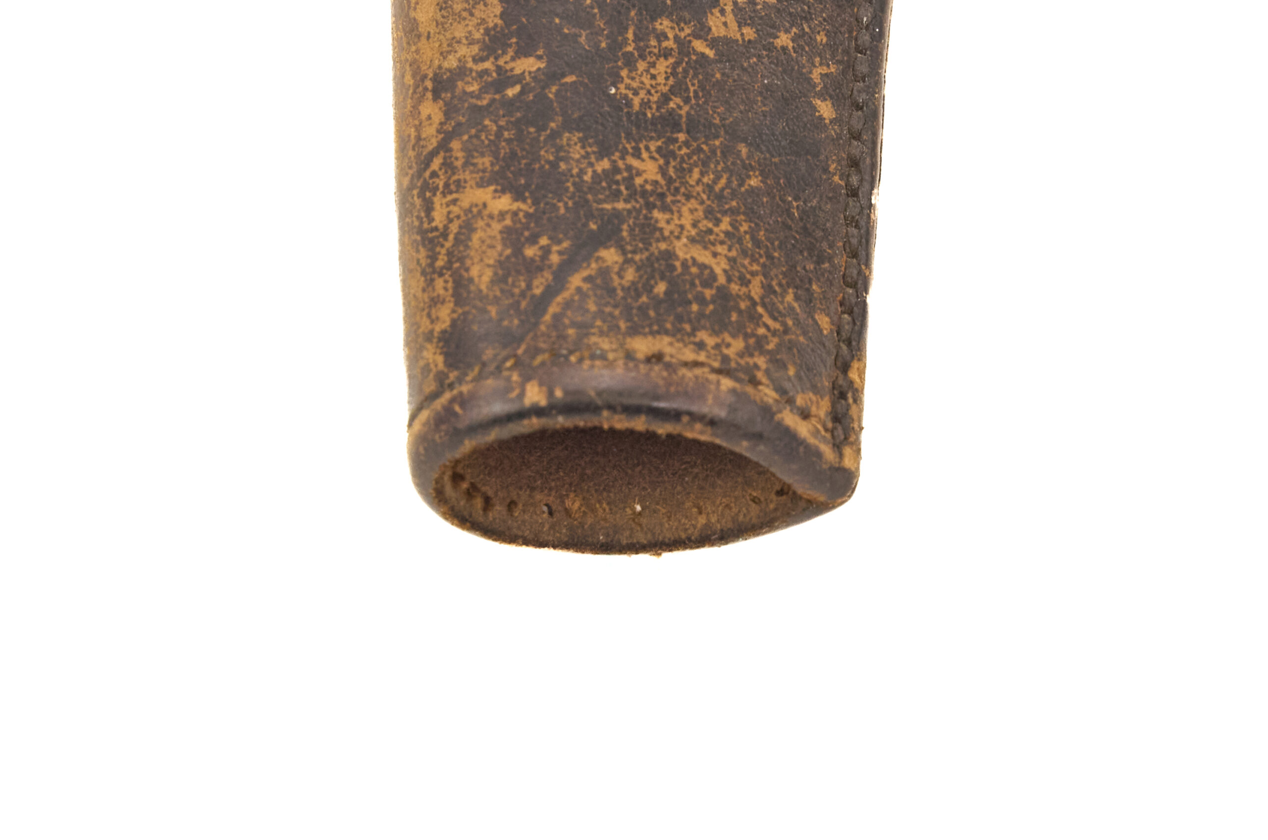 This holster shows signs of field use throughout. The leather is somewhat dry, though still flexible. Stitching remains tight, which helps the piece present well structurally. The brass and other hardware are in excellent condition. The front US stamp is still crisp and easy to read. The missing bottom flap is the main loss, but it is consistent with a known field modification seen on used military holsters.