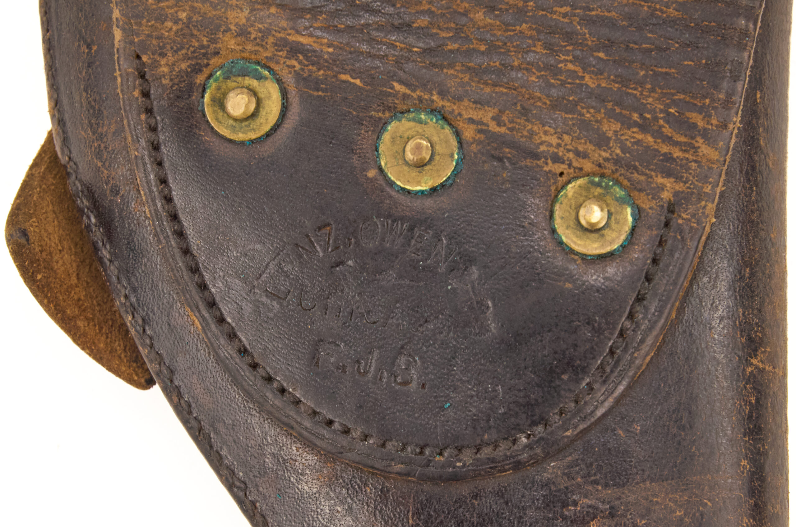 The U.S. Model 1892 holster belongs to the early generation of leather equipment adopted for the Colt .38 service revolver in the years surrounding the Spanish-American War. Period examples were made in black leather, and later pattern changes shifted details of finish and marking placement as the design evolved into the early 20th century. Lenz, Owen of Chicago was one of the known contract makers associated with U.S. military holster production in this era, and examples with clear maker markings remain desirable to collectors of American cavalry and revolver equipment. Comparable references note that black Model 1892 holsters were standard early examples, while later changes moved markings and shifted finish color on subsequent variants.