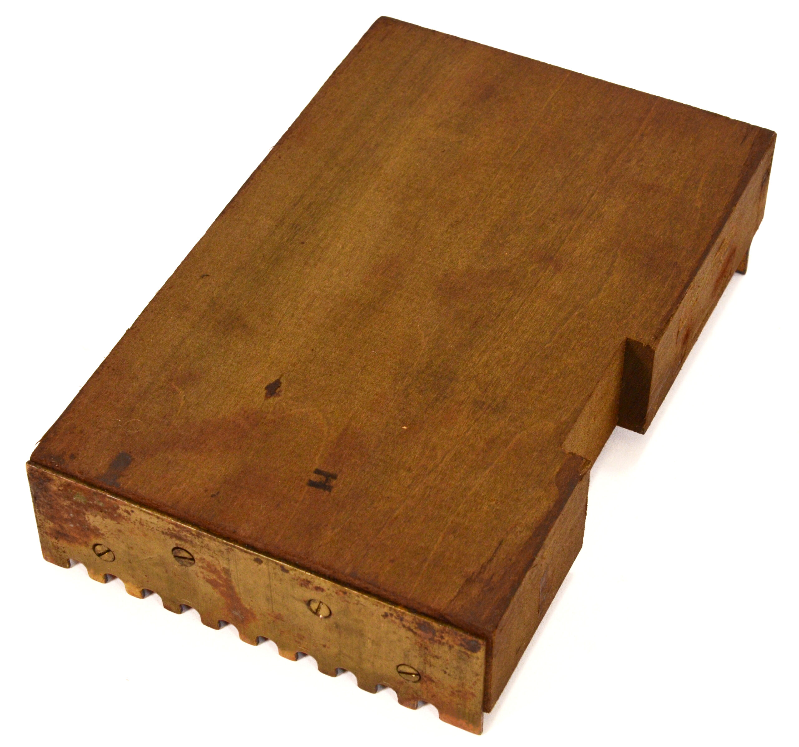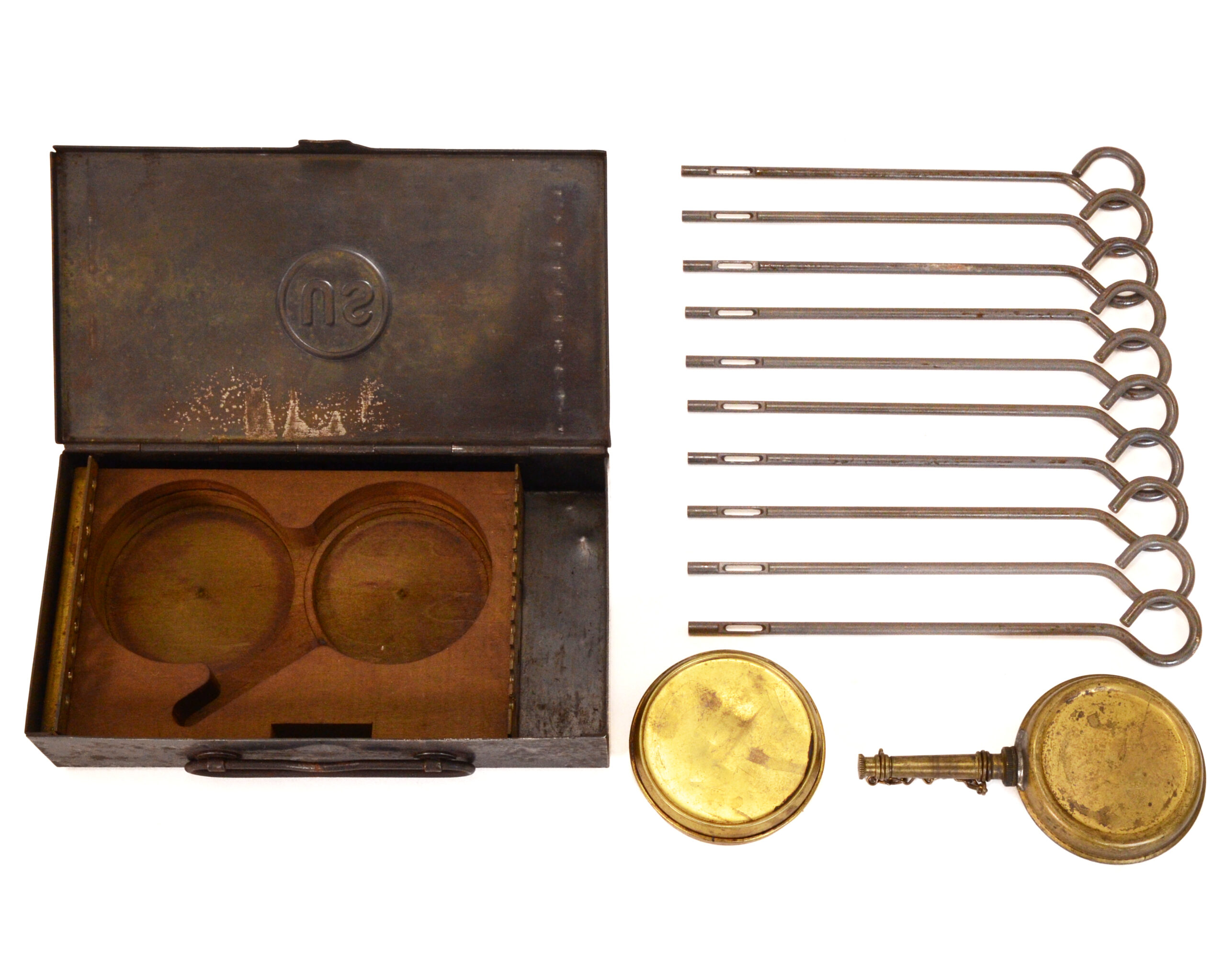 The kit contains the following components: multiple parkerized steel cleaning rods, a brass oiler, a grease container, and a well-preserved wooden organizer insert (stamped with an inspector’s “H”). Missing from this example are the disassembly tool (takedown tool) and the brass bore brushes, which were part of the original full complement.