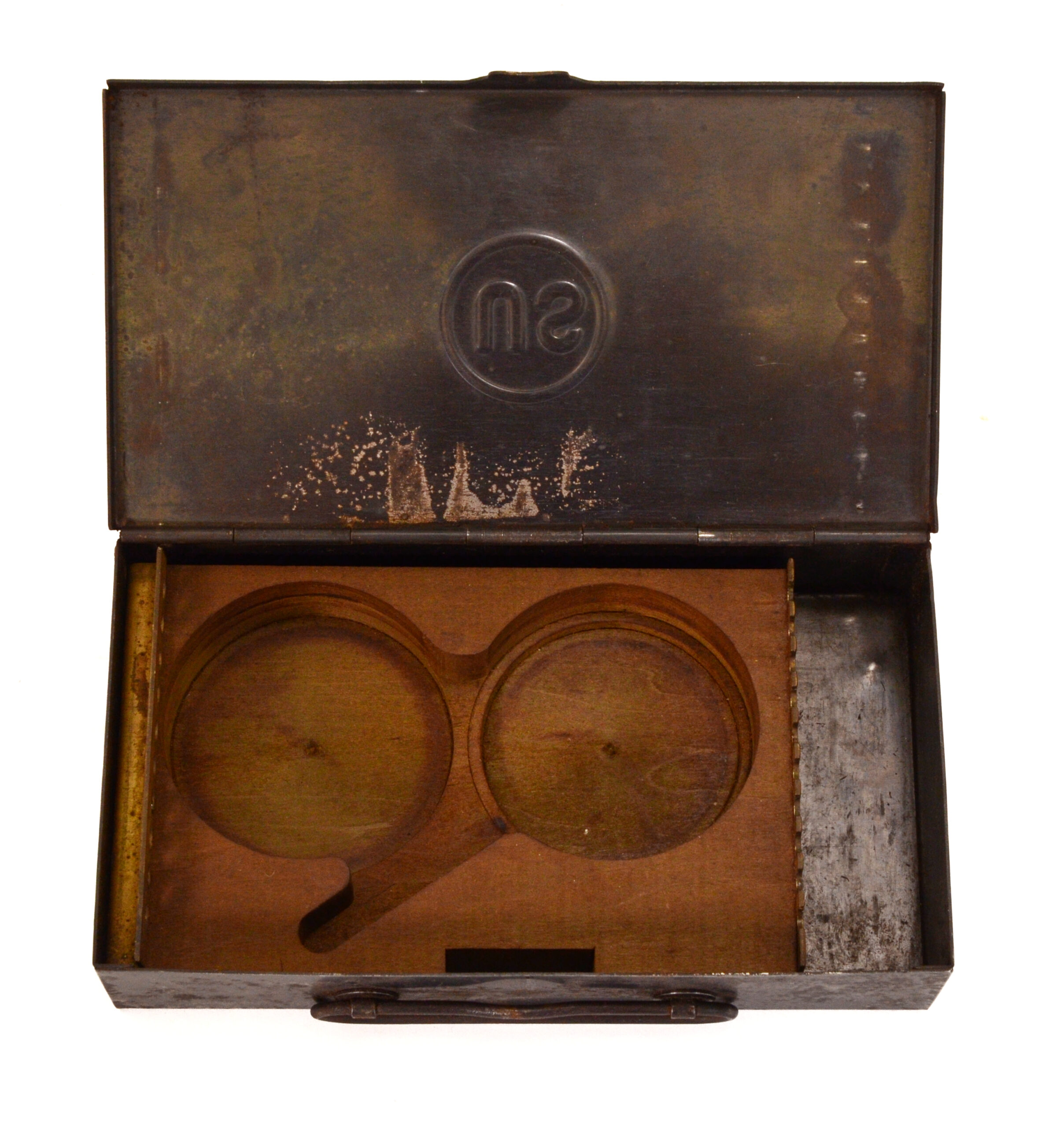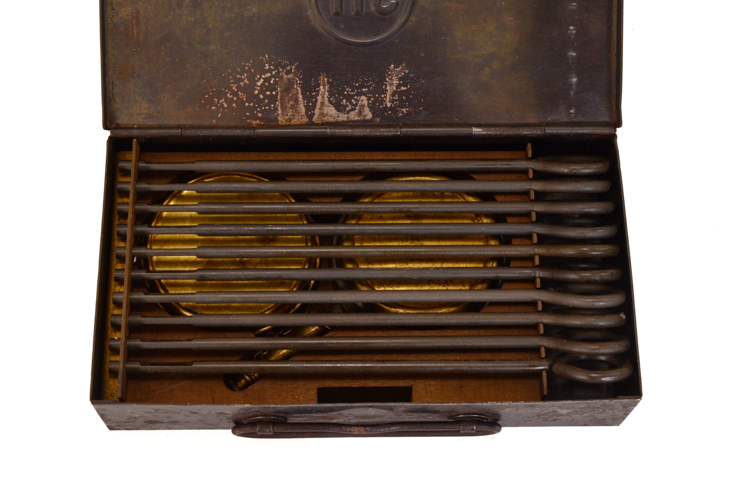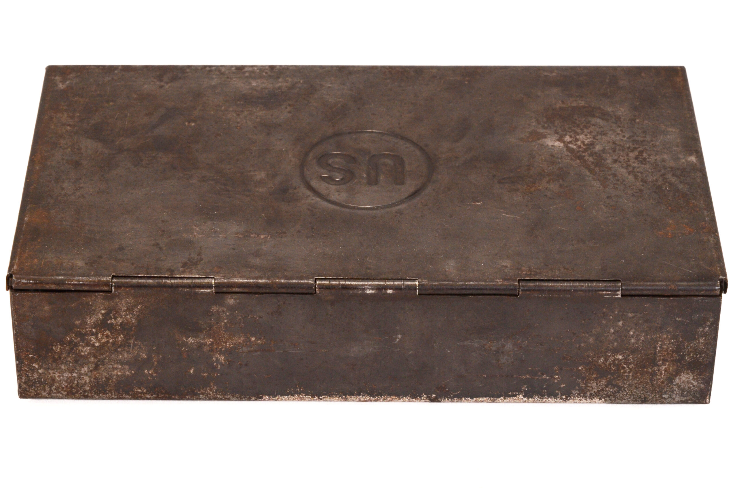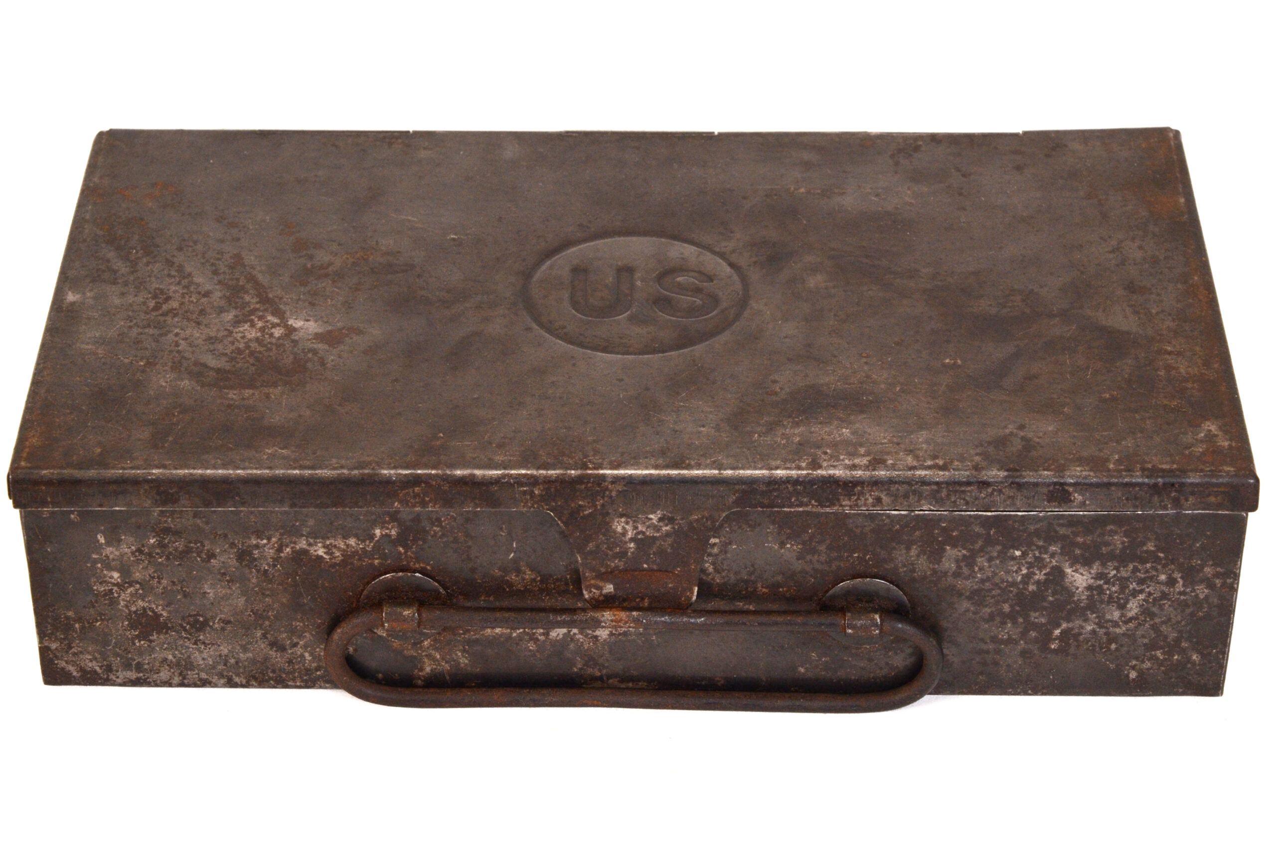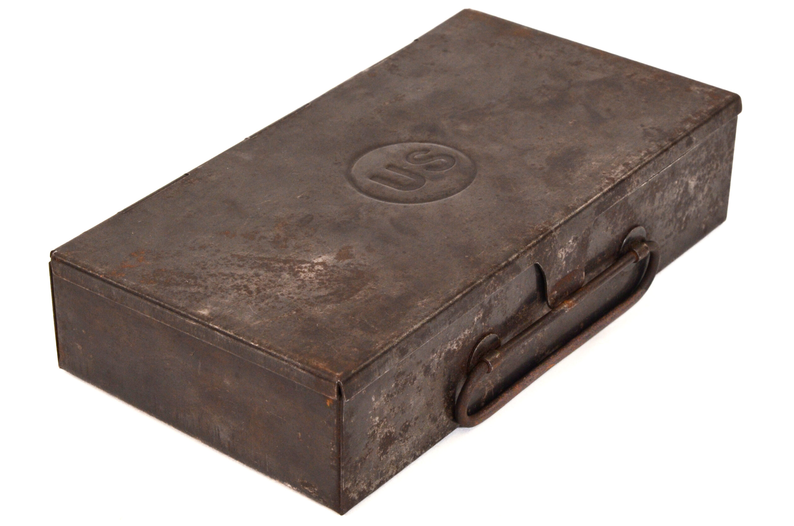 Offered is an original U.S. WWII-era M1912 squad weapon cleaning kit, designed for use with the M1911 .45-caliber pistol. This durable, field-issue kit comes in the correct U.S.-stamped 9″ × 5″ × 2″ blued steel box, showing honest service patina and locking functionality.