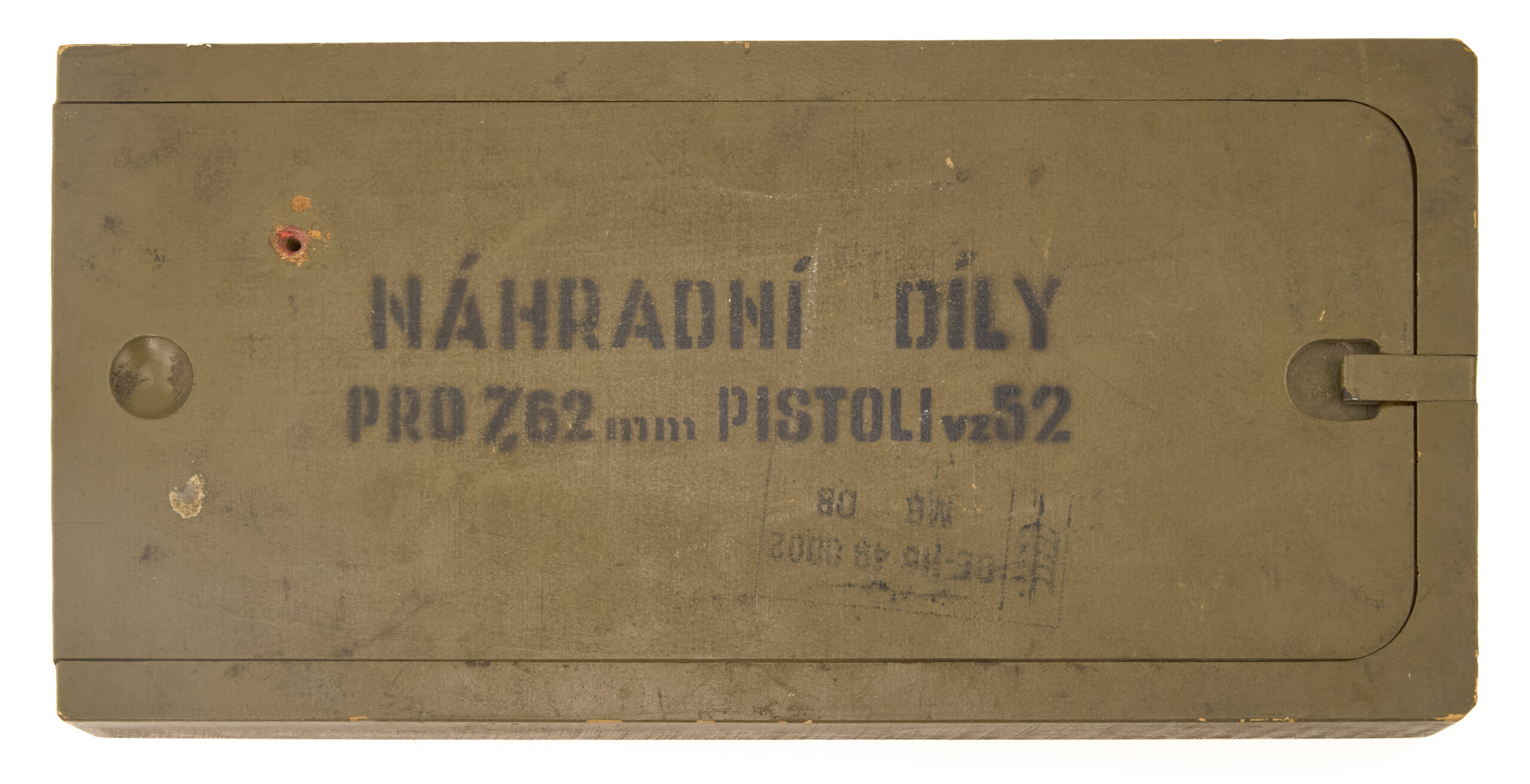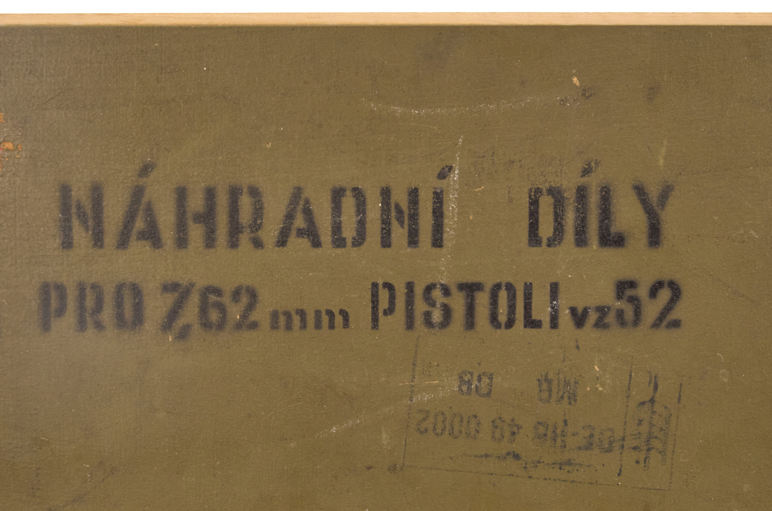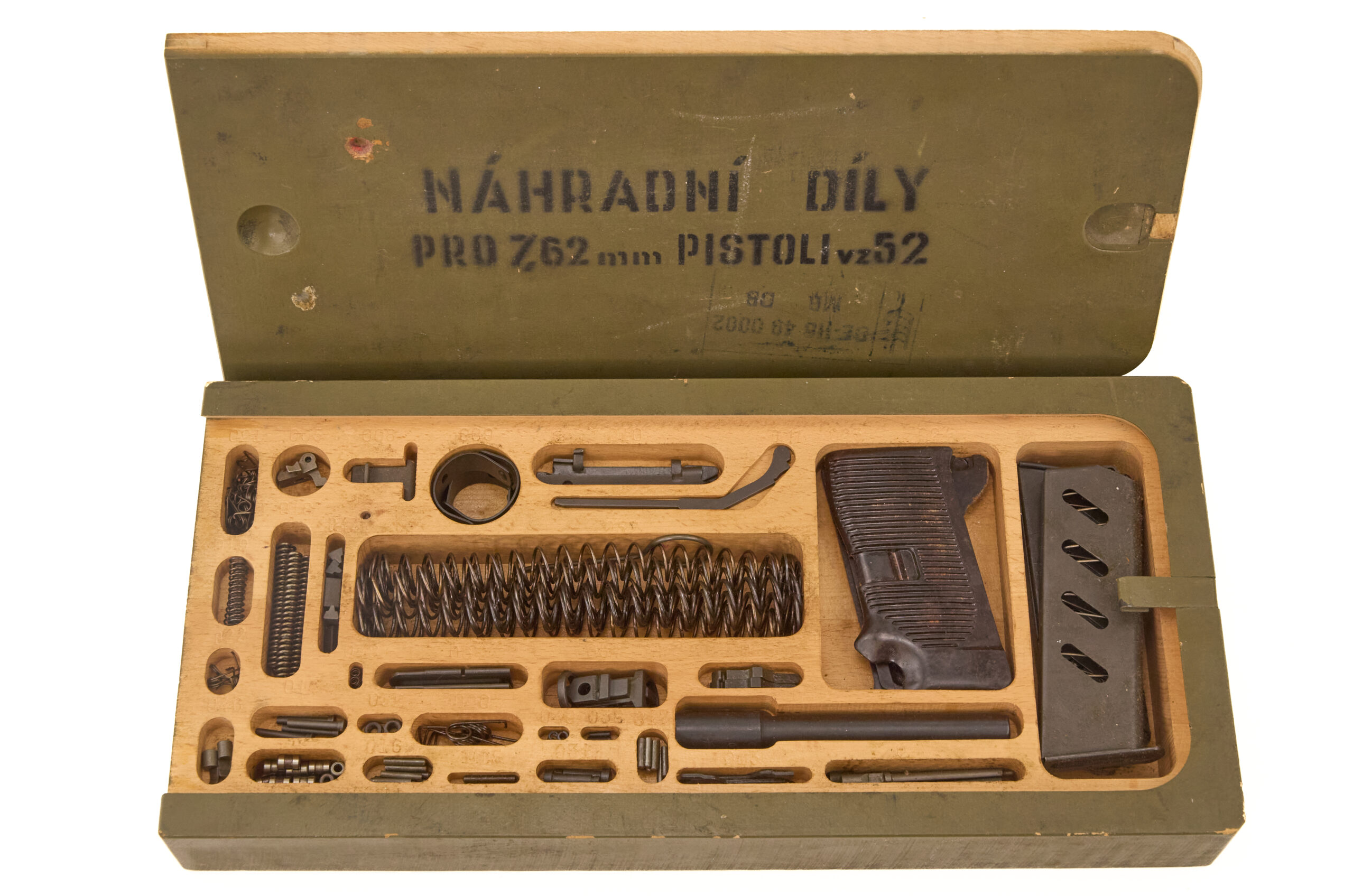 That marking identifies the box as spare parts for the 7.62mm VZ52 pistol. In addition, the inside of the lid features a printed component inventory panel that corresponds to the numbered wells in the box.