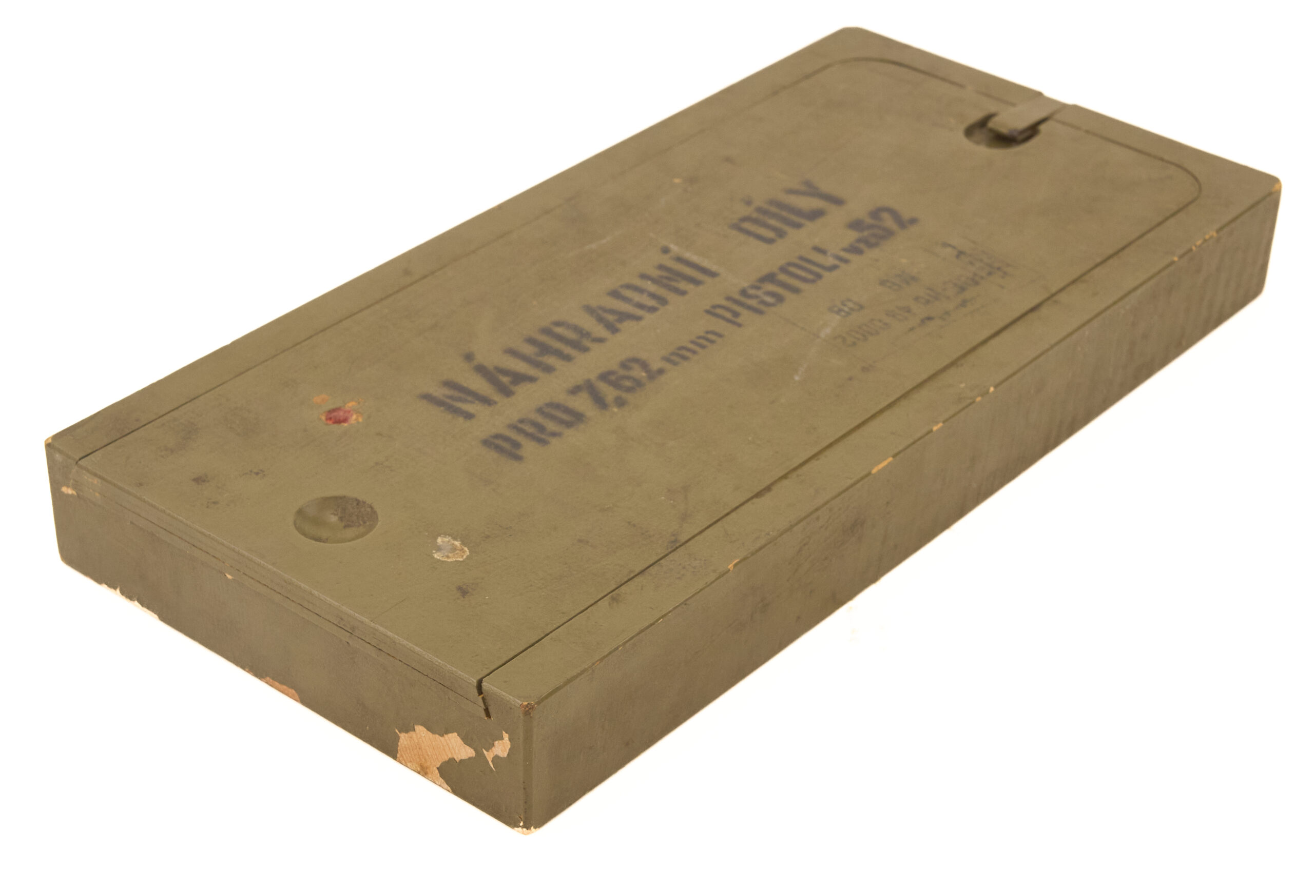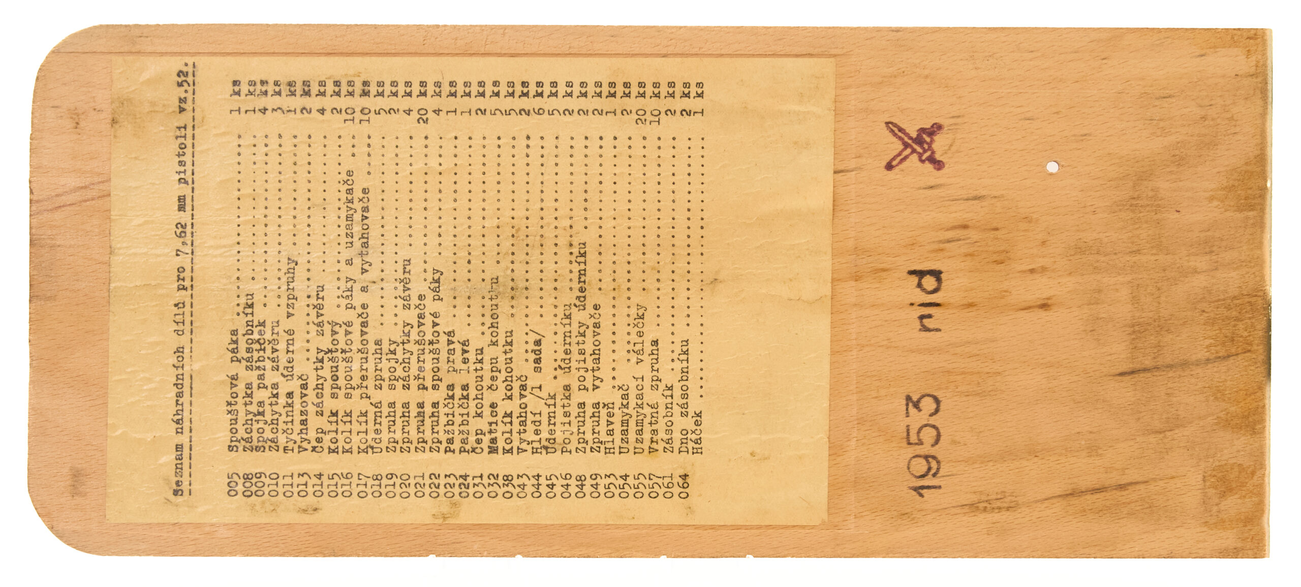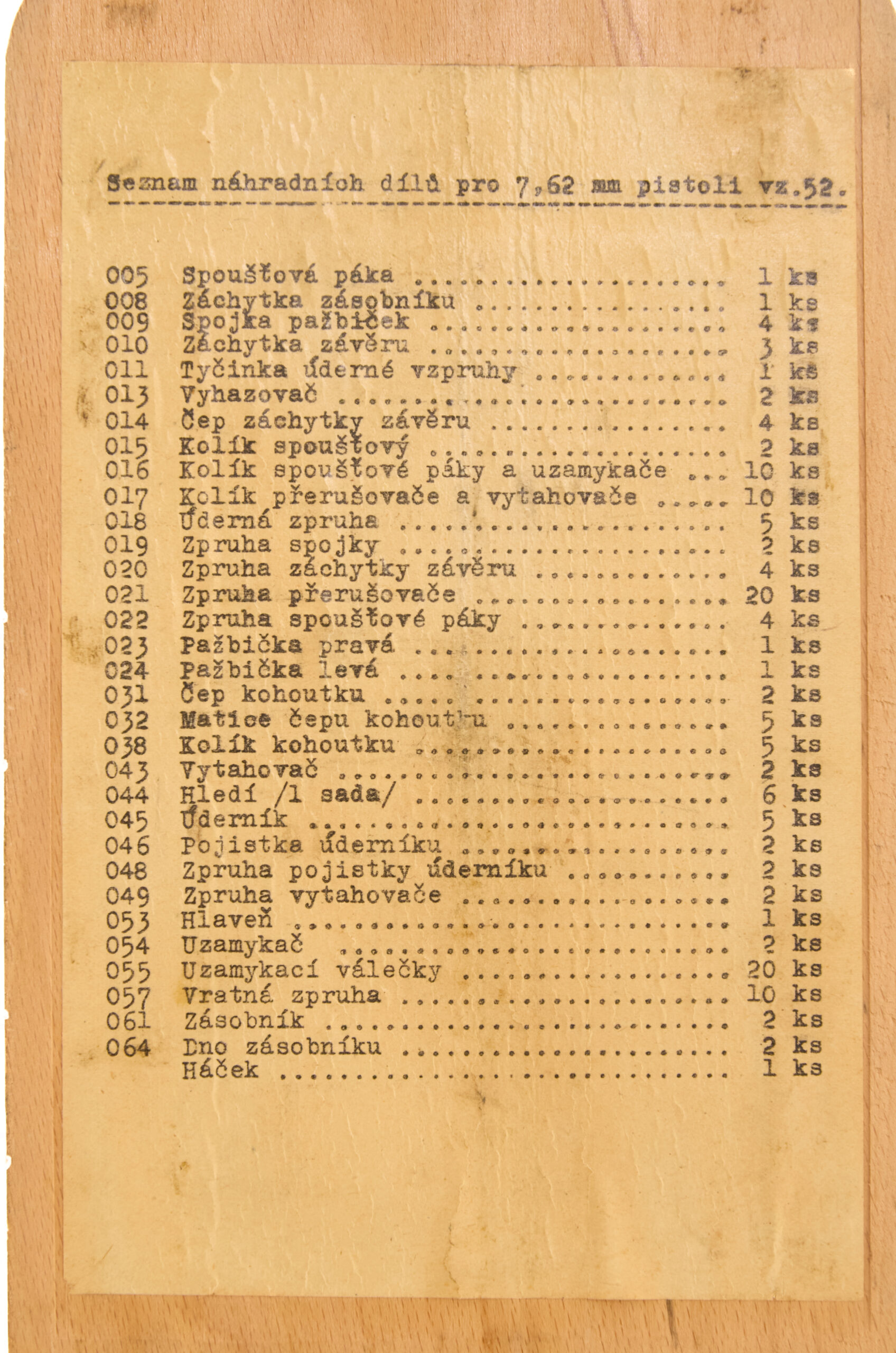 That marking identifies the box as spare parts for the 7.62mm VZ52 pistol. In addition, the inside of the lid features a printed component inventory panel that corresponds to the numbered wells in the box.
