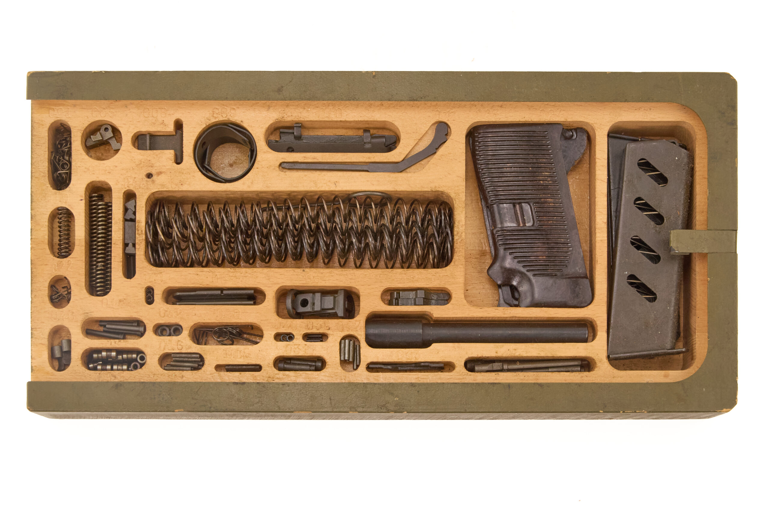 The VZ52 armorer’s kit shows how Czechoslovakia supported its service pistols during the Cold War era. Rather than issue loose replacement parts, the military packed the needed components into a fitted wooden case with numbered compartments. As a result, an armorer could identify parts quickly, keep them organized, and replace worn components with minimal delay.