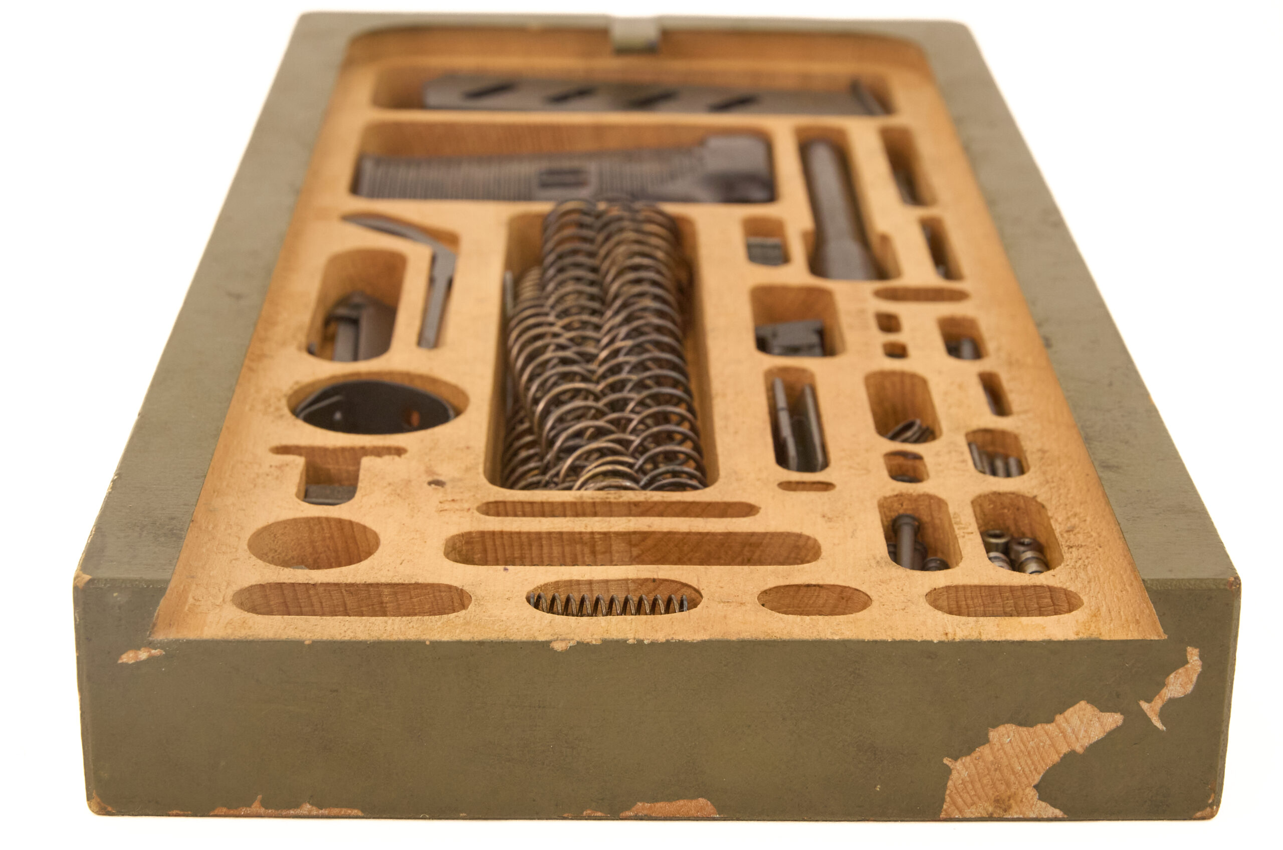 The kit is housed in its original Baltic birch storage box with a green painted exterior. The box uses a dovetailed sliding lid and a spring latch retention system, which gives it a durable and practical military design. Inside, the box contains individually numbered compartments sized for specific parts.