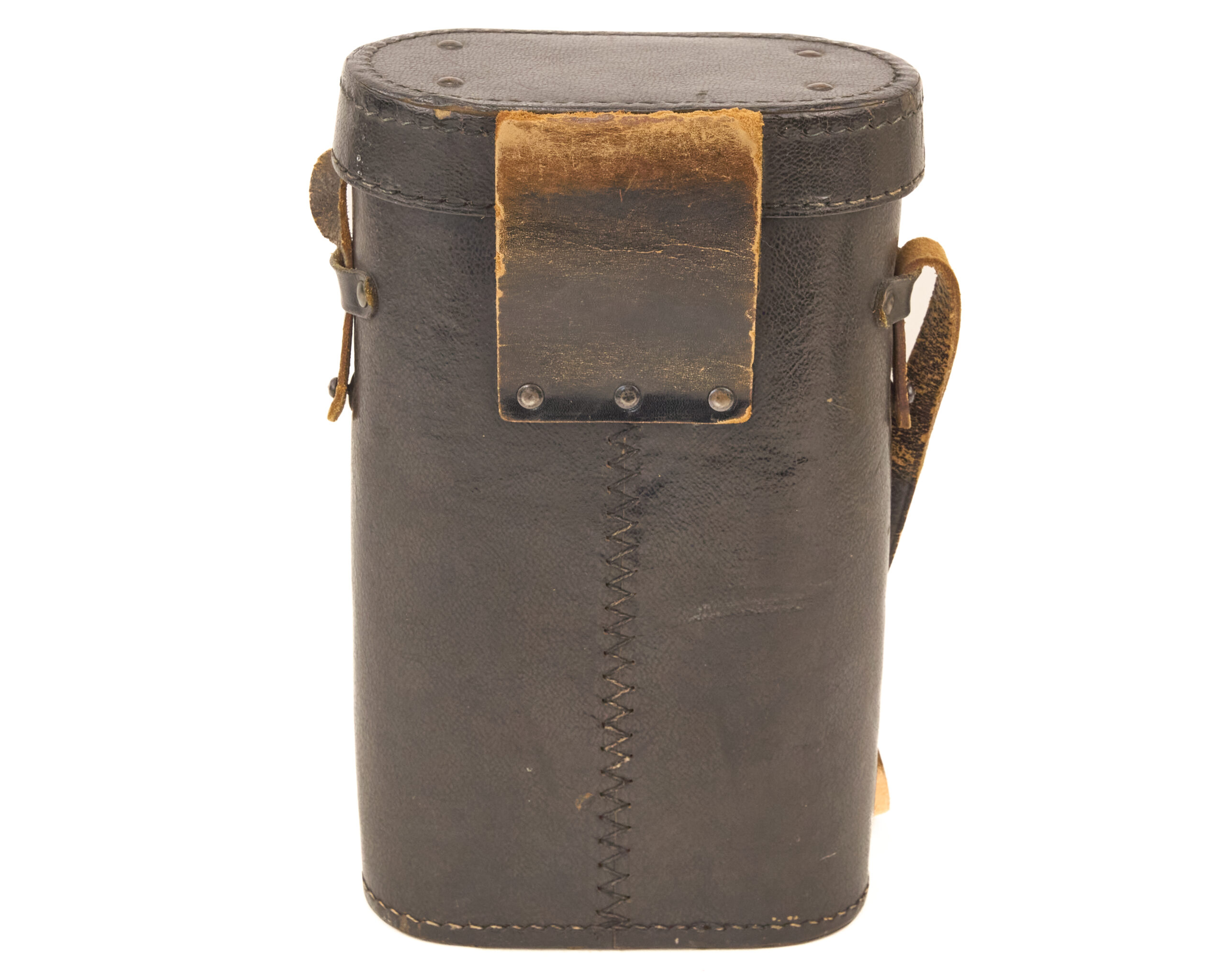 This set is in excellent condition overall. The glass is clear, which is one of the most important points on binoculars of this type. The arms articulate properly, and the set retains its original case and strap. The leather case is in excellent condition, while the binocular neck strap remains in very good condition. The optics leather shows signs of previous maintenance to keep it affixed. The case-mounted denazified trench art visor cap badge remains a notable part of the set’s character.