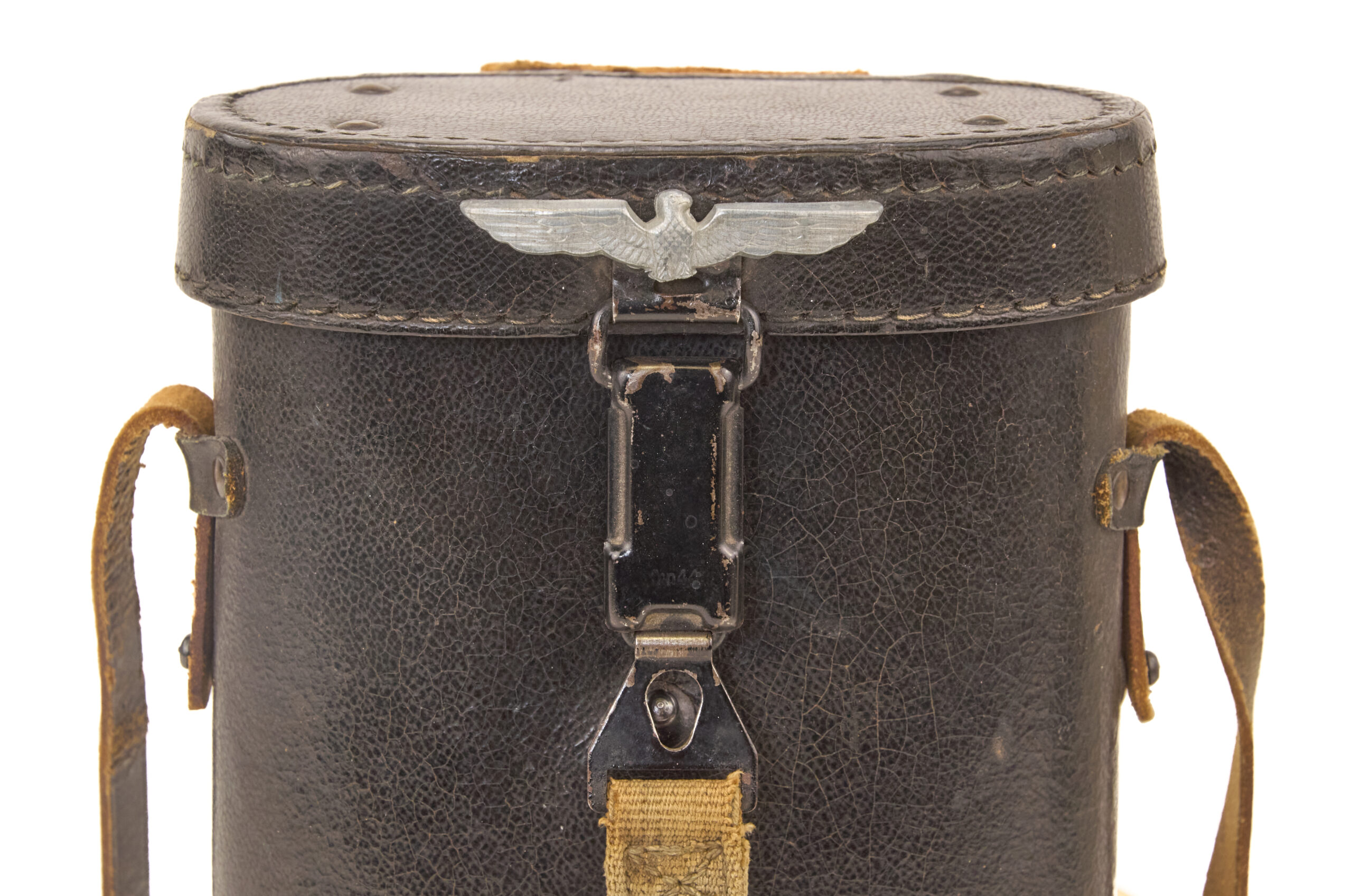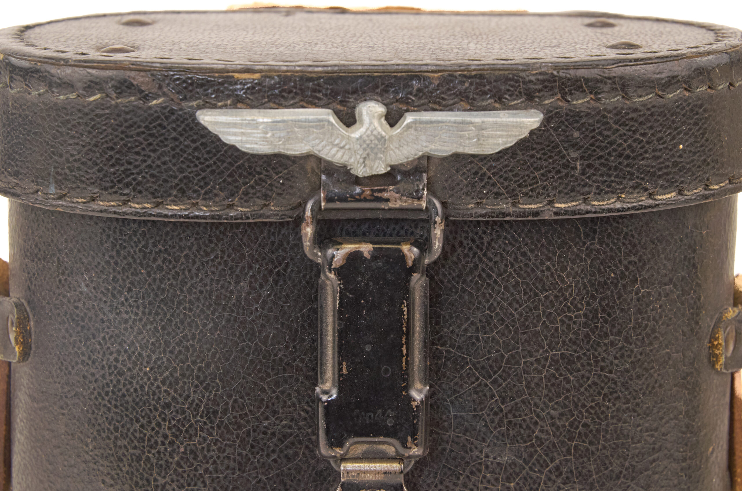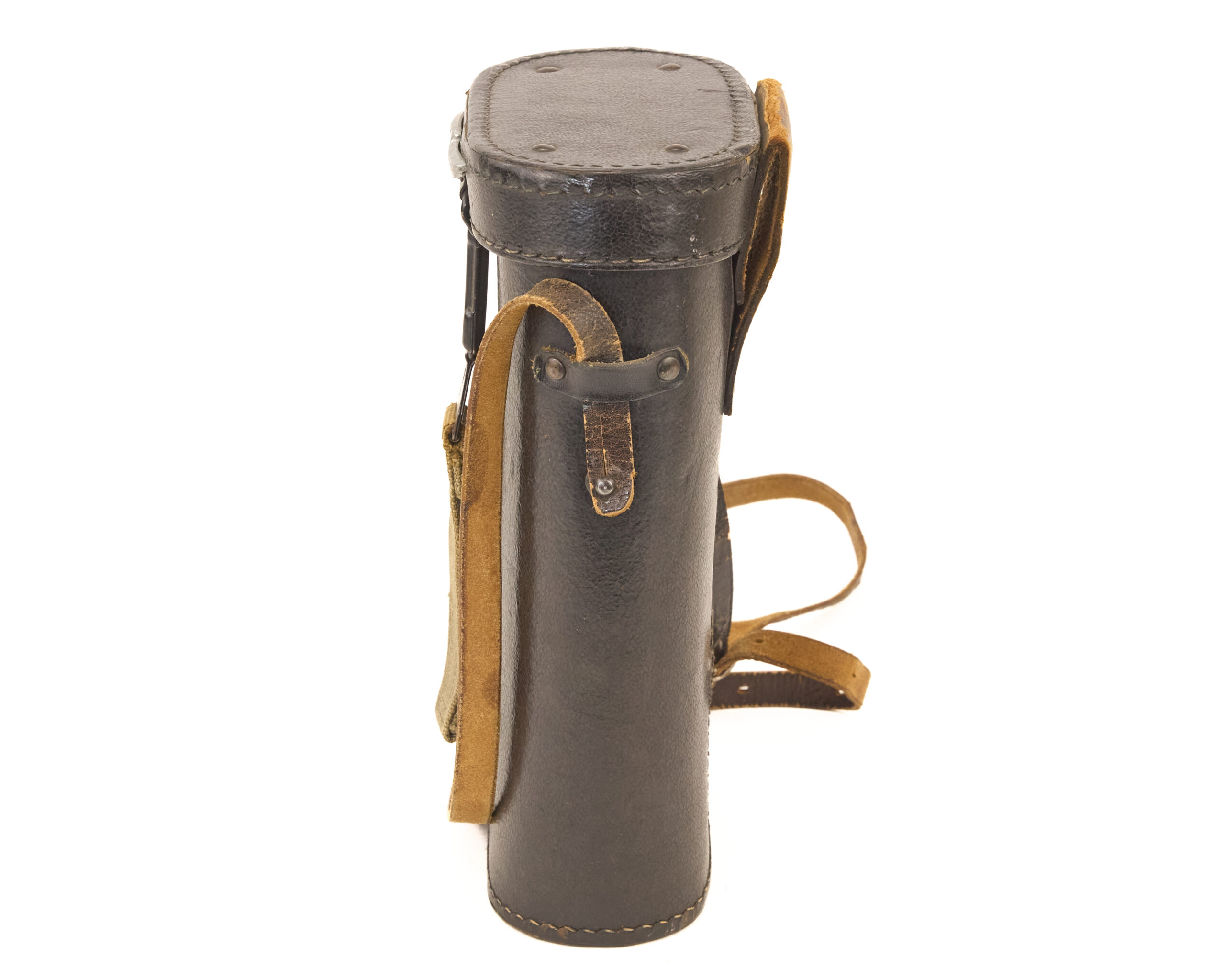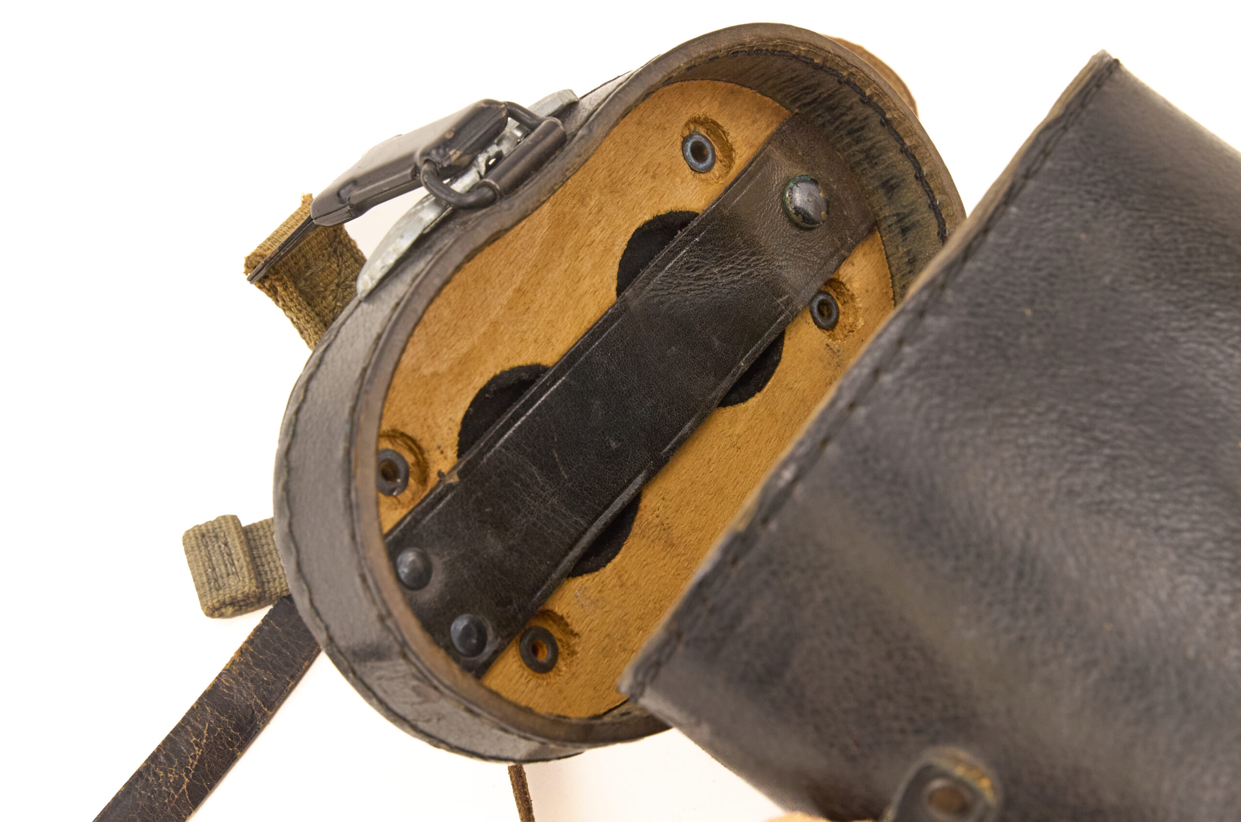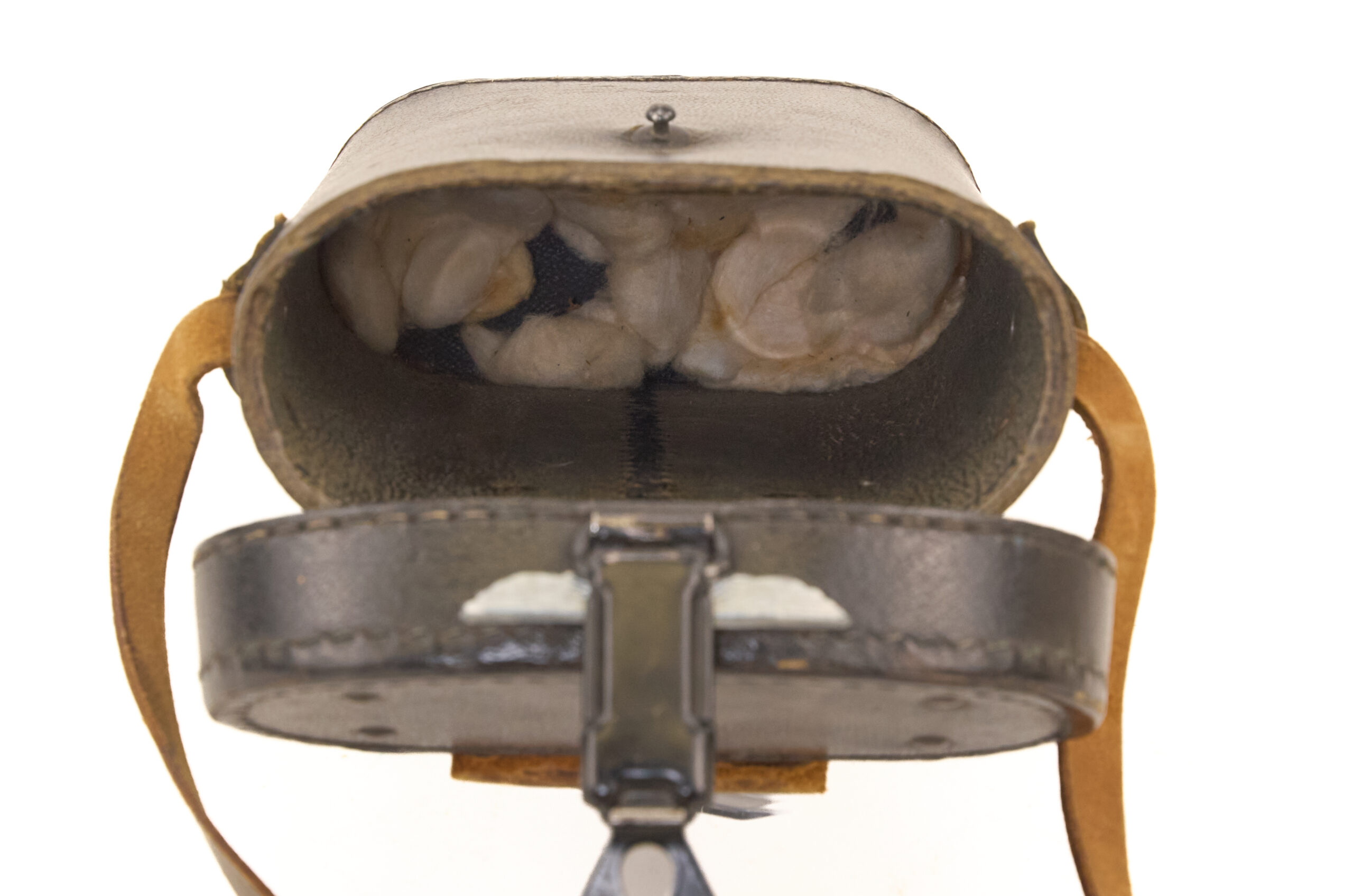This set is built around the classic 7×56 field glass pattern, with large objective lenses intended to provide strong light transmission and a bright image in field conditions. The binocular body retains its leather covering, though that leather shows signs of previous maintenance done to keep it secure. The arms still articulate properly, which is an important point on a large binocular set of this type. The neck strap for the binoculars is present and remains in very good condition. The original leather case is also included, and it remains in excellent condition overall. On the case lid, a denazified trench art visor cap badge has been affixed over the lens area, adding a distinctly period post-use alteration.