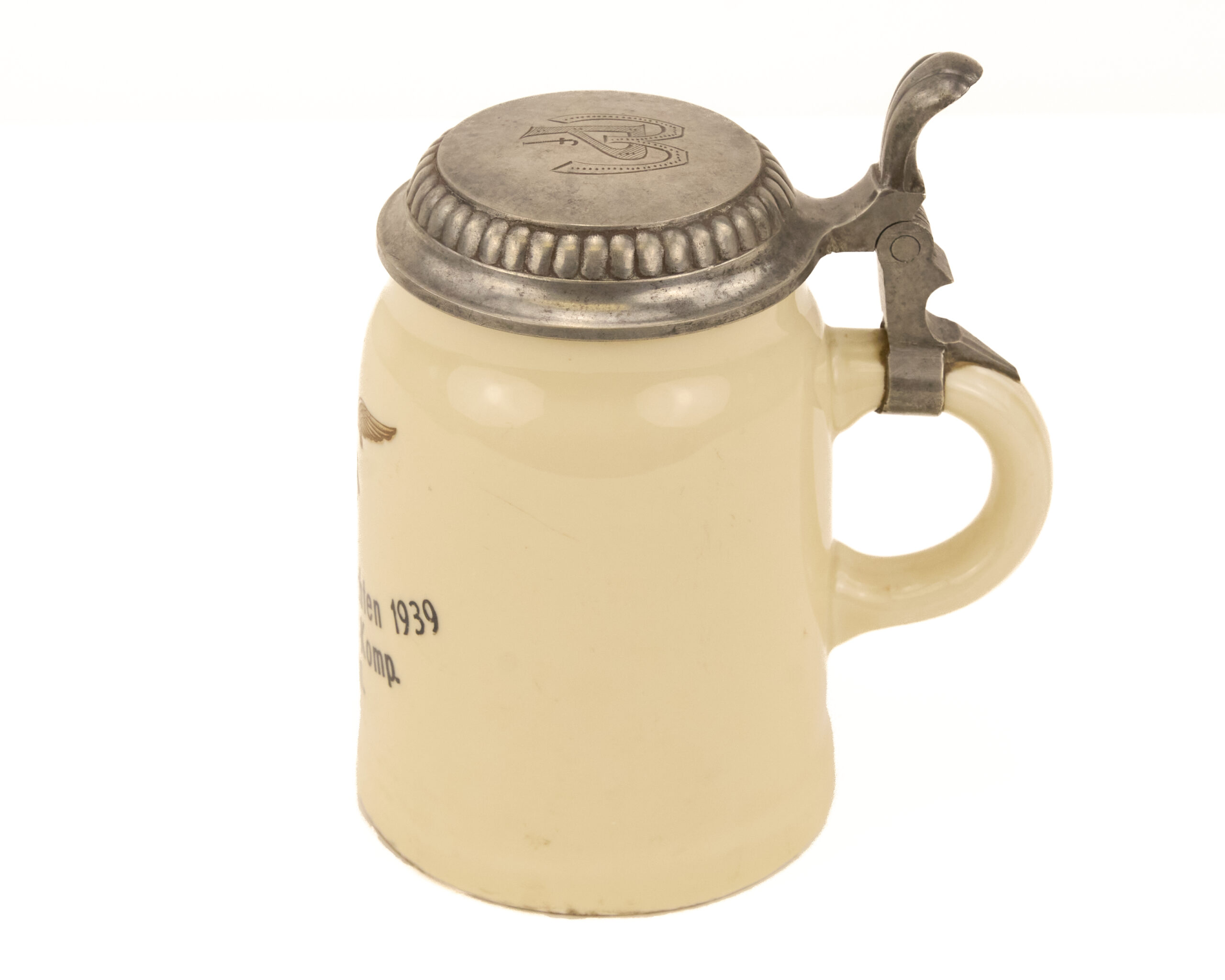 This example presents well overall. The ceramic body appears clean and displays strongly, while the gilt Luftwaffe eagle remains visible on the front. The inscription is legible and retains good contrast. The pewter lid shows mild age and handling wear consistent with an original period piece, and the engraved initials remain clear. As a whole, the stein has the look of an authentic service-era commemorative object that has survived with solid display presence and honest age.