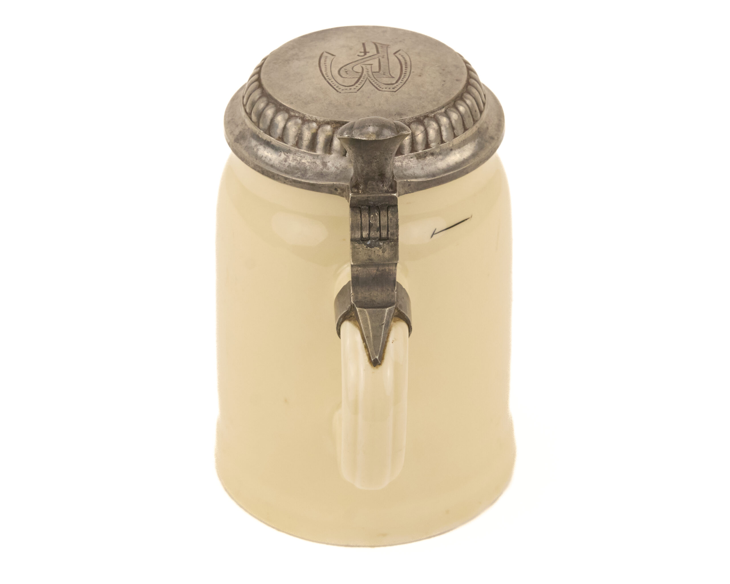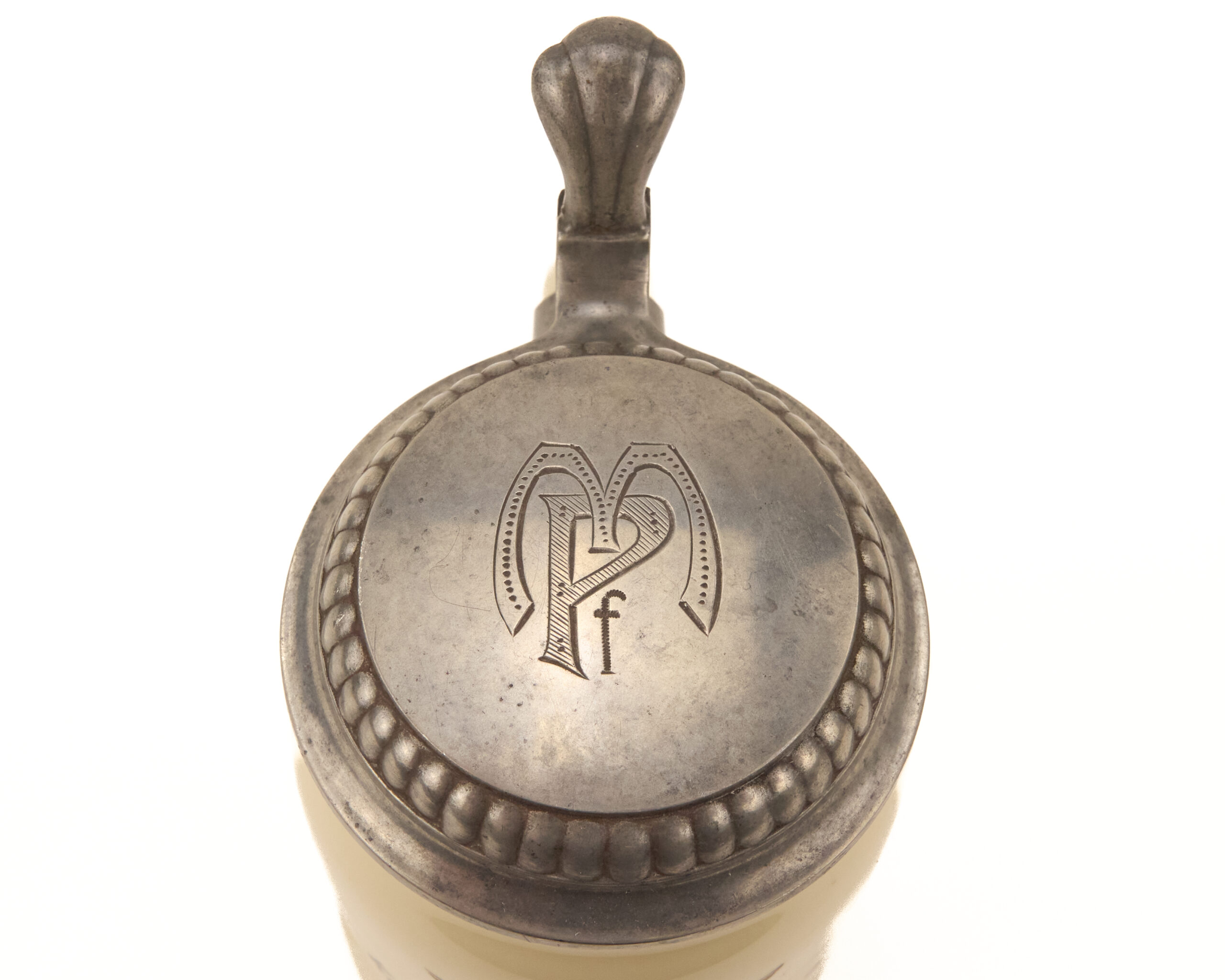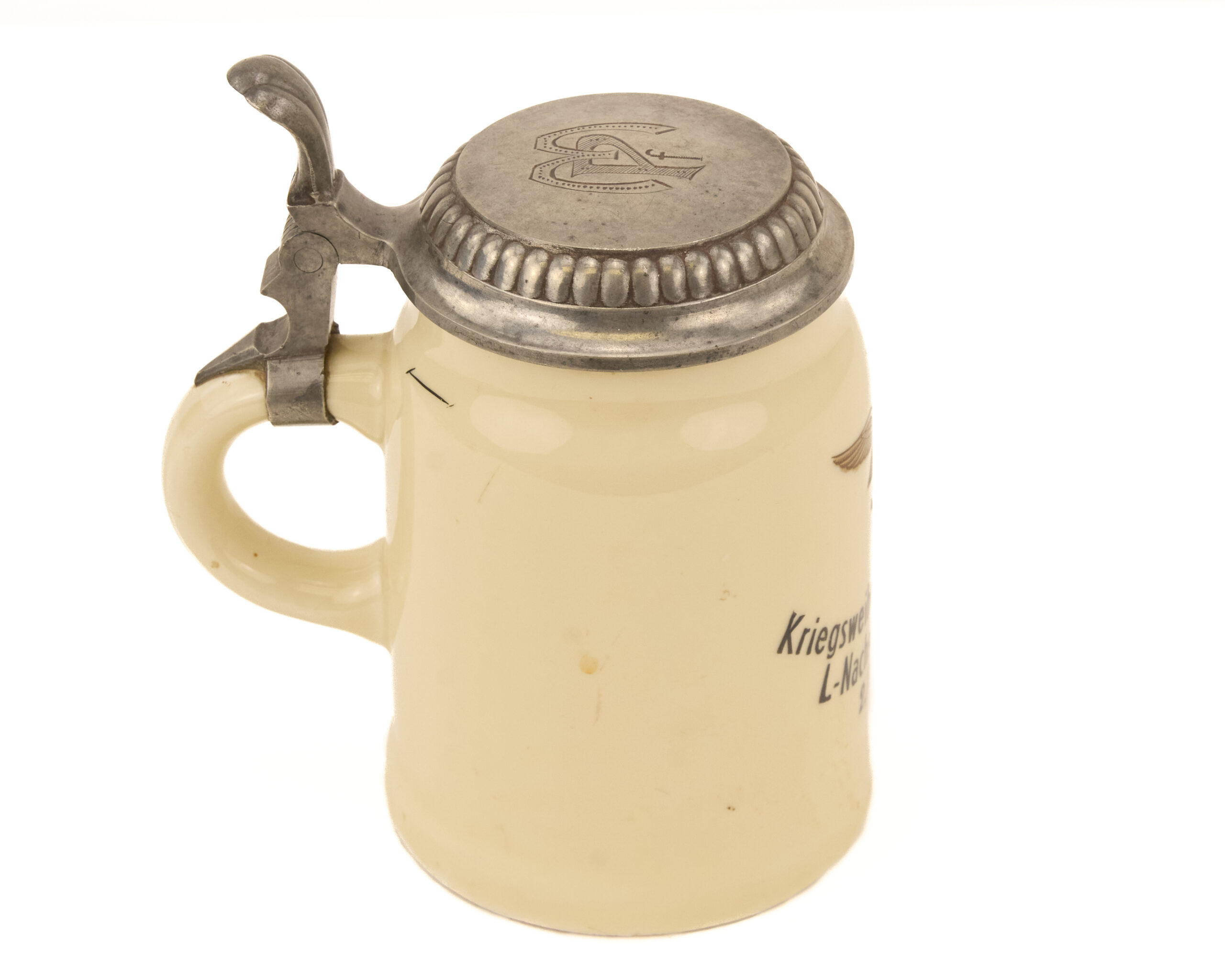 The stein has a ceramic body with a pewter lid and thumb lift in a classic German commemorative format. The lid shows mild embellishment around the rim, and the engraved initials MPf appear on the top. On the body, the gilt Luftwaffe eagle sits on the presentation side, opposite the handle, with the inscription placed neatly beneath it. That layout gives the piece a strong display face and makes the dedication easy to read. The overall design follows the familiar private-purchase and presentation stein tradition seen in German military and veterans’ culture, but the military inscription gives it a sharper wartime identity.