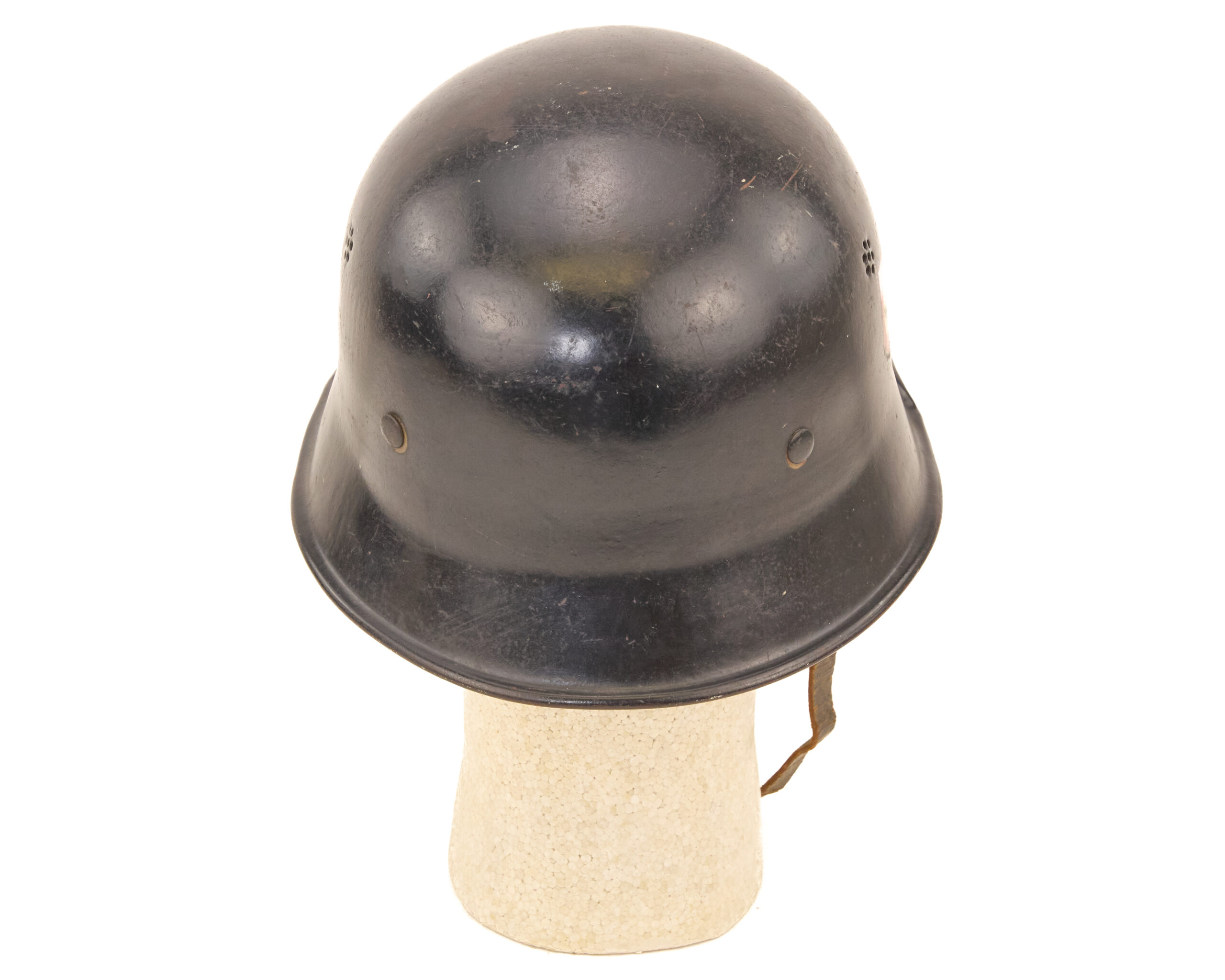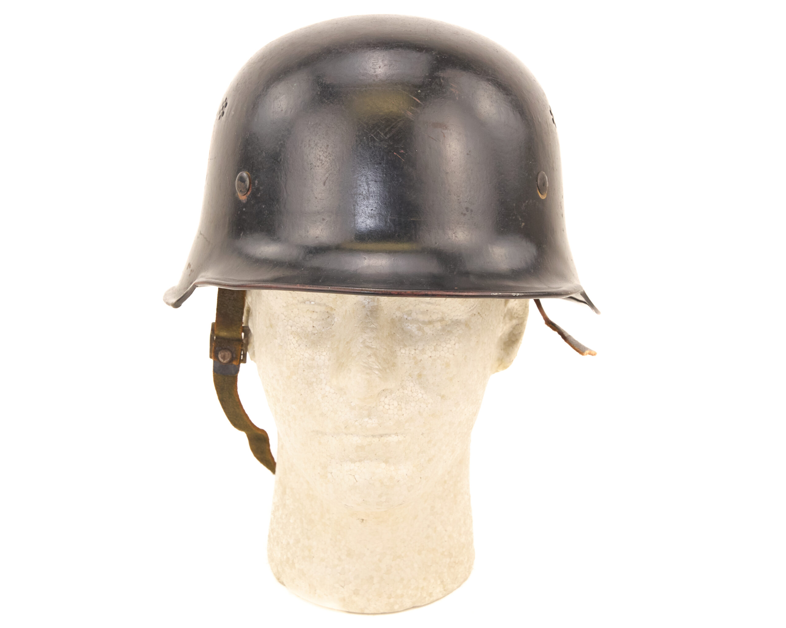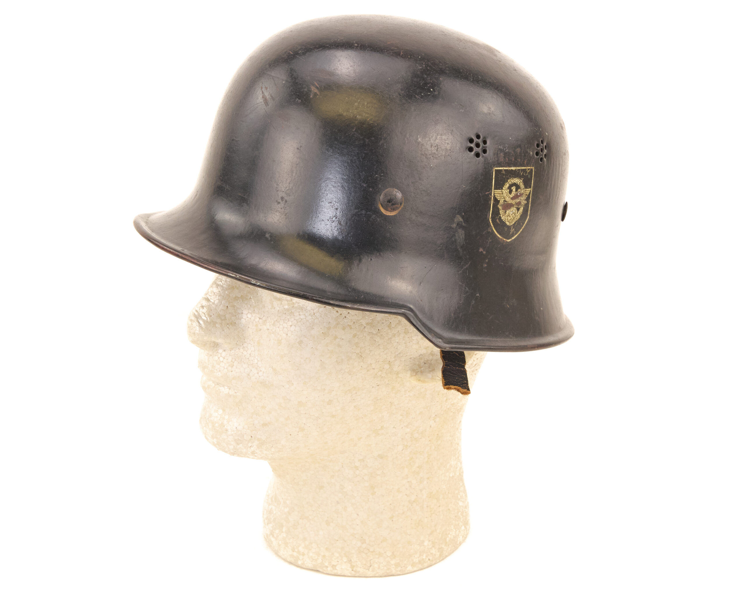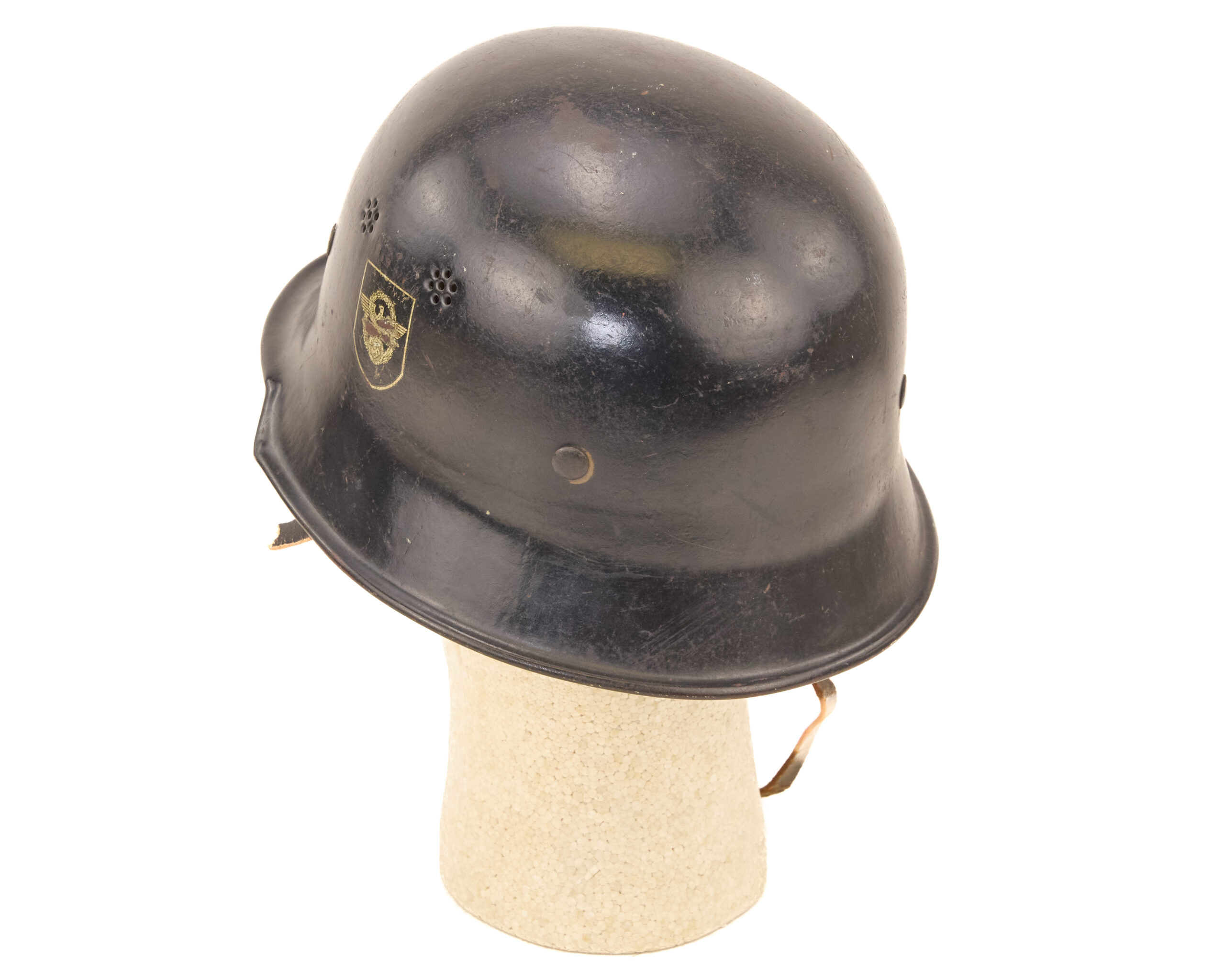 The M34 helmet belongs to the family of German civic, police, and auxiliary service helmets that ran alongside the more familiar combat steel helmets of the period. In fire police use, these helmets served the Feuerschutzpolizei, the fire protection police branch that combined firefighting and emergency service functions within the broader wartime police structure. That role gives these helmets a different historical feel from front-line military pieces. They represent the internal service and civil defense side of the German wartime system rather than battlefield use alone.