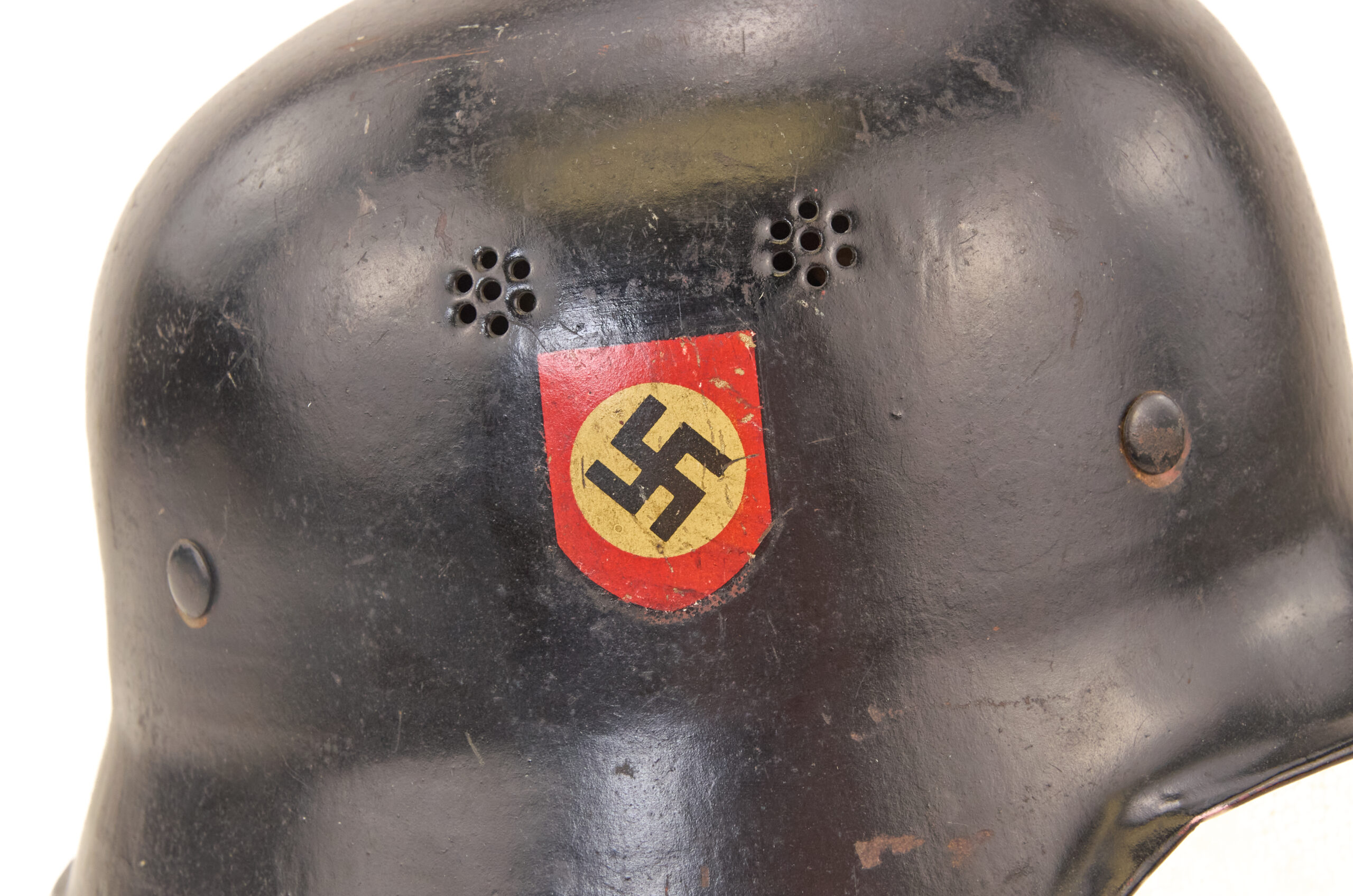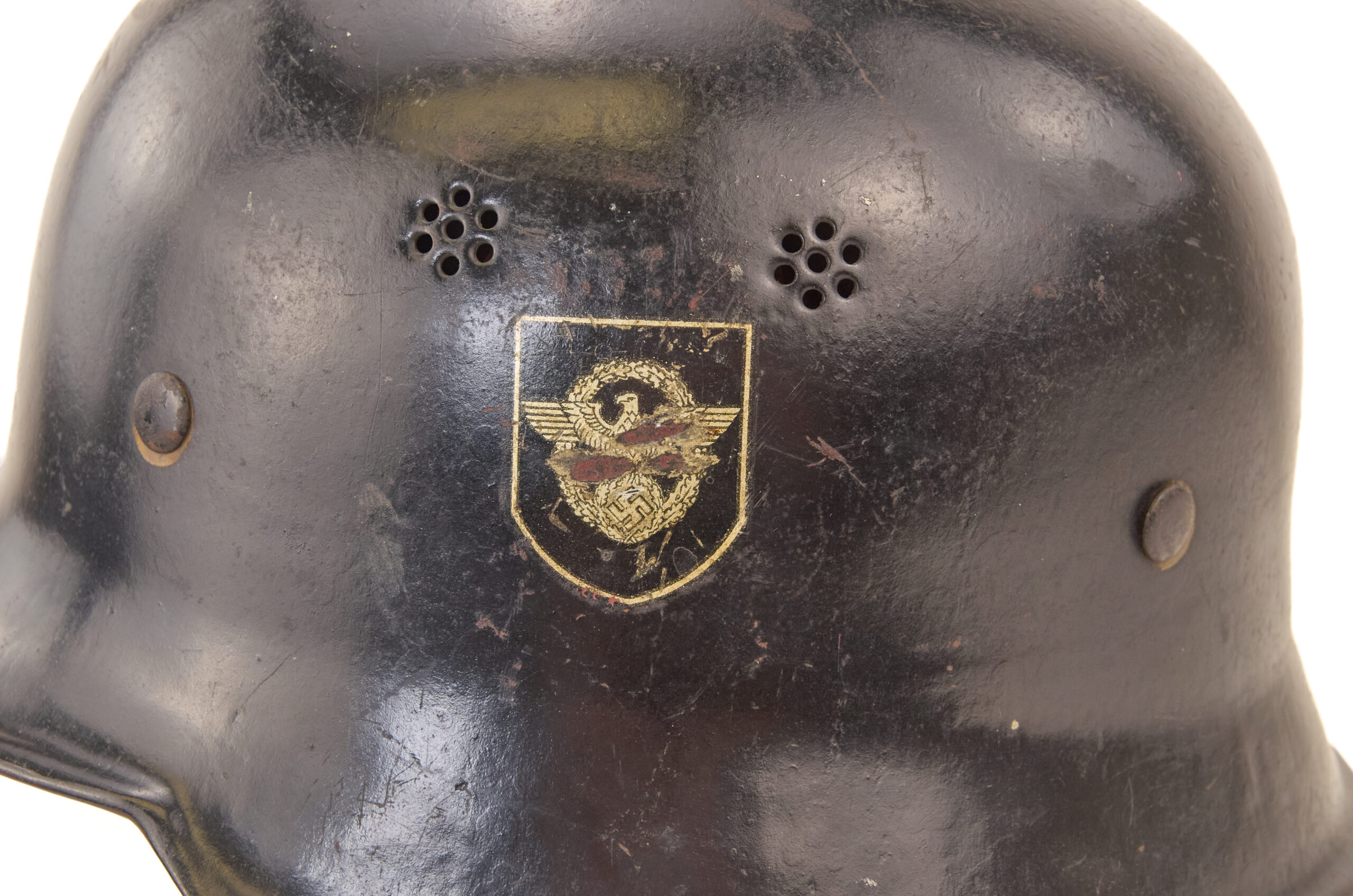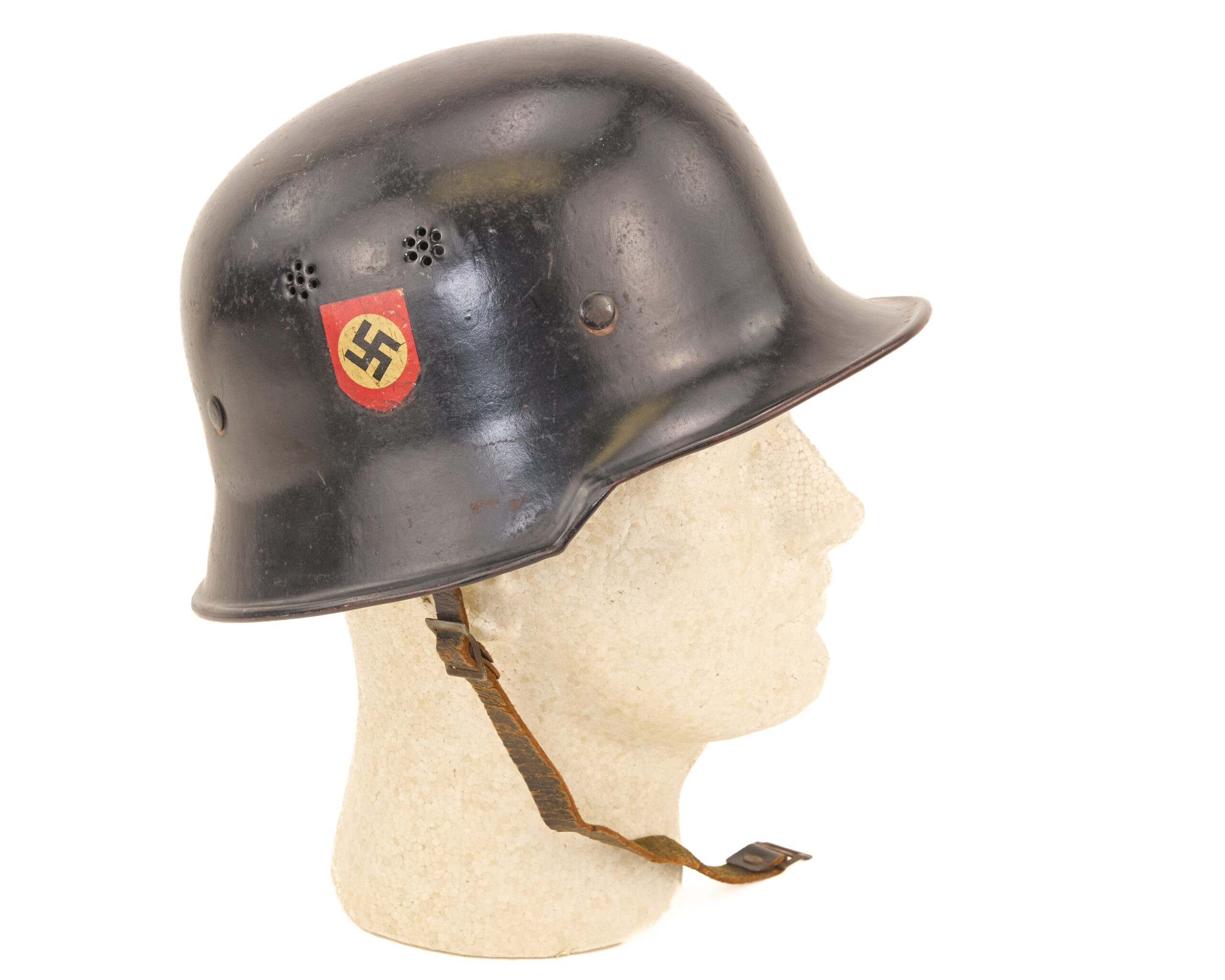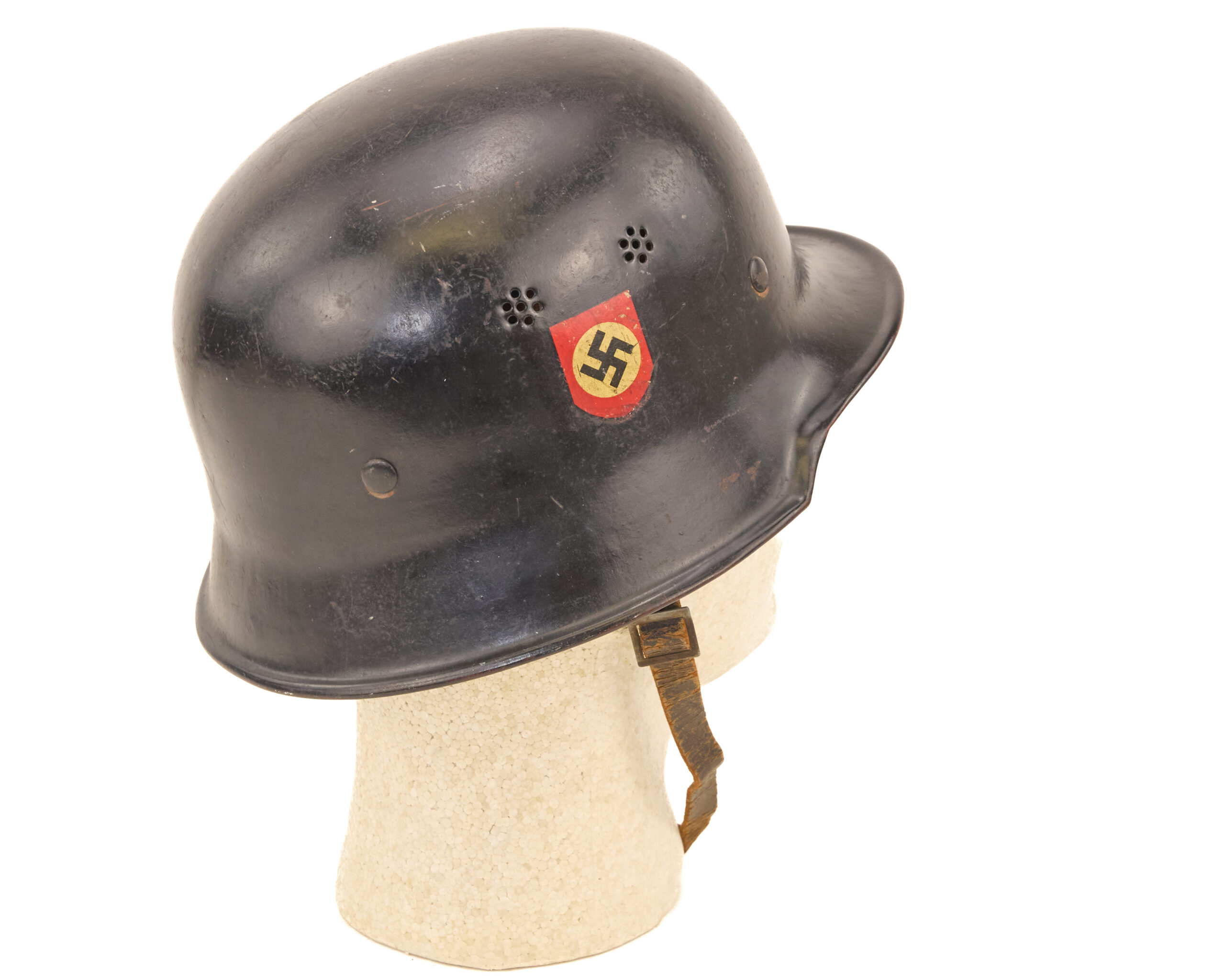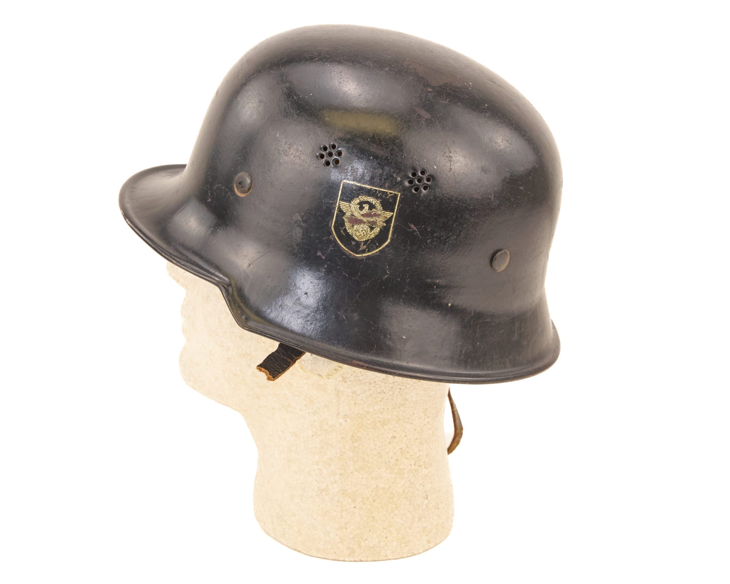 The M34 helmet belongs to the family of German civic, police, and auxiliary service helmets that ran alongside the more familiar combat steel helmets of the period. In fire police use, these helmets served the Feuerschutzpolizei, the fire protection police branch that combined firefighting and emergency service functions within the broader wartime police structure. That role gives these helmets a different historical feel from front-line military pieces. They represent the internal service and civil defense side of the German wartime system rather than battlefield use alone.