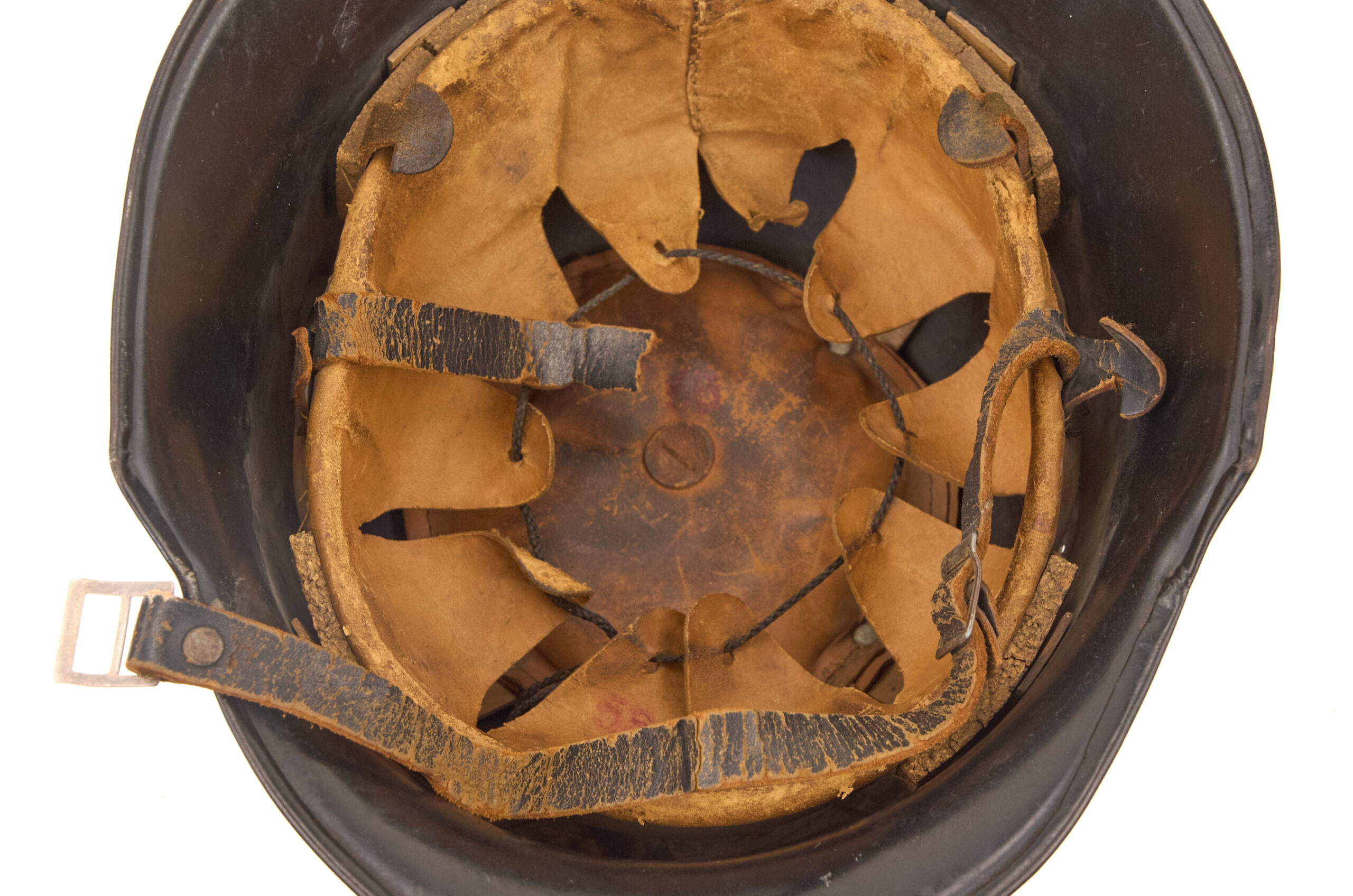 The M34 pattern is closely tied to German civic and police service branches of the period, and fire police helmets are among the more distinctive variants because of their branch use and double decal presentation. This example stands out for its strong overall preservation. The black paint remains in great condition, the liner is complete and very good, and the chin strap is still present. The gold decal shows three small areas of paint loss, but both decals remain intact and display well.