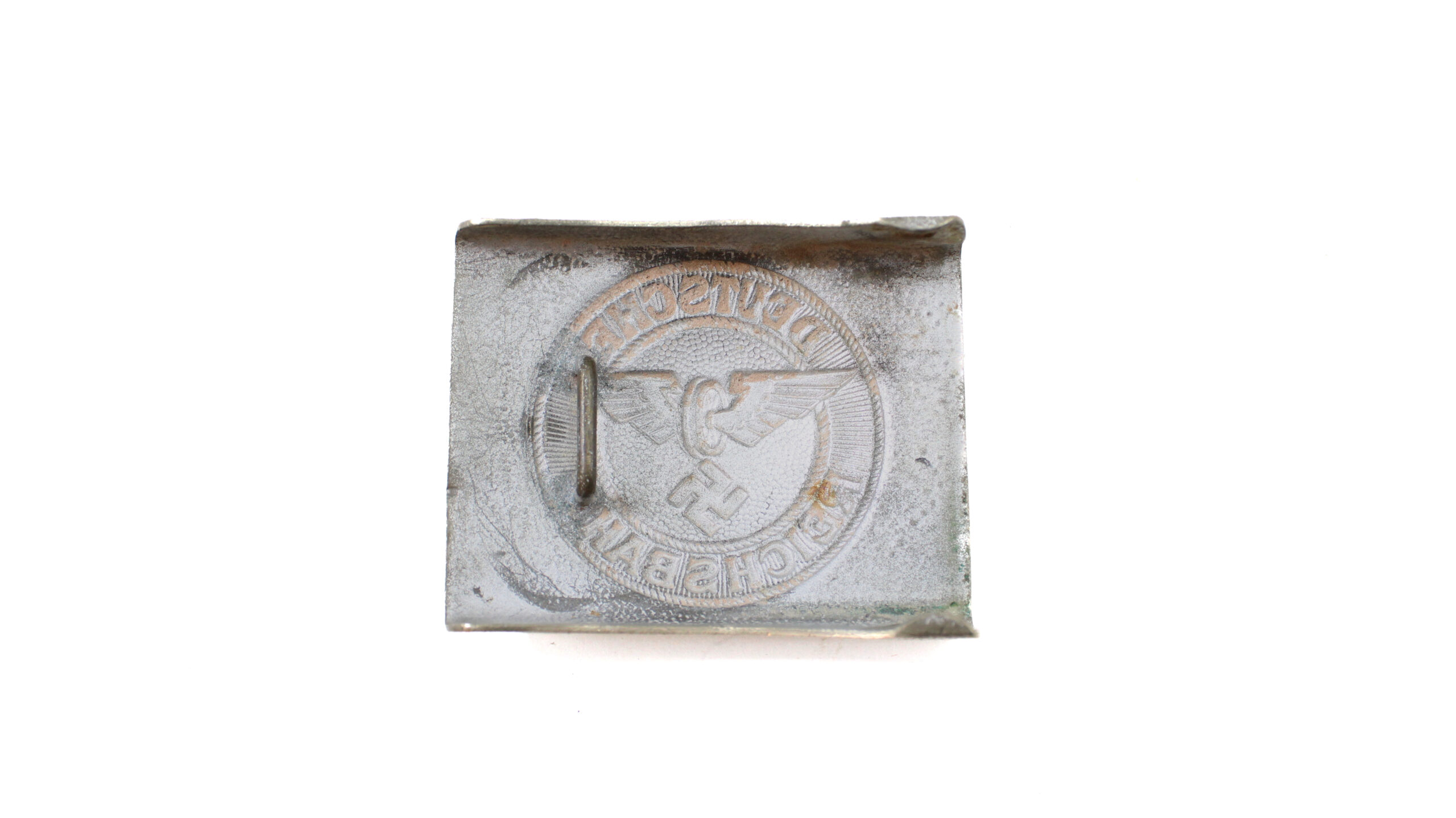 This is an original WWII German Reichsbahn Bahnschutzpolizei (Railway Protection Police) official’s belt buckle. The Bahnschutzpolizei were tasked with protecting the German state railways, stations, and strategic rail lines, making their insignia and equipment distinct within the broader policing structure of the Third Reich.