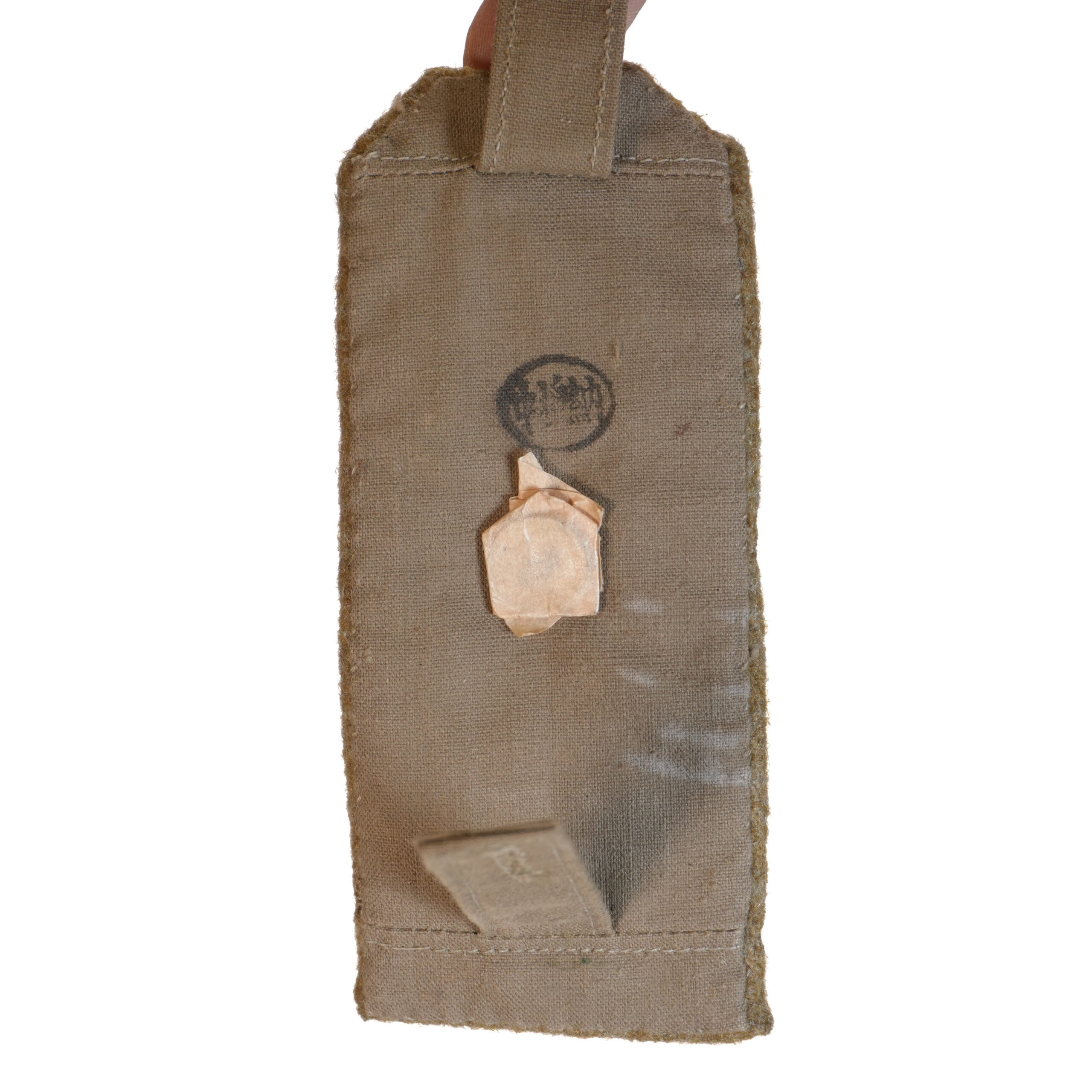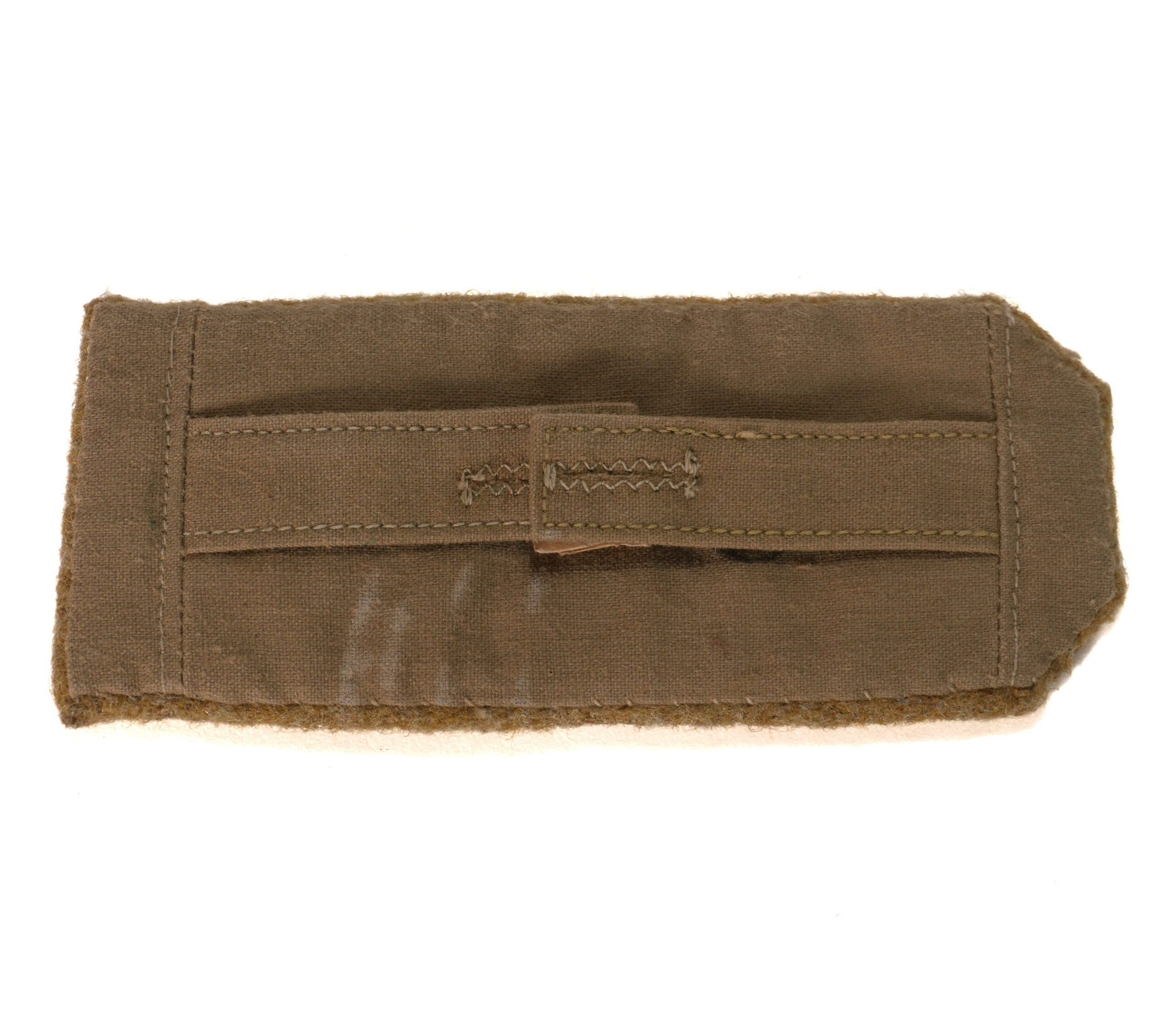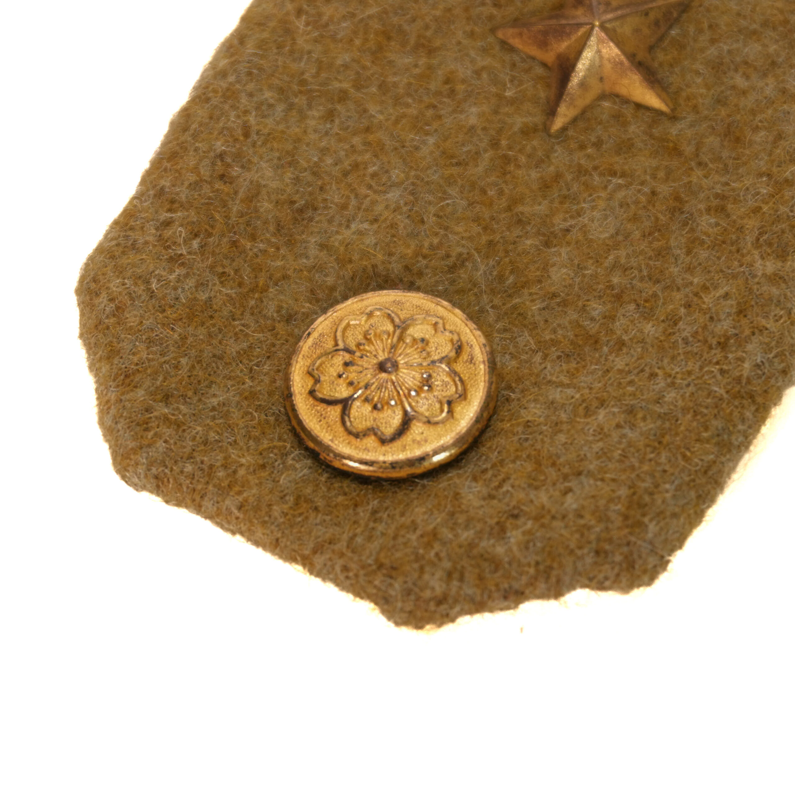 This is an original matched pair of Imperial Japanese Army officer’s shoulder boards, worn by an officer with the rank of Captain (大尉, Taii) during World War II. These epaulettes are constructed from field-grade olive drab wool, with two gilt rank stars affixed to each board, along with the correct chrysanthemum-pattern attachment stud at the lower end—a clear symbol of IJA officer status.