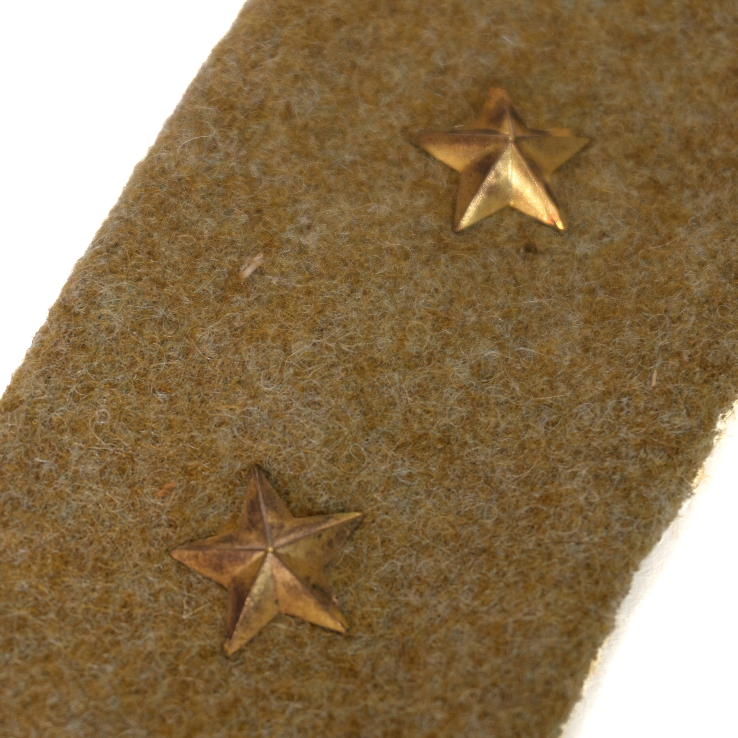 The wool body is clean, tightly woven, and well-preserved with minimal fading. The stars are original brass fixtures with crisp five-point detailing, and both boards match in construction, tone, and hardware. The underside of one board retains a factory-issued canvas tab, complete with a bold ink-stamped kanji arsenal marking—a detail highly sought after by collectors of authentic Japanese militaria.