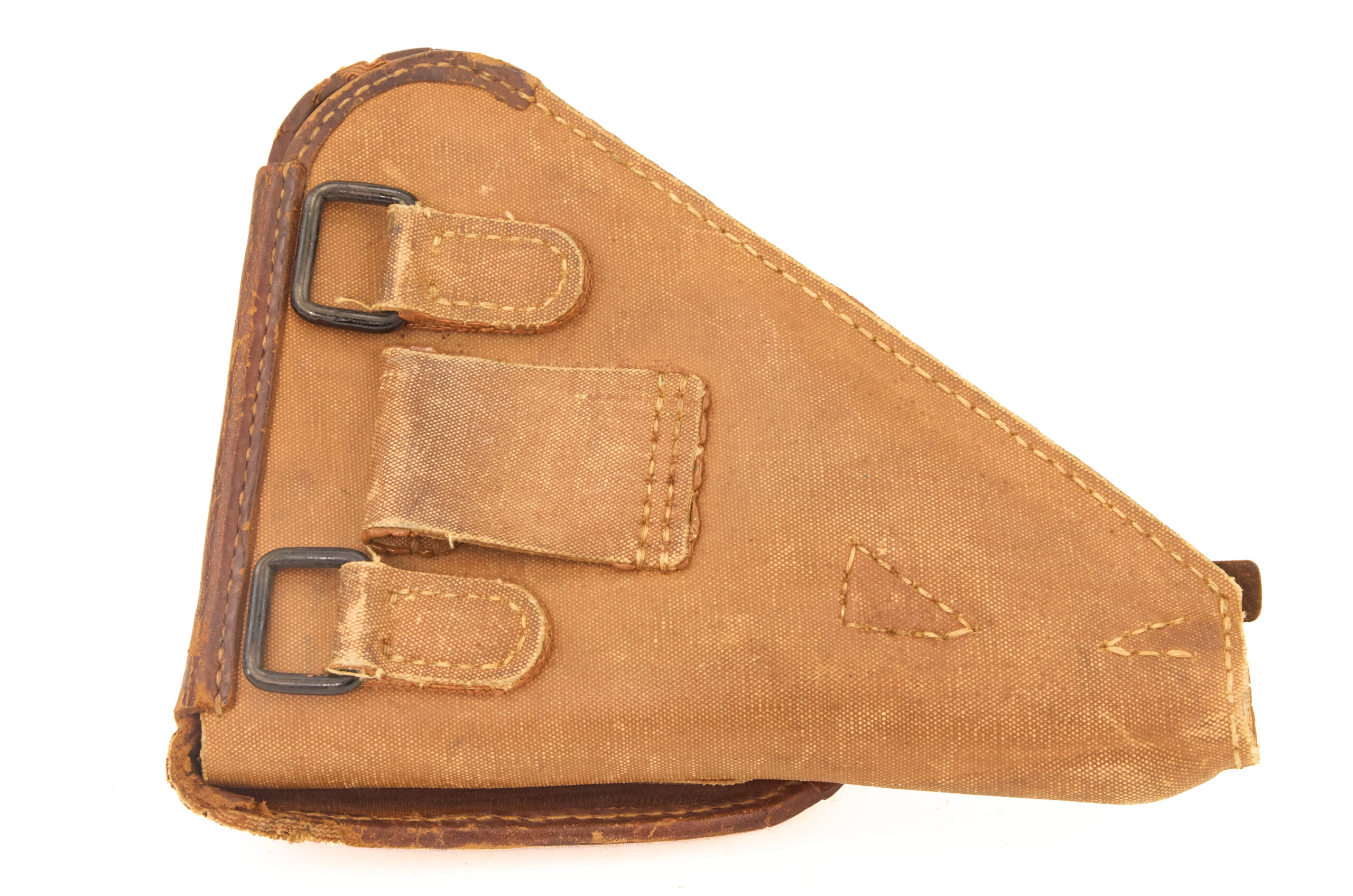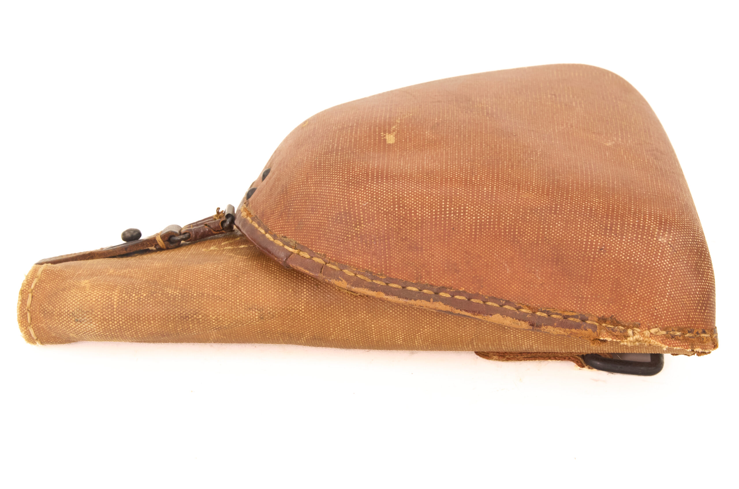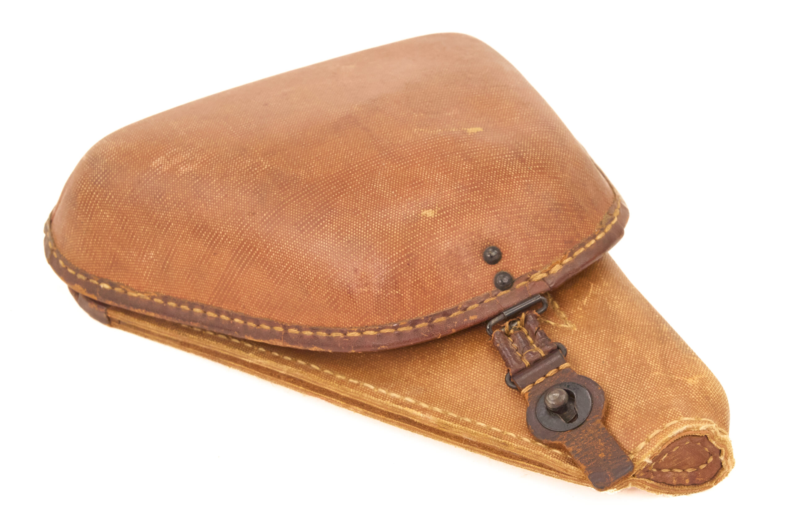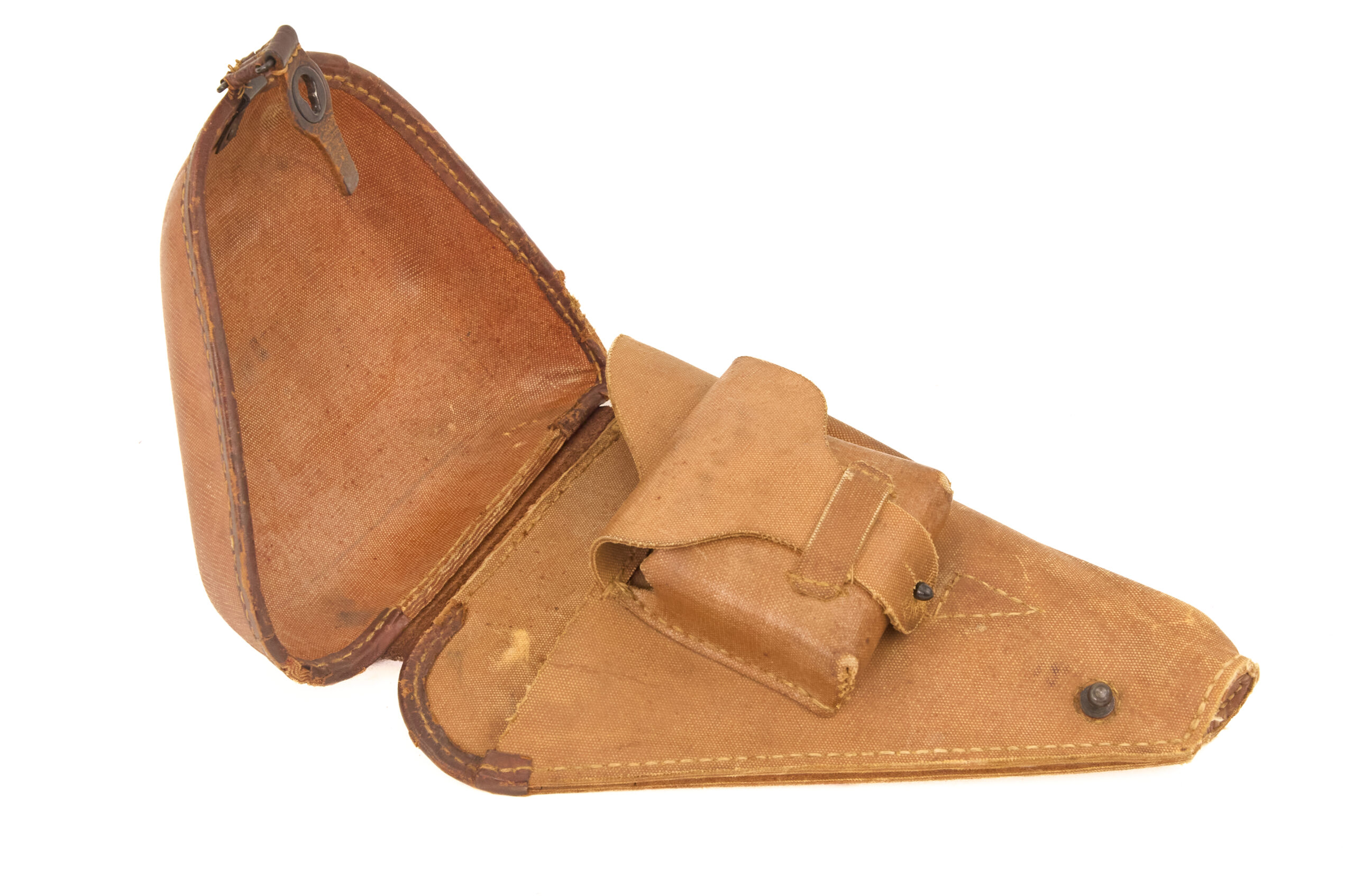 This holster uses a canvas shell, main body, and belt loop, with leather retained at the edging, hinge, and base. That combination creates the familiar late-war mixed-material pattern associated with the Type 14 Nambu. The form remains practical and distinctly Japanese, with a flap cover to protect the pistol and a pocket under the shell for a spare magazine or accessory. The canvas body gives the holster a different character from earlier full-leather examples, while the leather reinforcement at stress points preserves structure where it mattered most.