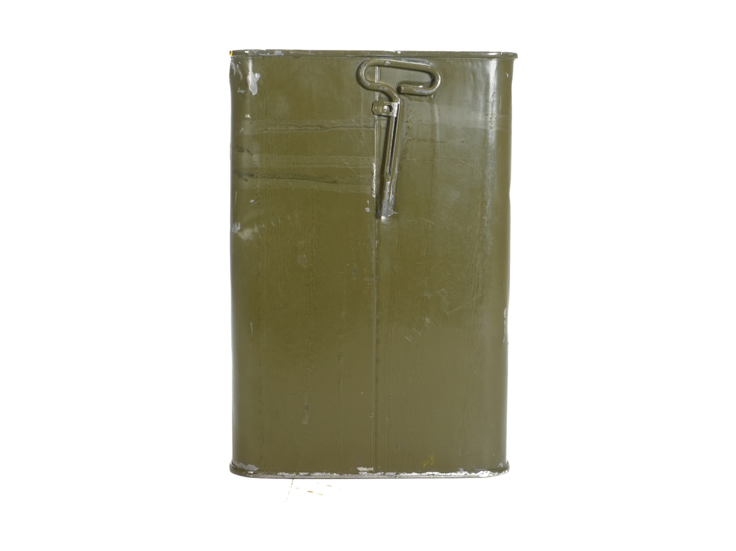 One end of the can features the built-in carry handle for transport, while the opposite end retains the original ammunition can opener tool affixed to the body—an increasingly uncommon survival feature. The bottom is stenciled “UNFIT FOOD CONTAINER”, a wartime safety requirement to prevent postwar civilian misuse.