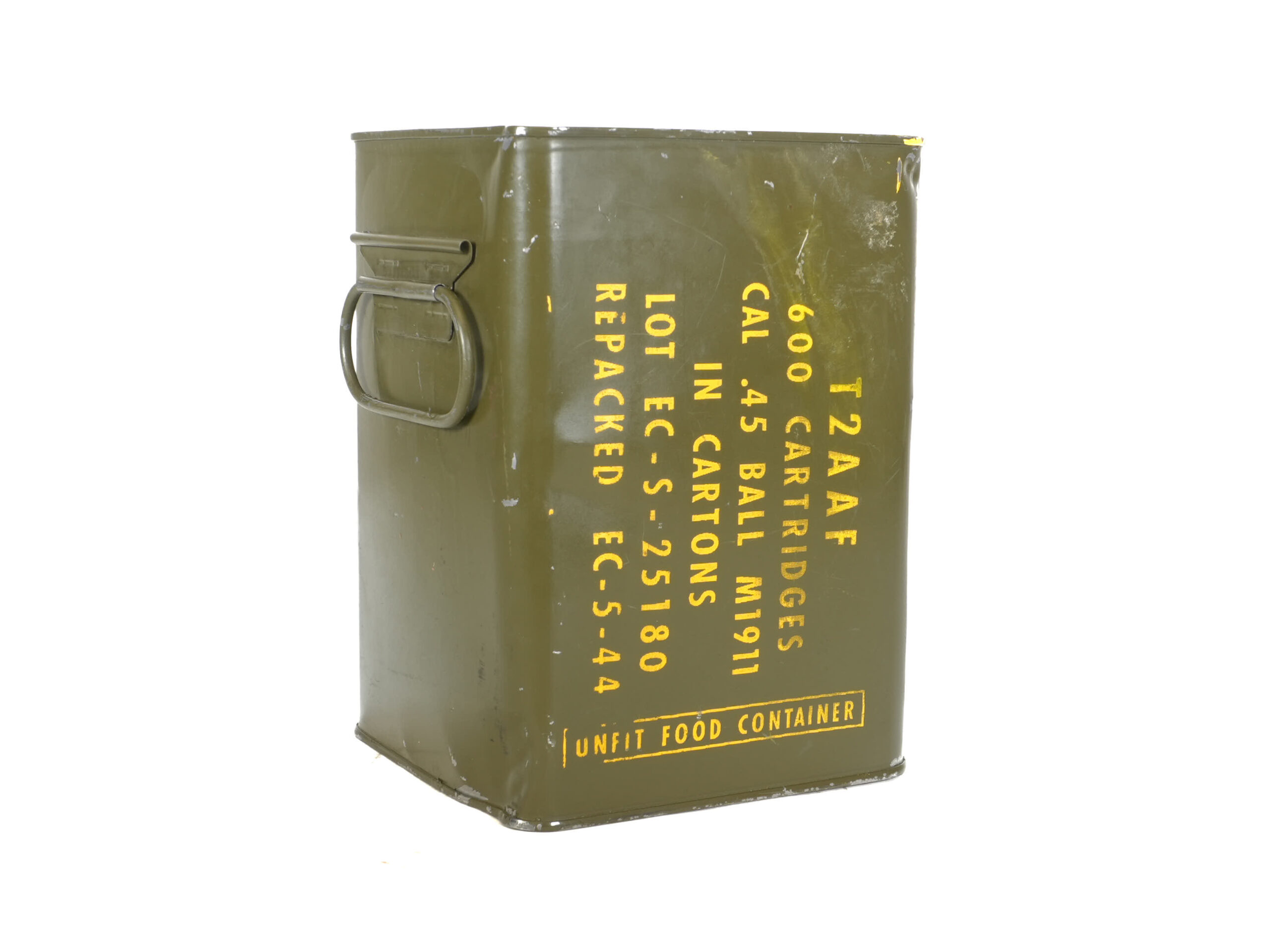 This .45 ACP ball ammunition was the standard U.S. military load for the Colt M1911 and M1911A1 pistols, as well as the M1928/M1 Thompson and M3 “Grease Gun” submachine guns. During the war, Evansville Chrysler was one of the largest U.S. ammunition producers, supplying billions of rounds to the Allied war effort. Repack cans like this were assembled from earlier production lots, inspected, and sealed for long-term storage and distribution to overseas theaters.